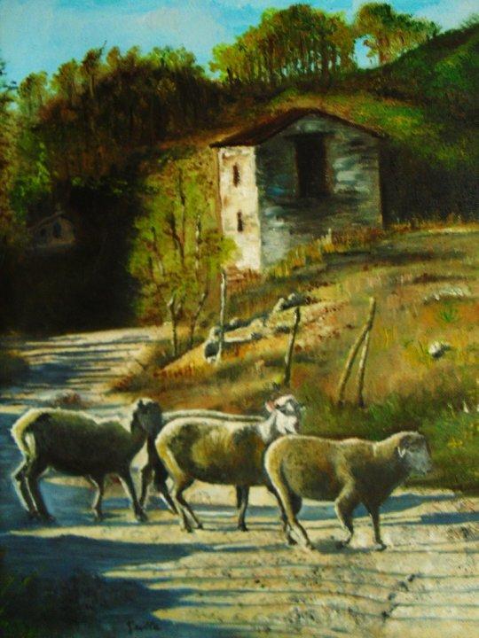 PAESAGGIO CON SENTIERO DI CAMPAGNA E ATTRAVERSAMENTO DI UN GREGGE DI PEVORE CHE RITORNANO ALL'OVILE