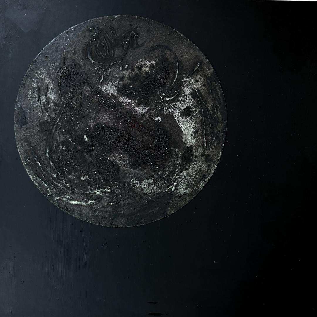 L'opera "Luna e Terra", un tondo su tavola colorata in acrilico nero, fa parte del ciclo "Lune, satelliti e crateri". Questa creazione artistica esplora il legame tra la Terra e il suo satellite naturale, utilizzando una palette di colori che include marrone ocra e bianco. La composizione è caratterizzata da una disposizione decentrata all'interno di uno spazio quadrato, enfatizzando il contrasto tra il soggetto e lo sfondo scuro. L'opera invita a riflettere sulla connessione profonda tra il nostro pianeta e la luna, evocando un senso di armonia e interazione cosmica.