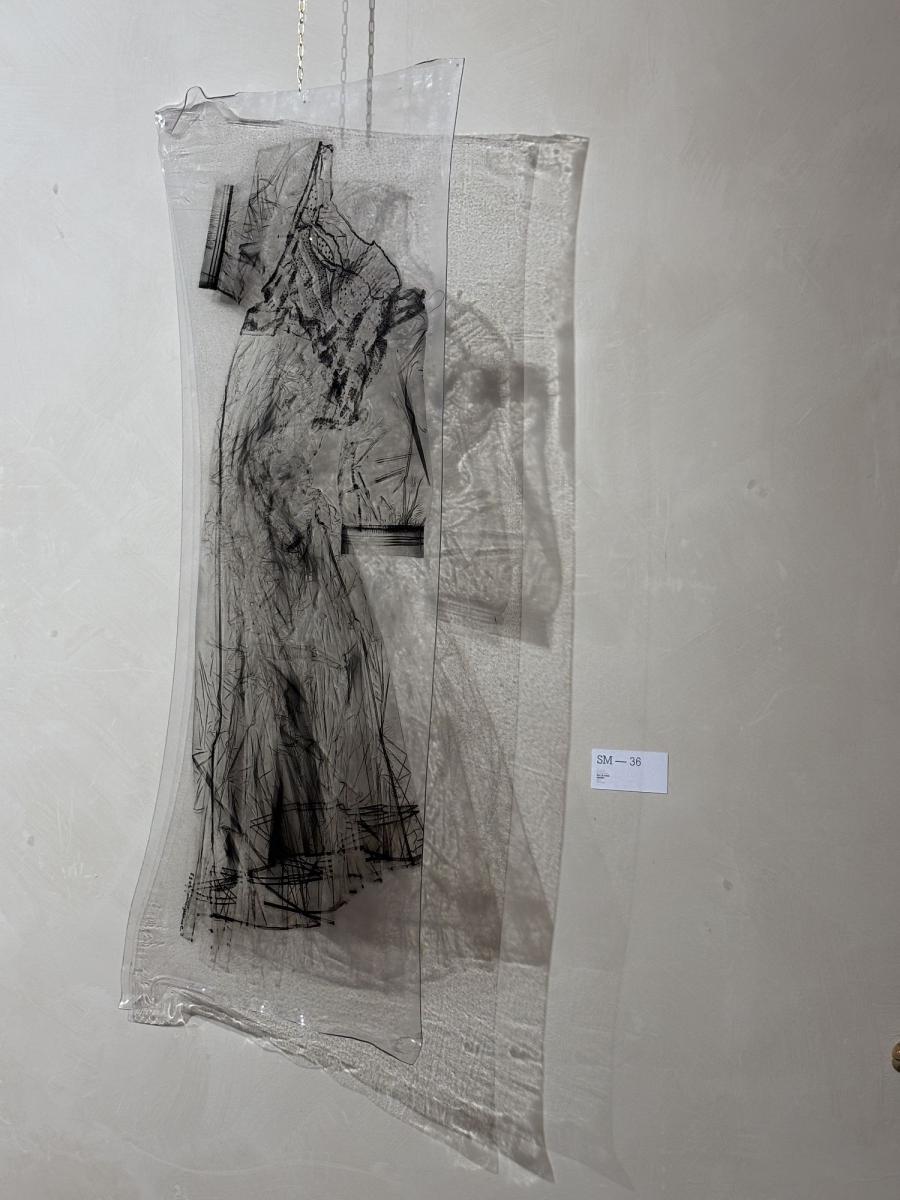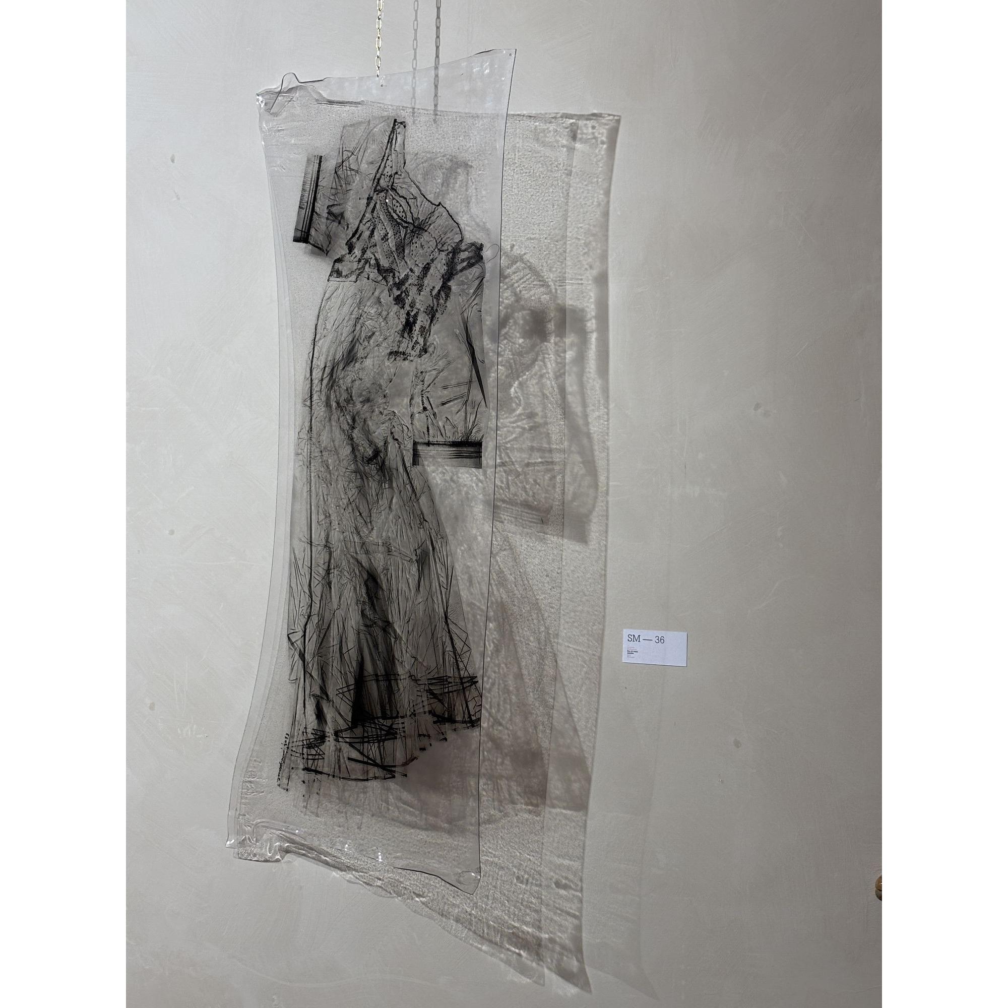 In "L'impronta che hai lasciato" (2023), il metacrilato trasparente cattura il ricordo di un abito, che muta in un'ombra grafica sulla parete. Le dimensioni (125x54x0,5 cm) amplificano la presenza-assenza, evocando la labilità della memoria e del corpo.
