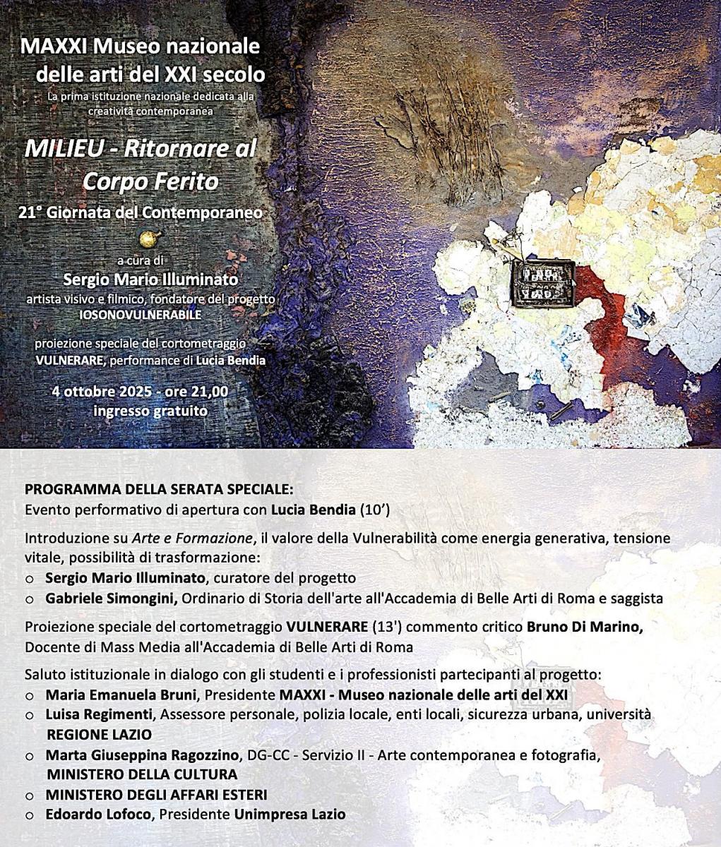 Sabato 4 ottobre 2025, il MAXXI – Museo nazionale delle arti del XXI secolo di Roma ospiterà MILIEU – Ritornare al corpo ferito, evento speciale inserito nella XXI Giornata del Contemporaneo, promossa da AMACI per valorizzare l’arte contemporanea italiana e diffonderne la conoscenza a livello nazionale e internazionale.