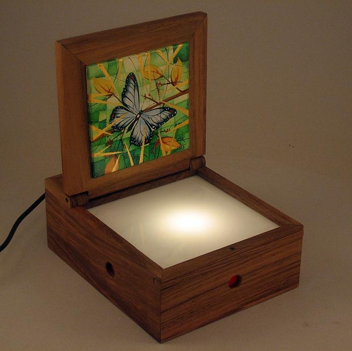 Ideale per la notte con luce debole a coperchio aperto, mentre spia notturna con coperchio chiuso, decorata con due immagini aventi lo stesso disegno ma colori differenti, la tecnica è ad acquerello variamente diluito e finiture in foglia d'oro 22Kt.