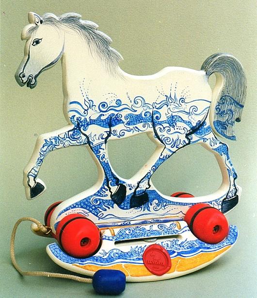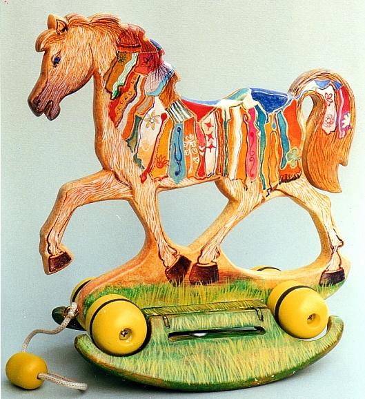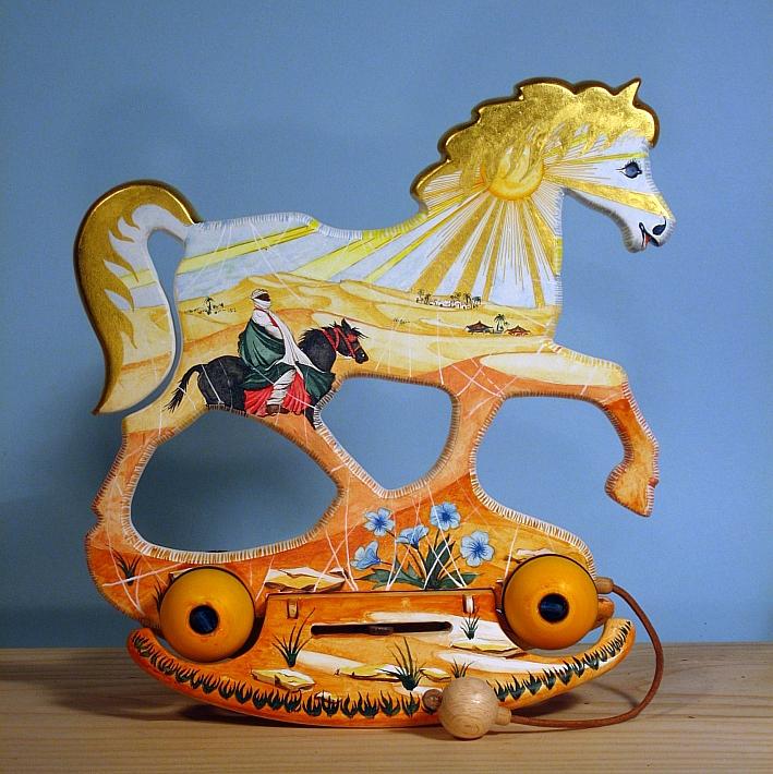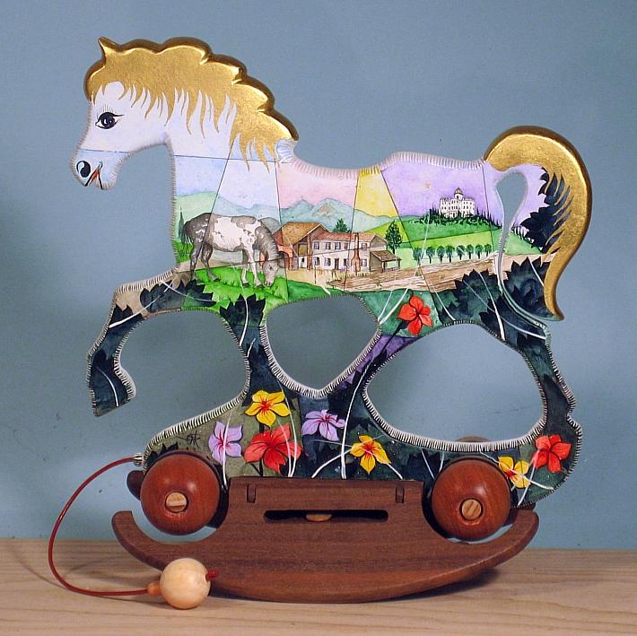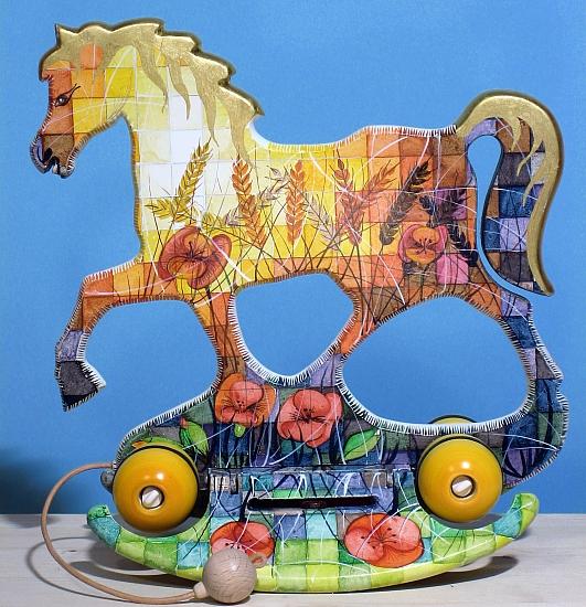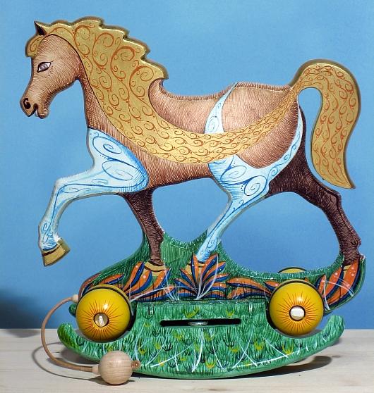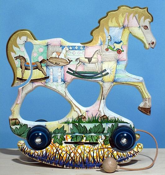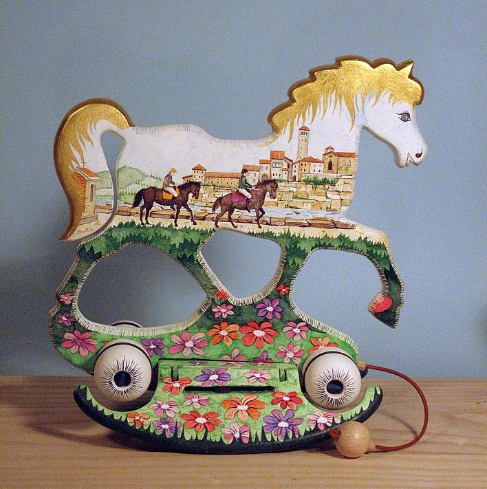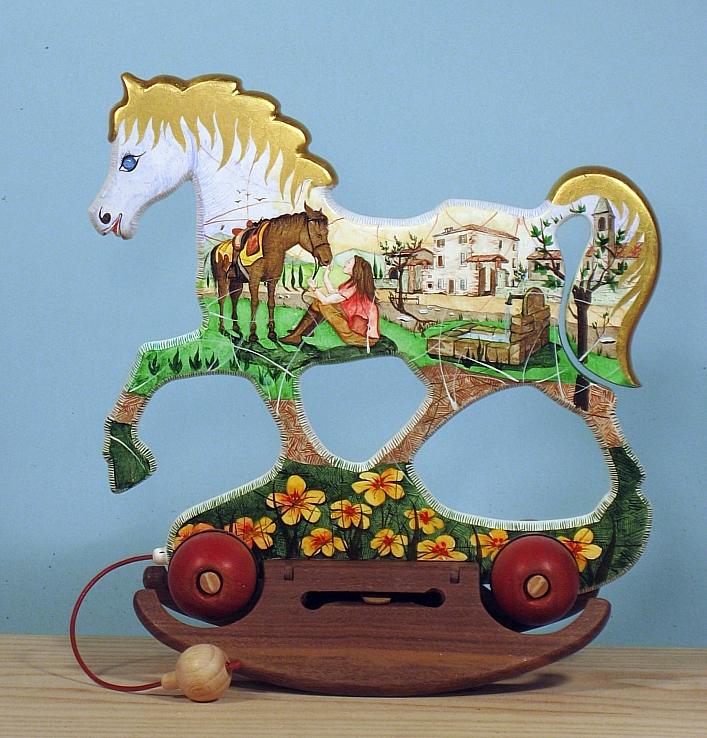 La collezione Dream raggruppa piccoli cavallini a dondolo che si trasformano in cavallini trainabili, la struttura viene realizzata a mano usando, per il corpo del cavallino legno mdf preparato alla pittura con un fondo bianco specifico,mentre la base a dondolo e le ruote vengono realizzatae con legni pregiati a vista, la decorazione sviluppa il tema " la natura, il paesaggio e il cavallo" ogni opera presenta l'interpretazione del tema in modo originale e unico, essa viene organizzata con due scene differenti una per lato, la criniera e la coda a lavoro terminato vengono rifinite con foglia d'oro di ventidue carati ; ogni opera viene siglata dell'artista, essa viene accompagnata da un certificato di autenticità con anno di esecuzione, foto, numero di catalogo, dimensioni e firma dell'artista.