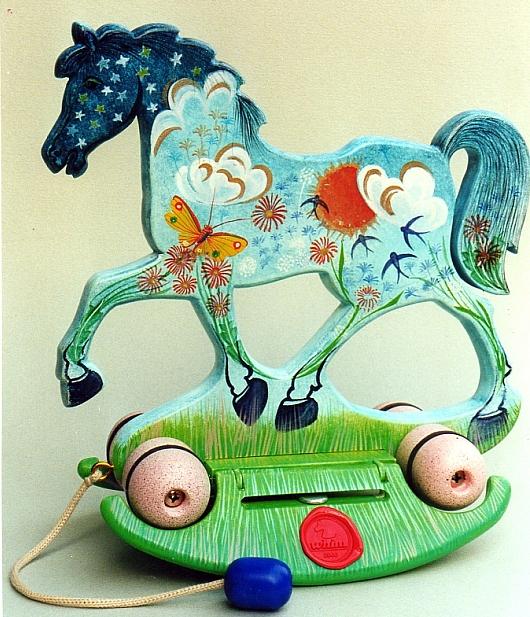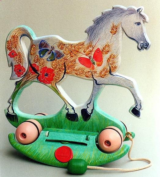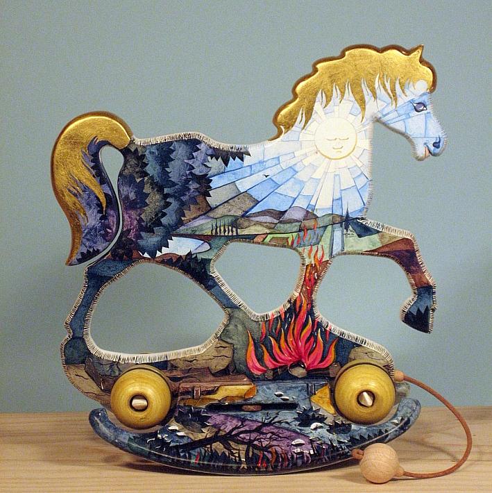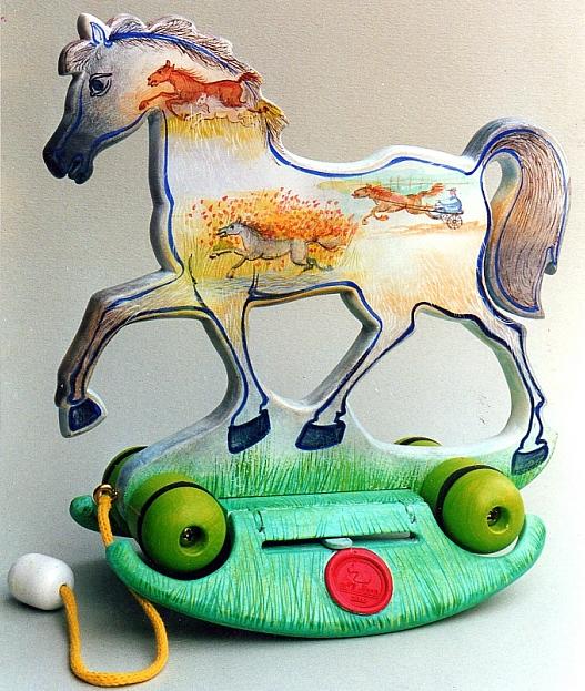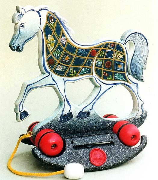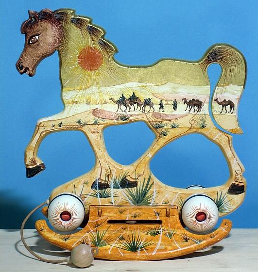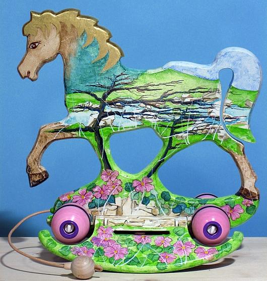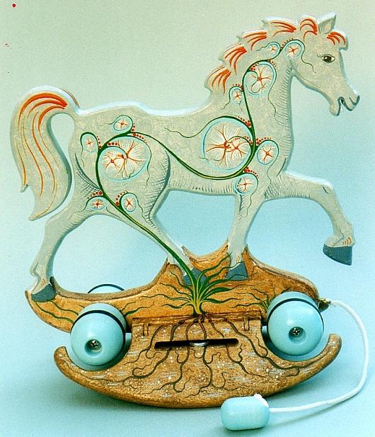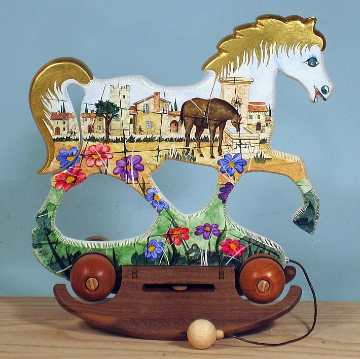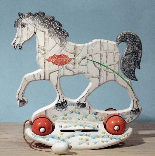 La collezione Dream raggruppa piccoli cavallini a dondolo che si trasformano in cavallini trainabili, la struttura viene realizzata a mano usando, per il corpo del cavallino legno mdf preparato alla pittura con un fondo bianco specifico,mentre la base a dondolo e le ruote vengono realizzatae con legni pregiati a vista, la decorazione sviluppa il tema " la natura, il paesaggio e il cavallo" ogni opera presenta l'interpretazione del tema in modo originale e unico, essa viene organizzata con due scene differenti una per lato, la criniera e la coda a lavoro terminato vengono rifinite con foglia d'oro di ventidue carati ; ogni opera viene siglata dell'artista, essa viene accompagnata da un certificato di autenticità con anno di esecuzione, foto, numero di catalogo, dimensioni e firma dell'artista.