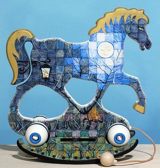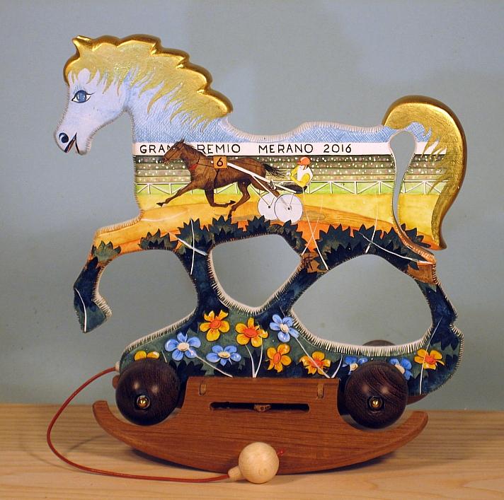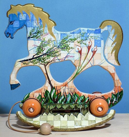 The Dream collection includes small rocking horses that are transformed into towable ponies, the structure is made by hand using, for the body of the mdf wood horse prepared for painting with a specific white background, while the rocking base and wheels are made with fine wood, the decoration develops the theme "nature, landscape and horse" each work presents the interpretation of the theme in an original and unique way, it is organized with two different scenes one on each side, the mane and the tail when finished, they are finished with twenty-two carat gold leaf; each work is signed by the artist, it is accompanied by a certificate of authenticity with year of execution, photo, catalog number, dimensions and signature of the artist.