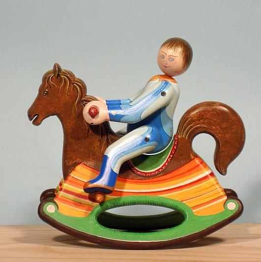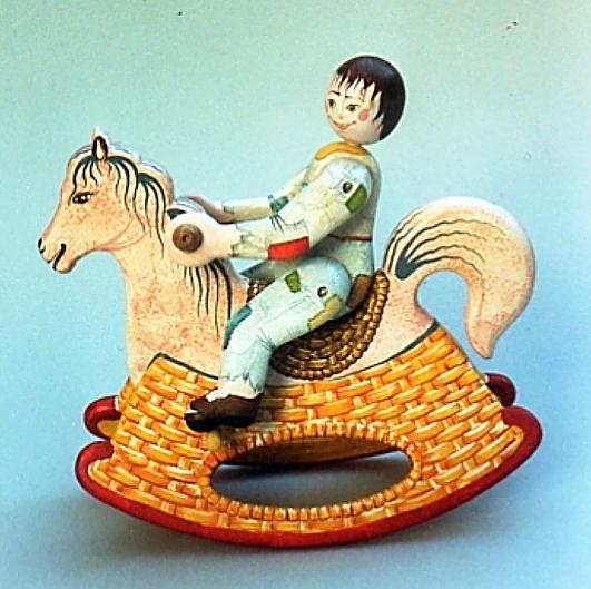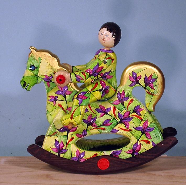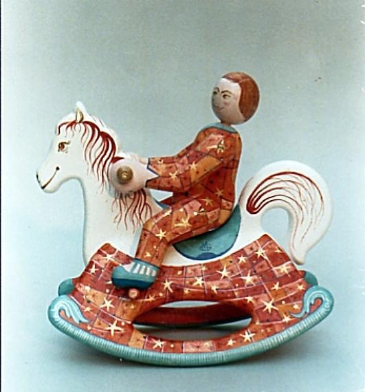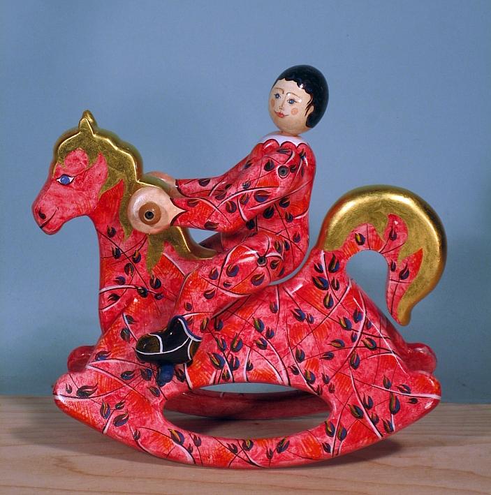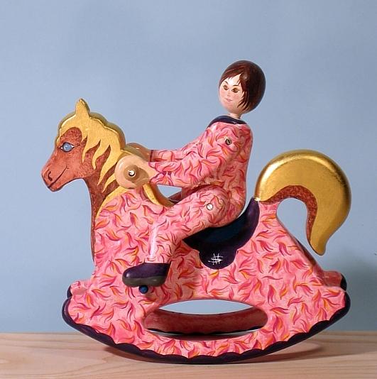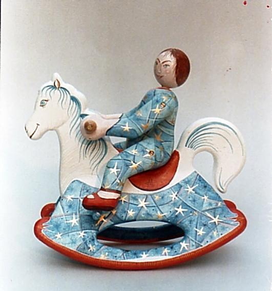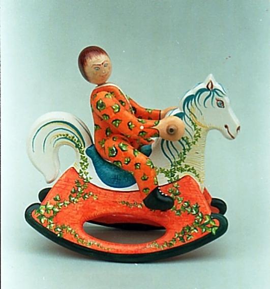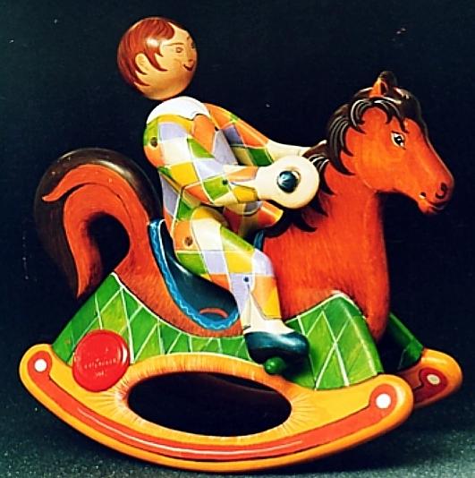 The ponies of the "ACROBAT" line are the interpretation of the child on his toy; the puppet is articulated, legs, arms and head can be rotated to make it assume various positions of balance in rocking.