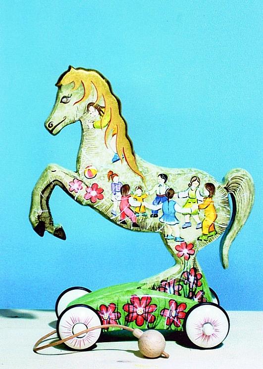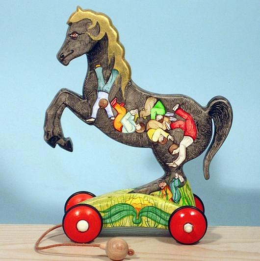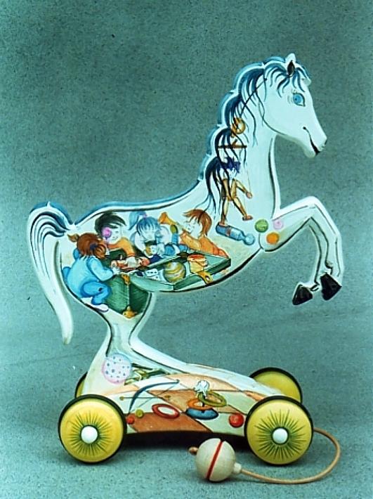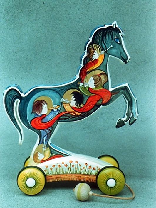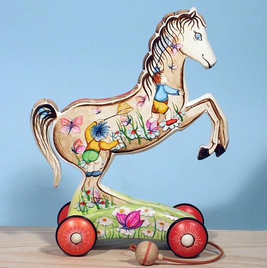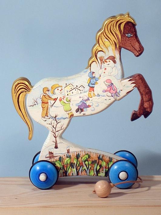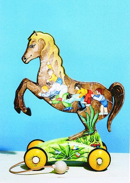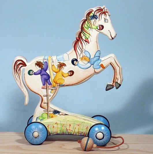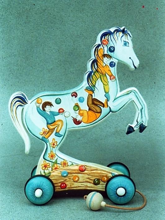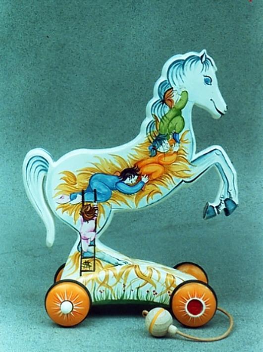 I cavallini della linea BAILO interpretano il cavallo che galoppa, trainandolo infatti, il cavallino accenna il movimento del galoppo.