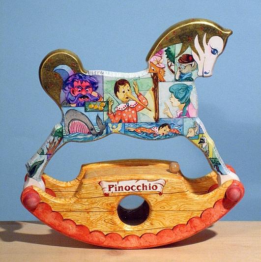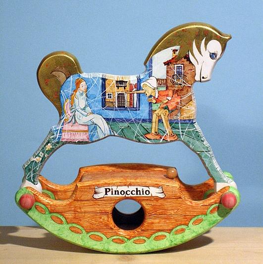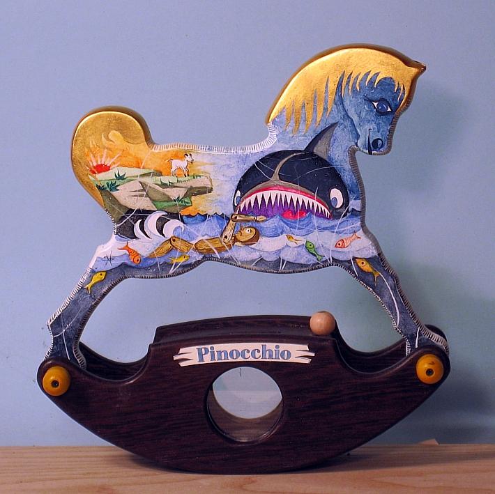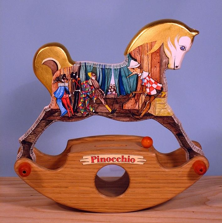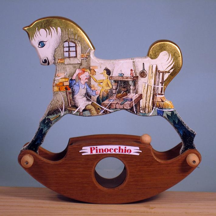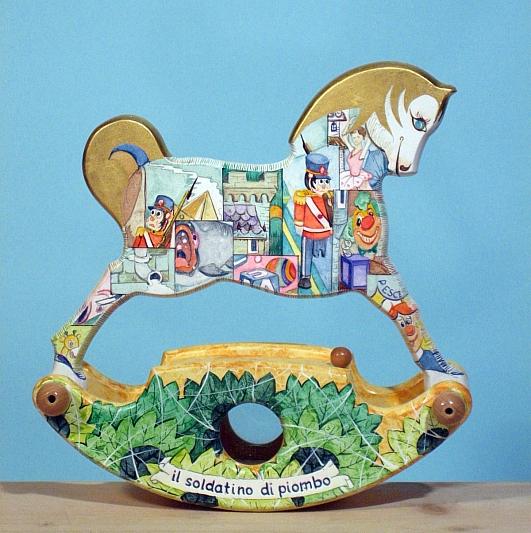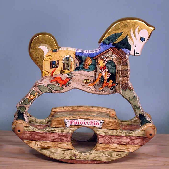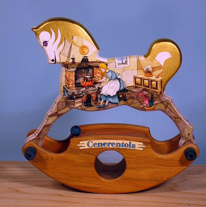 La collezione cosiddetta " Salvadanaio " rappresenta pezzi unici finemente lavorati con legni pregiati, il tema decorativo dedicato è,"le favole ", rappresentate con de immagini diverse una per lato, dipinte ad acquerello con criniera e coda ricoperte da foglia d'oro di ventidue carati ; Ogni opera è unica numerata , catalogata e siglata su un certificato di autenticità .