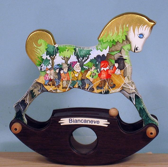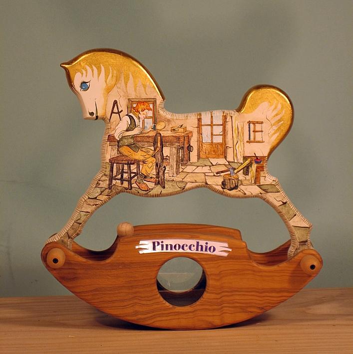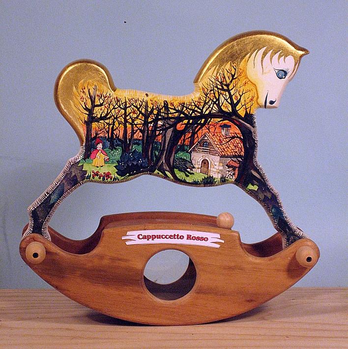 The so-called "Salvadanaio" collection represents unique pieces finely crafted with precious woods, the dedicated decorative theme is, "the fables", represented with different images one on each side, painted in watercolor with mane and tail covered with twenty-two gold leaf carats; Each work is unique numbered, cataloged and signed on a certificate of authenticity.