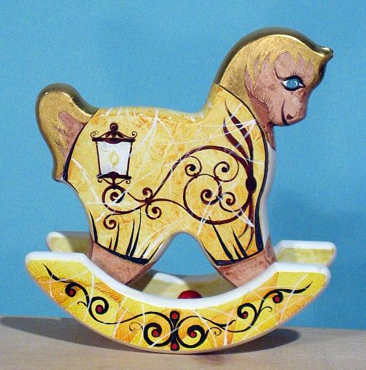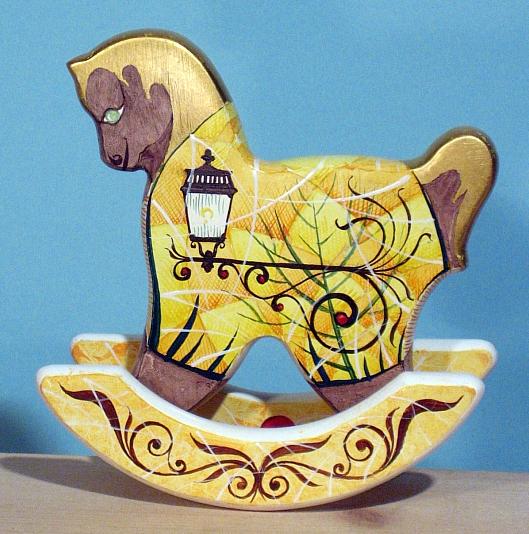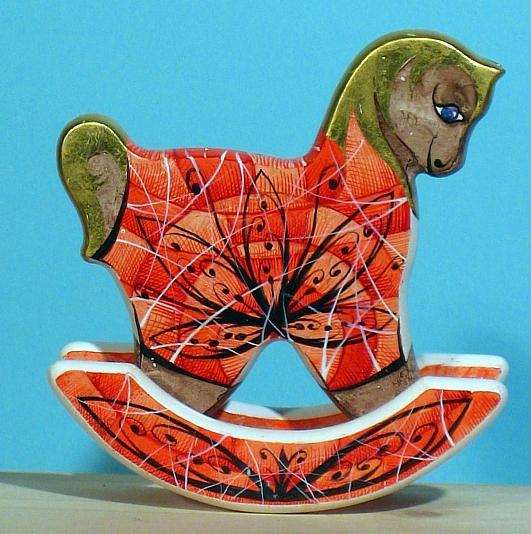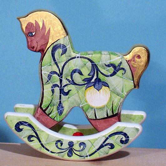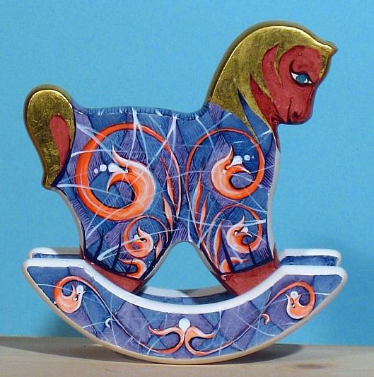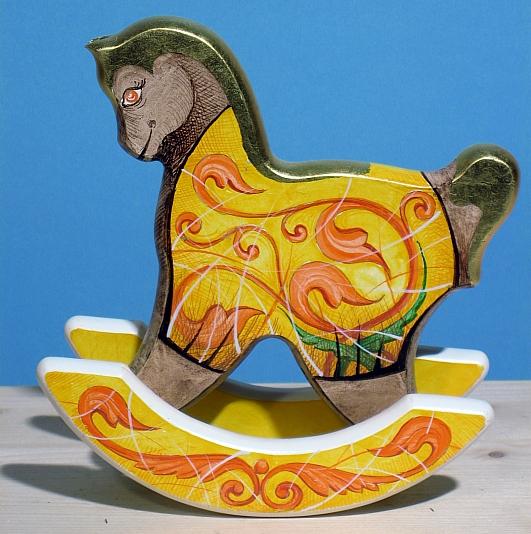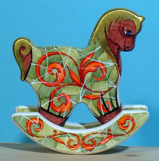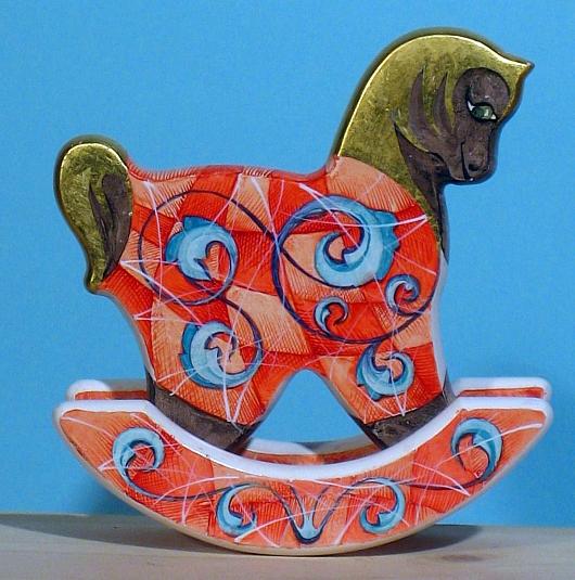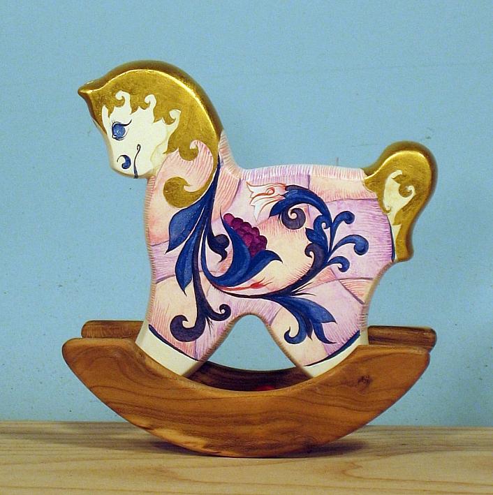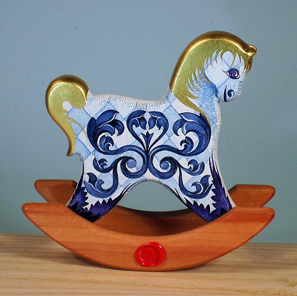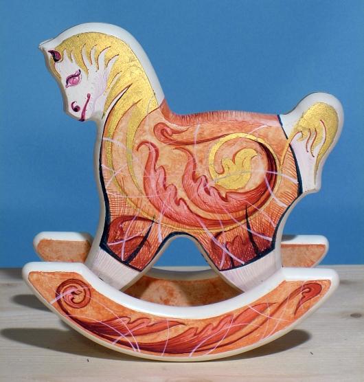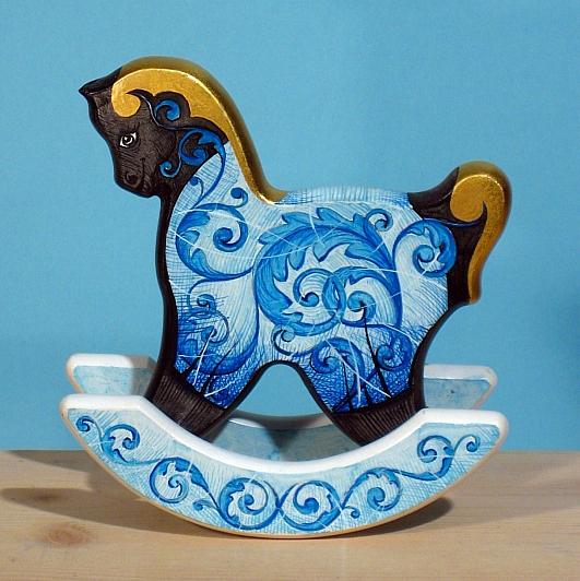 The ponies of the Ornato collection rest on rocking bascule in precious wood, the decorative theme is inspired by the decorations present on frescos, wrought iron gates, frames, inlays, furniture belonging to villas, palaces and ancient monuments, The graphic composition is the same on both the sides, but different is the chromatic composition enriched by the presence of fine finishes in gold leaf. The work is unique, numbered, cataloged and signed on a certificate of authenticity.