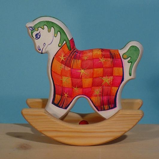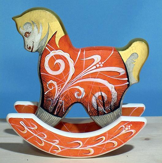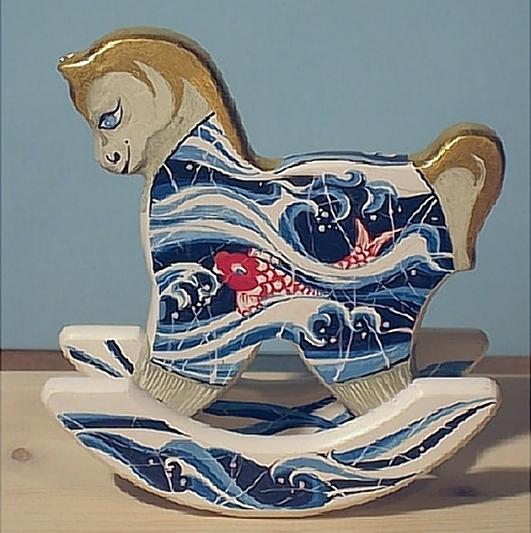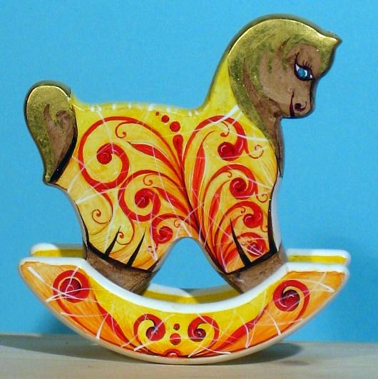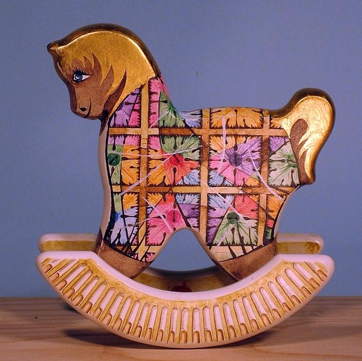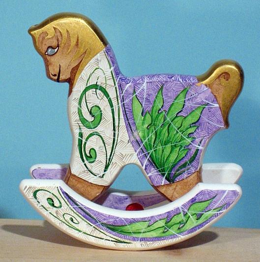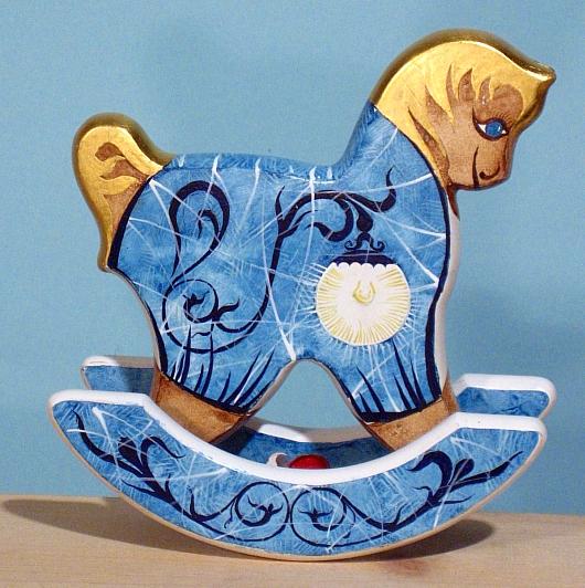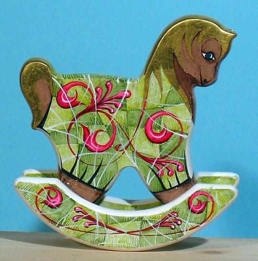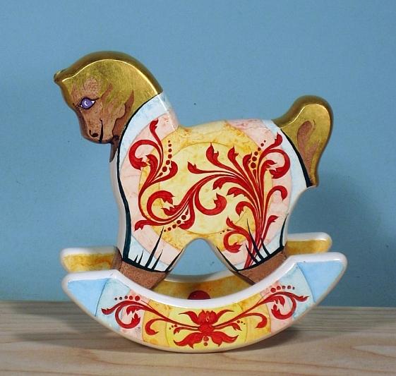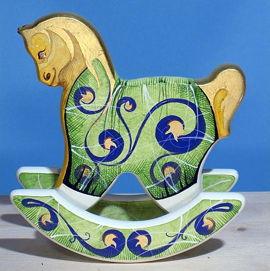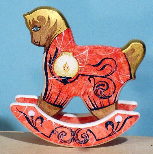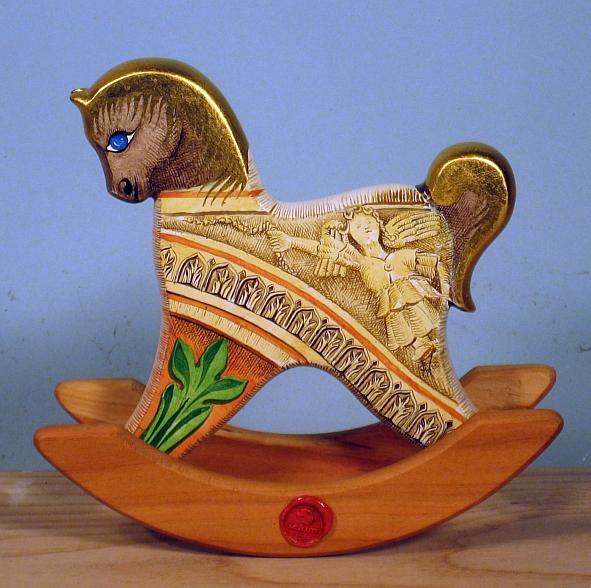 The ponies of the Ornato collection rest on rocking bascule in precious wood, the decorative theme is inspired by the decorations present on frescos, wrought iron gates, frames, inlays, furniture belonging to villas, palaces and ancient monuments, The graphic composition is the same on both the sides, but different is the chromatic composition enriched by the presence of fine finishes in gold leaf. The work is unique, numbered, cataloged and signed on a certificate of authenticity.