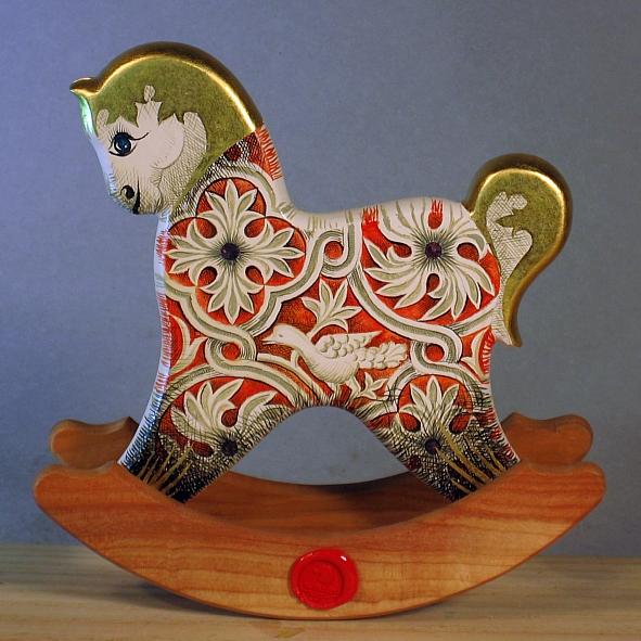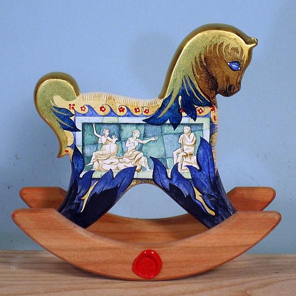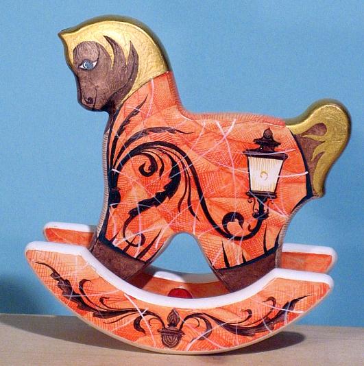 I cavallini della collezione Ornato poggiano su bascule dondolo in legno pregiato , il tema decorativo si ispira alle decorazioni presenti su affreschi , cancellate in ferro battuto , cornici , intarsi , mobili appartenenti a ville , palazzi e monumenti antichi, La composizione grafica è uguale su ambo i lati , ma differente è la composizione cromatica arricchita dalla presenza di pregiate finiture in foglia d'oro . L'opera é unica , numerata , catalogata e siglata su un certificato di autenticità .