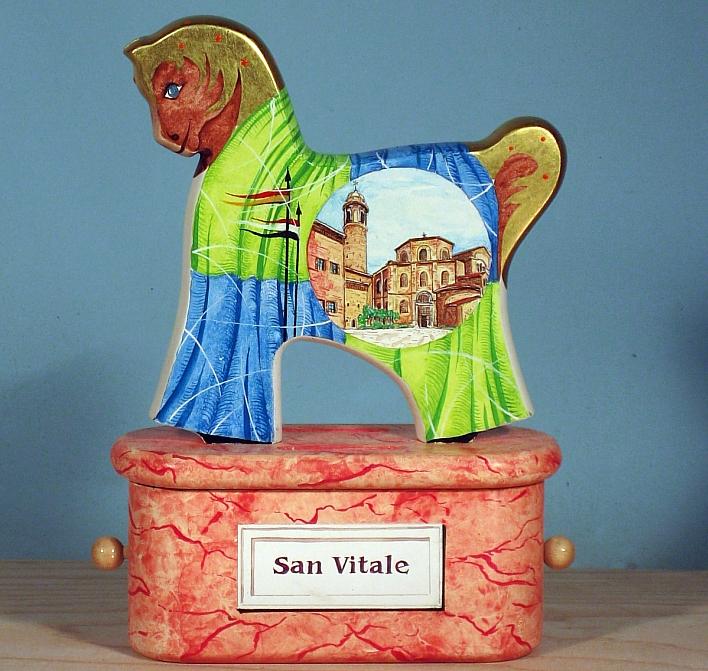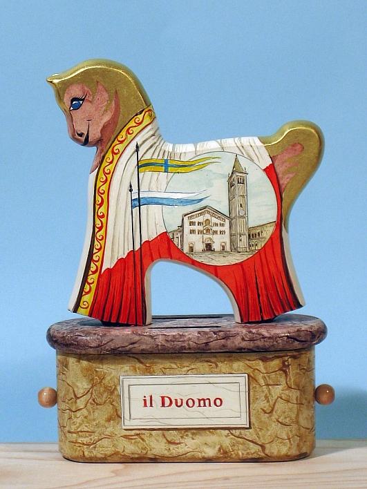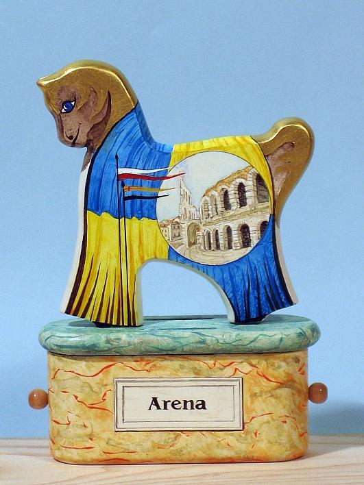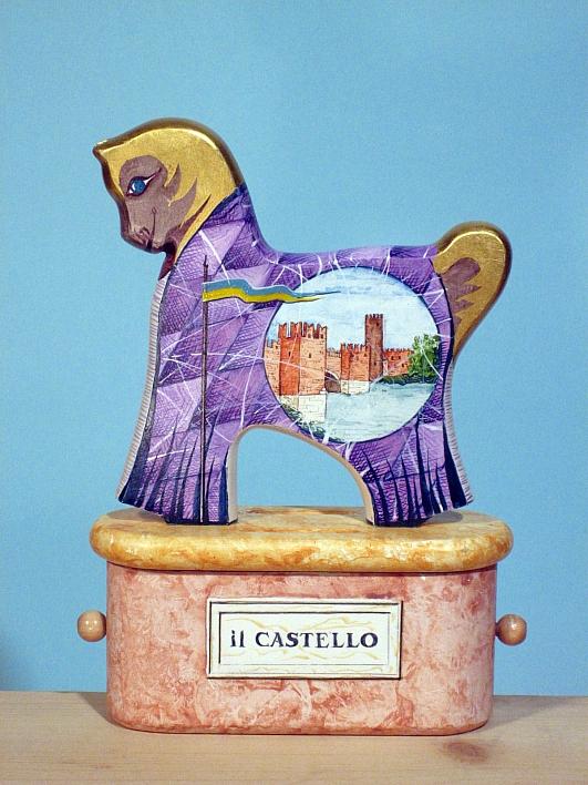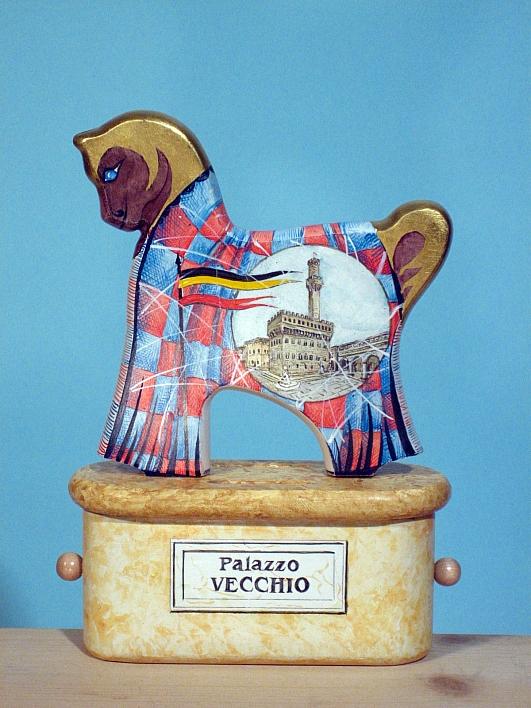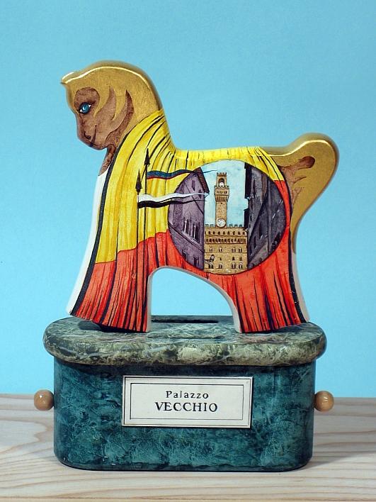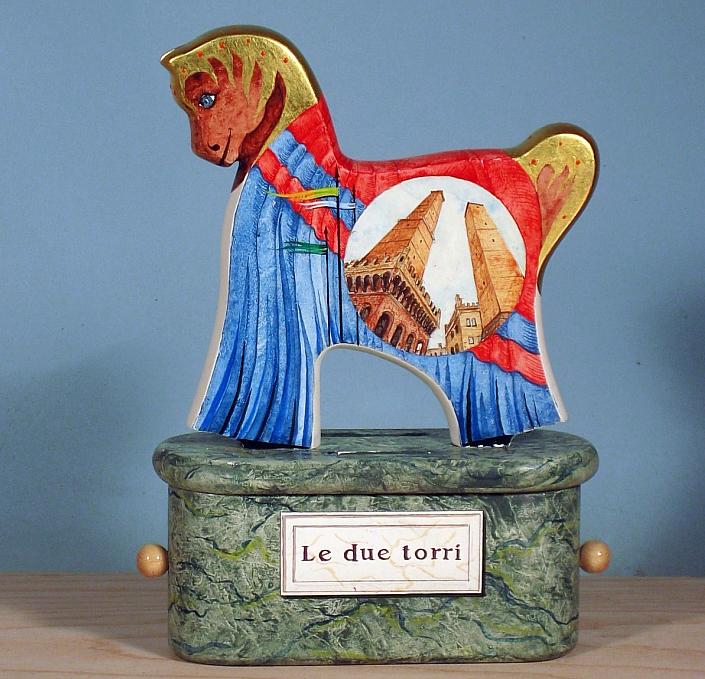 Linea Polis: dimensioni cm 16X22X6. La serie Baby Polis con dimensioni cm 14x19x5 termina con il numero di catalogo (2012-09), essa viene rinnovata cambiando il titolo in " POLIS ",con dimensioni maggiorate,cm 17X23X7. Sono dei slvadanaio, essi si ispirano al monumento equestre pressente in molte città, Il basamento serve da contenitore, mentre la superfice del cavallino viene usata per illustrare due immagini diverse, una per lato. Il tema decorativo dedicato alla linea è," monumenti e simboli delle città", la decorazione è sviluppata da un lato con la miniatura di un monumento presente nella città alla quale è dediccata l'opera, dall'altro lato con stemmi, vessilli e alabarde che completano un'opera dal sapore araldico medioevale. Per rendere l'opera unica, lo stesso monumennto o stemma che sia, non sarà mai ripetuto nella stessa forma compositivo-cromatica. N.B. l'opera può essere da voi richiesta personalizzandola con immagine e araldica del paese o città preferita, tempo di esecuzione 30 giorni. Polis line: dimensions 16X22X6 cm. The Baby Polis series with dimensions 14x19x5 cm ends with the catalog number (2012-09), it is renewed by changing the title to "POLIS", with oversize dimensions, 17X23X7 cm. They are slvadanaio, they are inspired by the pressing equestrian monument in many cities, The base serves as a container, while the surface of the pony is used to illustrate two different images, one on each side. The decorative theme dedicated to the line is, "monuments and symbols of the cities", the decoration is developed on one side with the miniature of a monument present in the city to which the work is dedicated, on the other side with coats of arms, banners and halberds that complete a work of medieval heraldic flavor. To make the work unique, the same monumennial or emblem, it will never be repeated in the same compositional-chromatic form. A personalized work may be requested by sending photos of a monument of the preferred city.