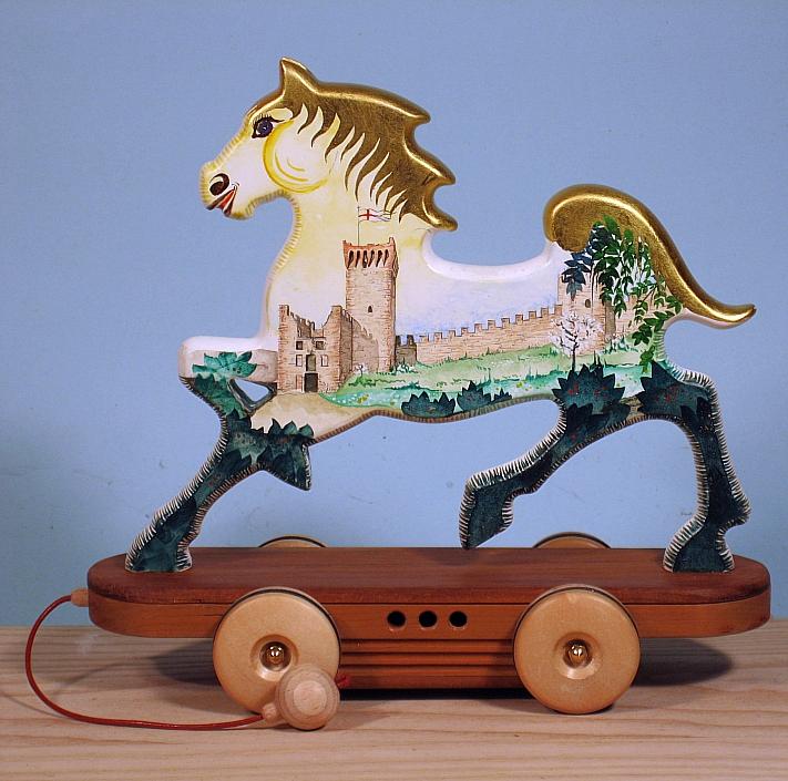The Sound collection includes towable horses, mounted on a fine wooden trolley that encloses a music box that works during movement; the decoration reproduces, in miniature, fortresses and castles of the Middle Ages, they are watercolors enriched with precious decorations in twenty-two-carat gold leaf, they are obviously customizable according to one's preferences. The work is unique, numbered, cataloged and signed on a certificate of authenticity.