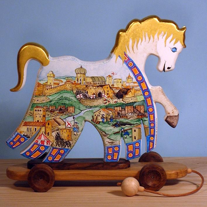 Sono cavallini con mantello da parata montati su un carrello in legno pregiato.