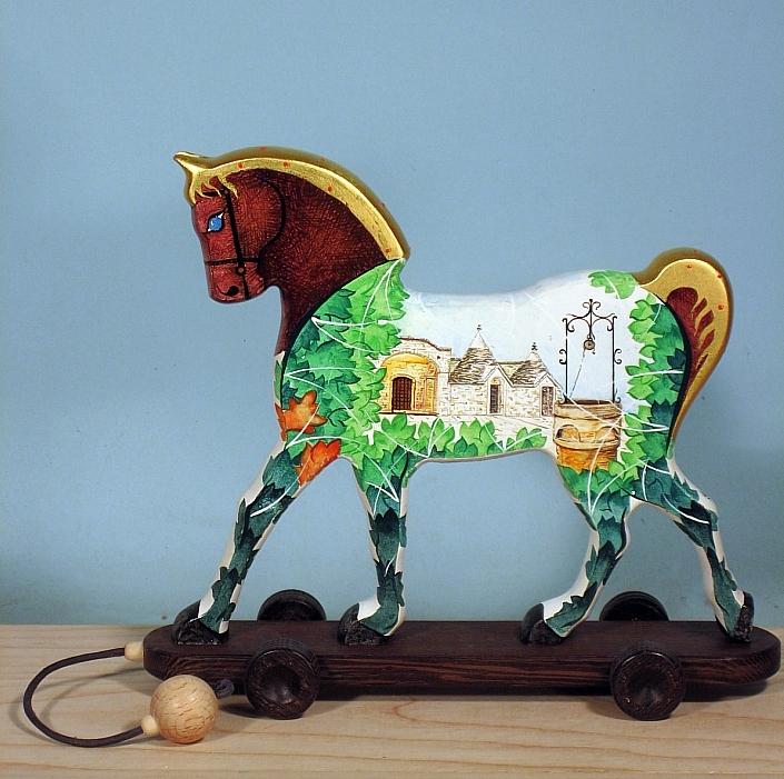 Il cavallino è decorato da un lato con l'immagine del rustico nel suo ambiente naturale, sul lato opposto viene presentato un attrezzo di uso comune con sullo sfondo un paesaggio delle nostre campagne.