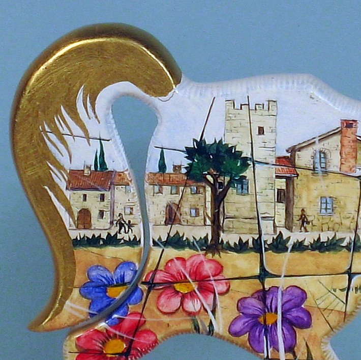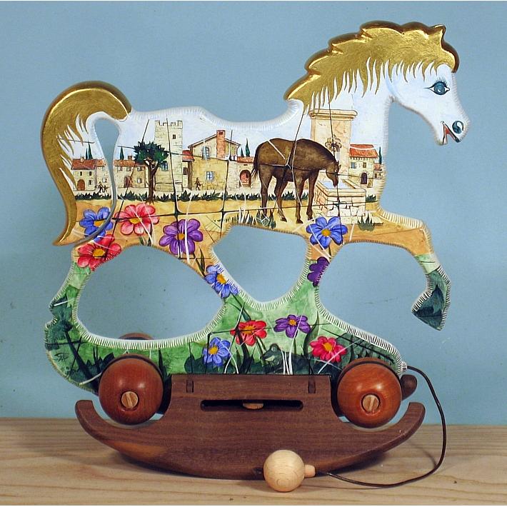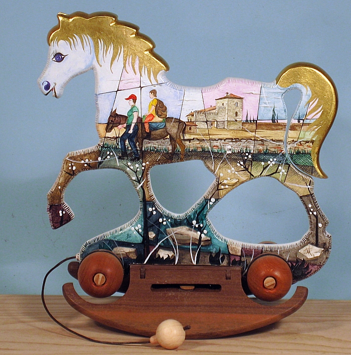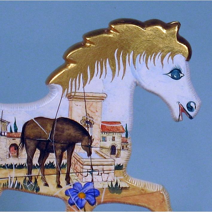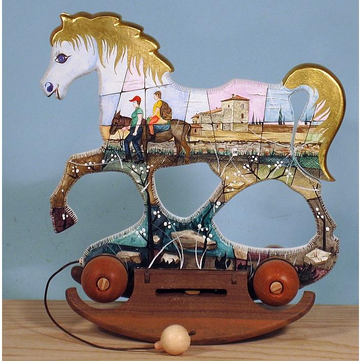 Giocattoli d'arte da collezione, realizzati con legni pregiati, dipinti ad acquerello variamente diluito e tampone con finiture in foglia d'oro 22Kt. Sono tutti pezzi unici, numerati e catalogati, forniti di certificato di produzione firmato dall'artista e sigillati con logo in cera lacca. Ideali per il collezionista, per un regalo di prestigio, per l'arredamento, opere rivolte a bambini e ragazzi come forma educativa per avvicinarli all'arte. Collectible art toys made of precious wood, painted with watercolor and swab with 22Kt gold leaf finishes. They are all unique pieces, numbered and cataloged, provided with a production certificate signed by the artist and sealed with lacquer wax logo. Ideal for the collector, for a prestigious gift, for furnishings, works directed at children and teens as an educational form to bring them closer to art.