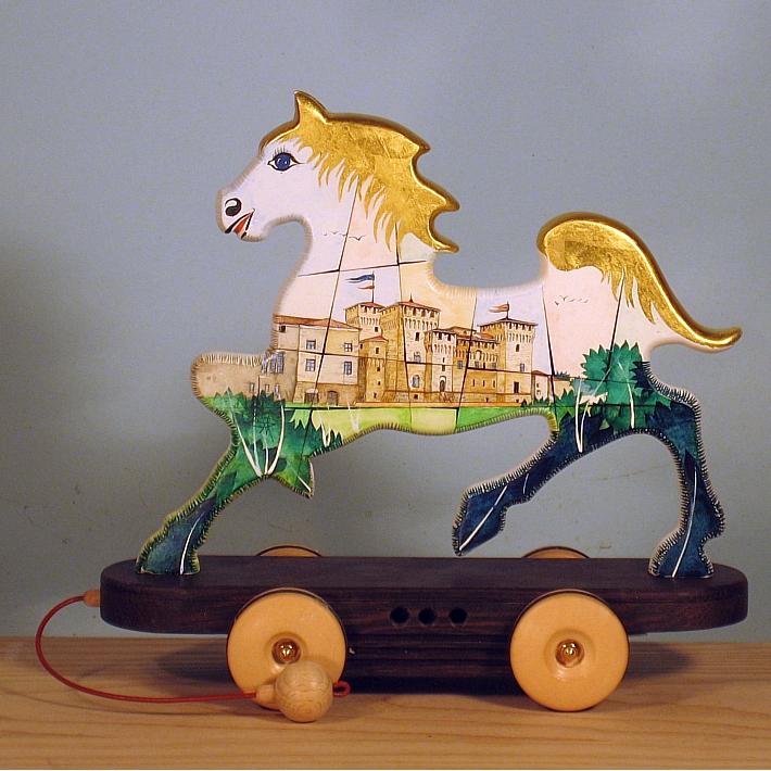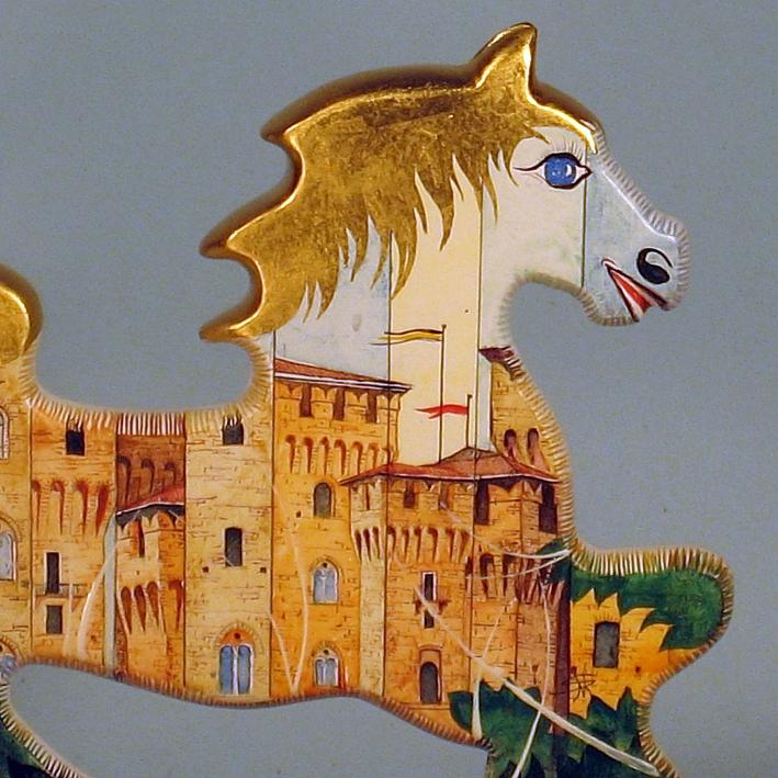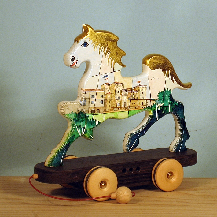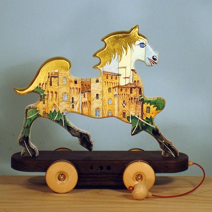 Giocattoli d'arte da collezione, realizzati con legni pregiati, dipinti ad acquerello variamente diluito e tampone con finiture in foglia d'oro 22Kt. Sono tutti pezzi unici, numerati e catalogati, forniti di certificato di produzione firmato dall'artista e sigillati con logo in cera lacca. Ideali per il collezionista, per un regalo di prestigio, per l'arredamento, opere rivolte a bambini e ragazzi come forma educativa per avvicinarli all'arte. Collectible art toys made of precious wood, painted with watercolor and swab with 22Kt gold leaf finishes. They are all unique pieces, numbered and cataloged, provided with a production certificate signed by the artist and sealed with lacquer wax logo. Ideal for the collector, for a prestigious gift, for furnishings, works directed at children and teens as an educational form to bring them closer to art.