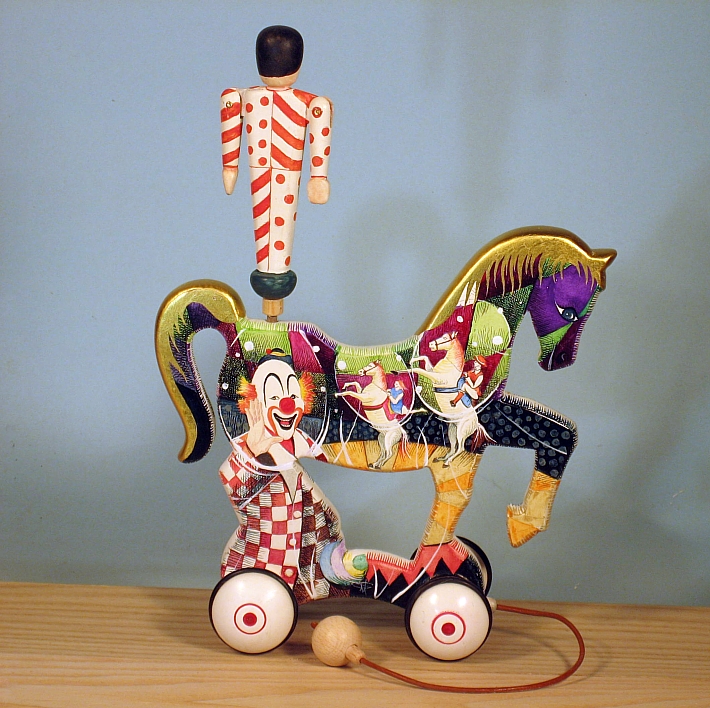 Giocattoli d'arte da collezione, realizzati con legni pregiati, dipinti ad acquerello variamente diluito e tampone con finiture in foglia d'oro 22Kt. Sono tutti pezzi unici, numerati e catalogati, forniti di certificato di produzione firmato dall'artista e sigillati con logo in cera lacca. Ideali per il collezionista, per un regalo di prestigio, per l'arredamento, opere rivolte a bambini e ragazzi come forma educativa per avvicinarli all'arte. Collectible art toys made of precious wood, painted with watercolor and swab with 22Kt gold leaf finishes. They are all unique pieces, numbered and cataloged, provided with a production certificate signed by the artist and sealed with lacquer wax logo. Ideal for the collector, for a prestigious gift, for furnishings, works directed at children and teens as an educational form to bring them closer to art.