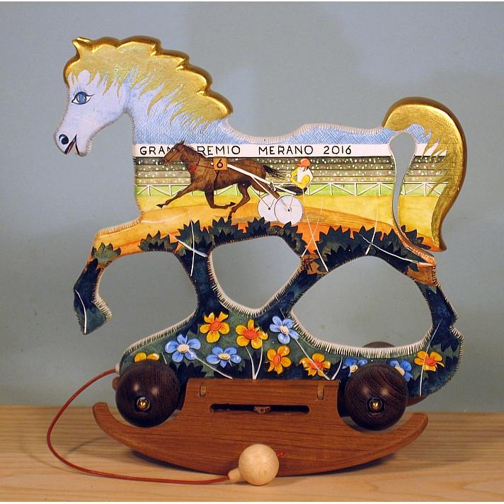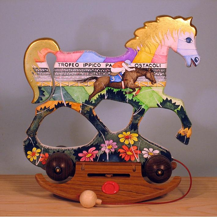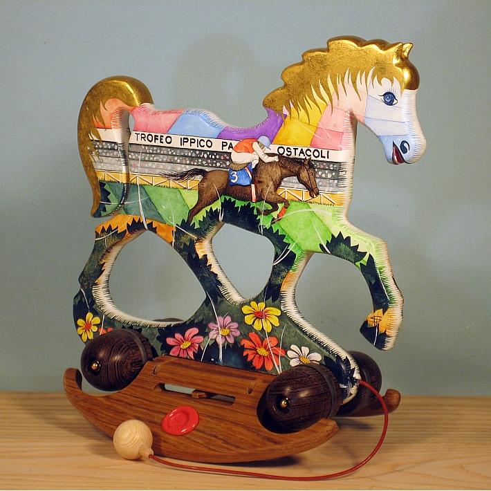Giocattoli d'arte da collezione, realizzati con legni pregiati, dipinti ad acquerello variamente diluito e tampone con finiture in foglia d'oro 22Kt. Sono tutti pezzi unici, numerati e catalogati, forniti di certificato di produzione firmato dall'artista e sigillati con logo in cera lacca. Ideali per il collezionista, per un regalo di prestigio, per l'arredamento, opere rivolte a bambini e ragazzi come forma educativa per avvicinarli all'arte. Collectible art toys made of precious wood, painted with watercolor and swab with 22Kt gold leaf finishes. They are all unique pieces, numbered and cataloged, provided with a production certificate signed by the artist and sealed with lacquer wax logo. Ideal for the collector, for a prestigious gift, for furnishings, works directed at children and teens as an educational form to bring them closer to art.