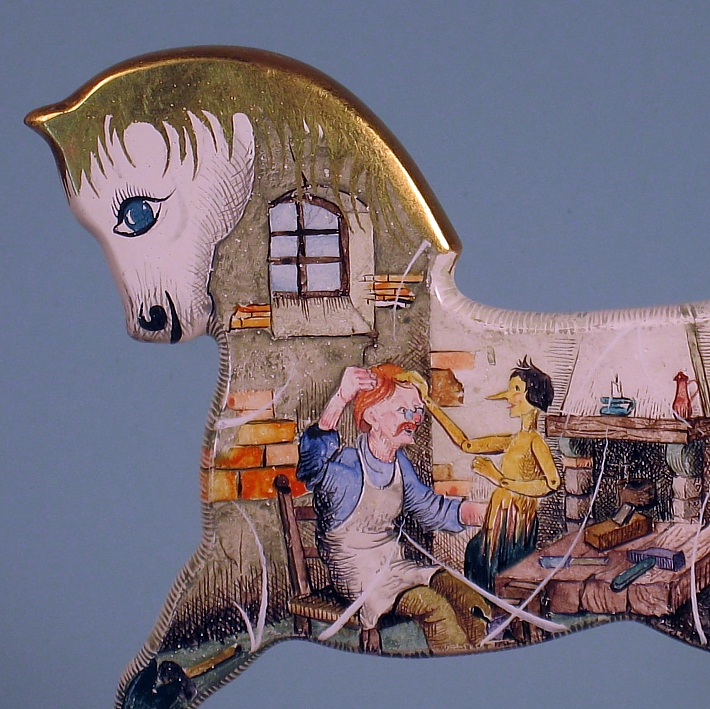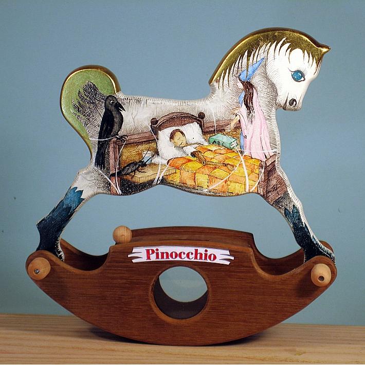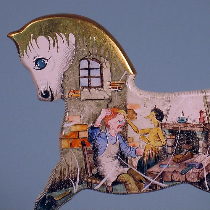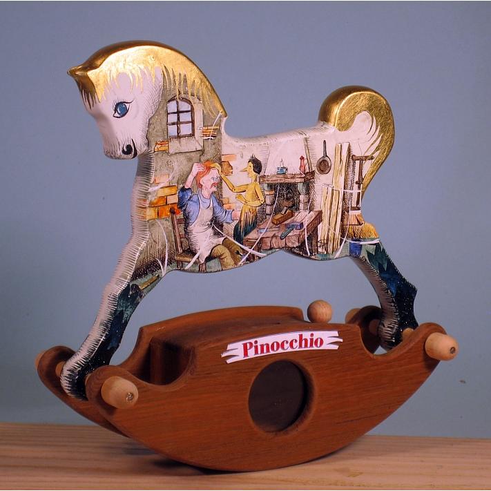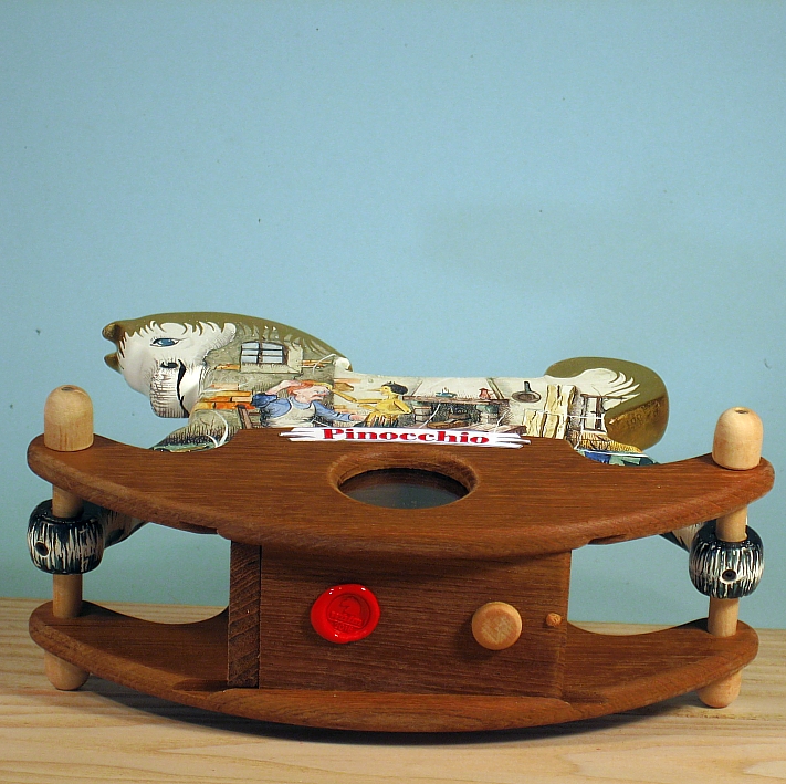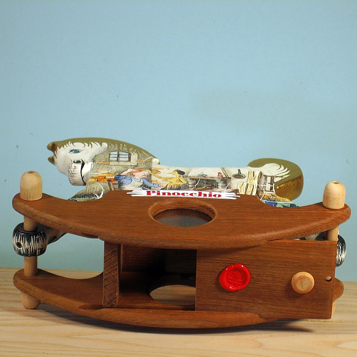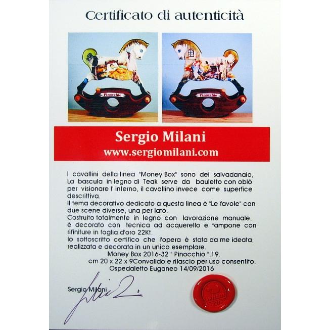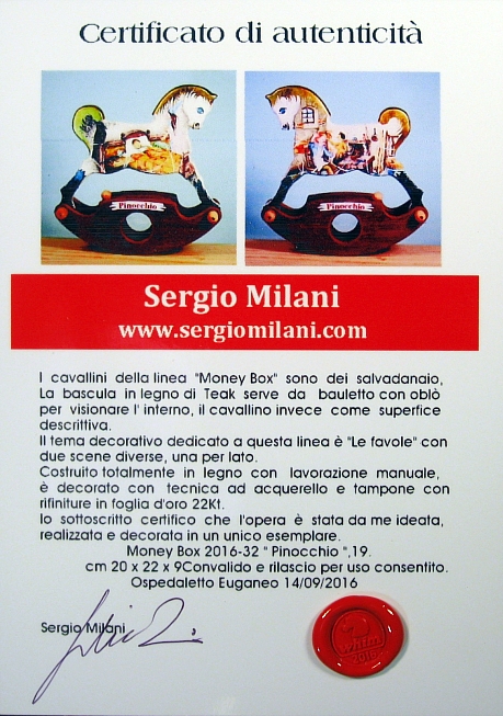 Artista Sergio Milani - Money Box 2916-32 Pinocchio ideato, costruito e dipinto in Italy - dimensioni cm 21 x 20 x 9 - peso Kg 0,300 La collezione cosiddetta " Salvadanaio " rappresenta pezzi unici finemente lavorati con legni pregiati piccoli secretaire con oblò , porticine con spinotti per essere aperte e motivi dipinti che ricordano le favole con due scene, una per lato, dipinte ad acquerello con criniera e coda ricoperte da foglia d'oro di ventidue carati ; l'opera é unica , numerata , catalogata e siglata su un certificato di autenticità .