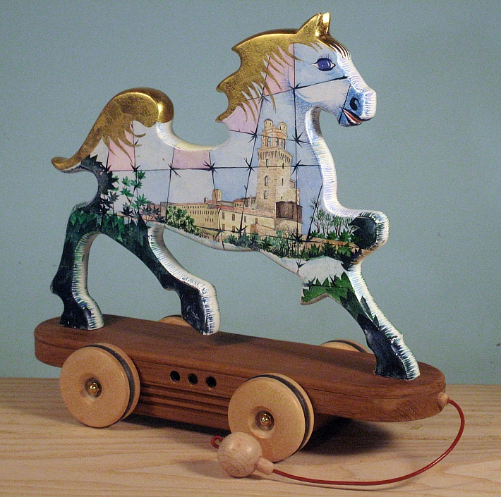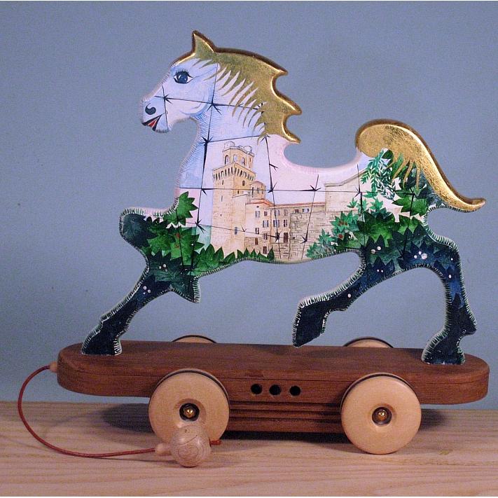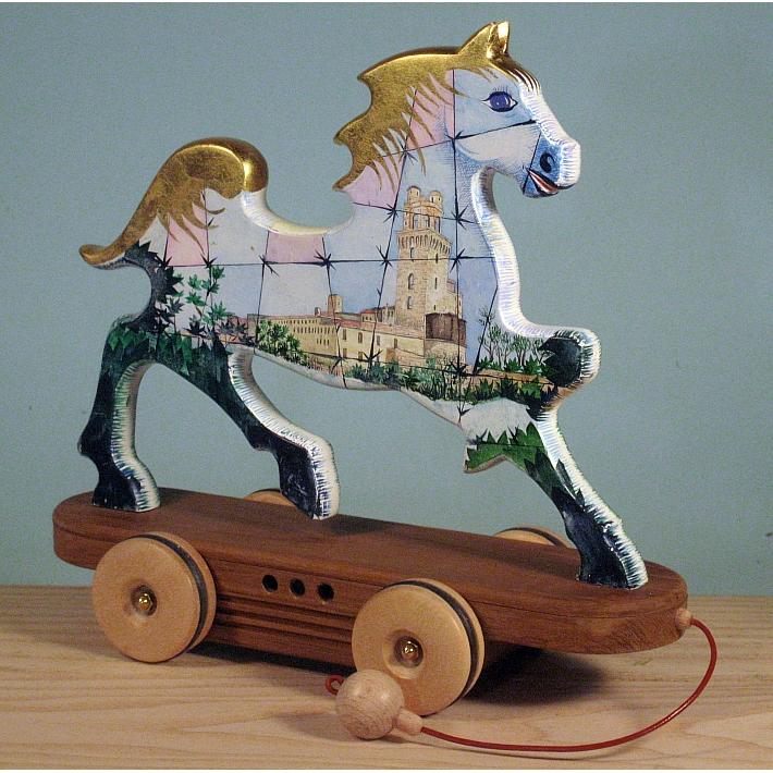 Giocattoli d'arte da collezione, realizzati con legni pregiati, dipinti ad acquerello variamente diluito e tampone con finiture in foglia d'oro 22Kt. Sono tutti pezzi unici, numerati e catalogati, forniti di certificato di produzione firmato dall'artista e sigillati con logo in cera lacca. Ideali per il collezionista, per un regalo di prestigio, per l'arredamento, opere rivolte a bambini e ragazzi come forma educativa per avvicinarli all'arte. Collectible art toys made of precious wood, painted with watercolor and swab with 22Kt gold leaf finishes. They are all unique pieces, numbered and cataloged, provided with a production certificate signed by the artist and sealed with lacquer wax logo. Ideal for the collector, for a prestigious gift, for furnishings, works directed at children and teens as an educational form to bring them closer to art.