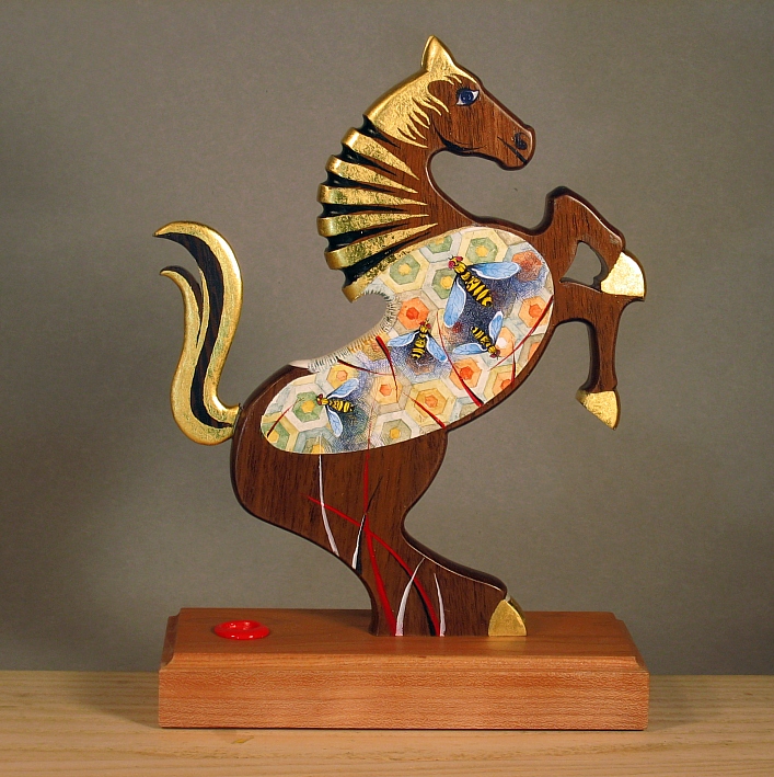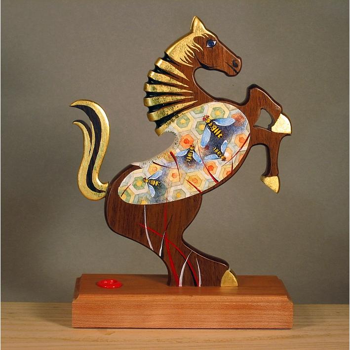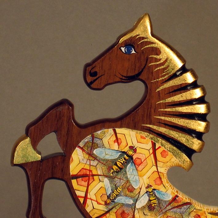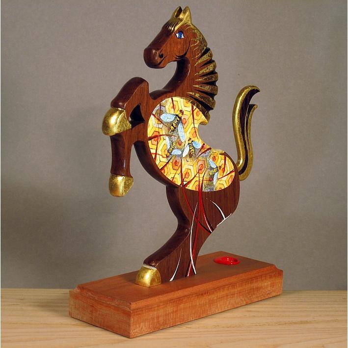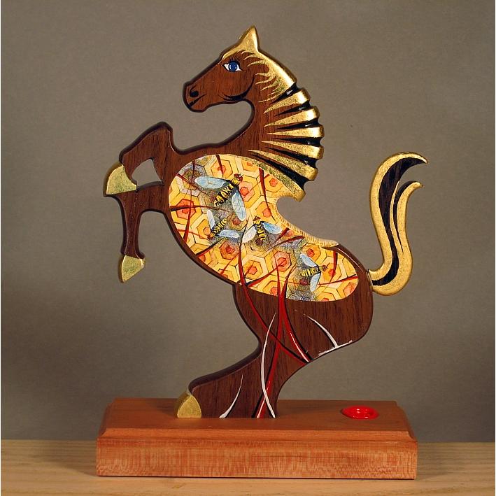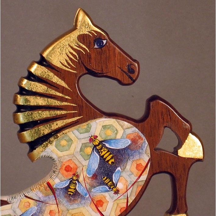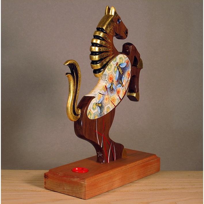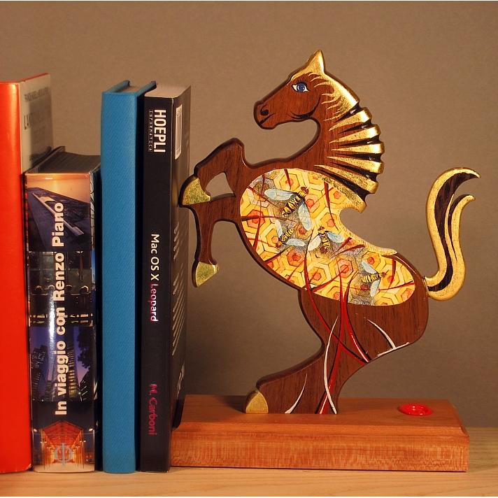 Il cavallino della linea Brisk è realizzato completamente in legno pregiato, può assumere anche la funzione di reggilibri, il tema decorativo è " Composizioni insetti ". Le due immagini una per lato hanno lo stesso soggetto ma la composizione dei colori è diversa. La decorazione è realizzata con colori ad acquerello su fondo bianco e finiture in foglia d'oro 22Kt. L'opera è munita di certificato di autenticità con foto, numero di catalogo, dichiarazione di opera unica e firma dell'artista.