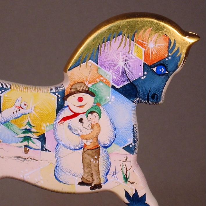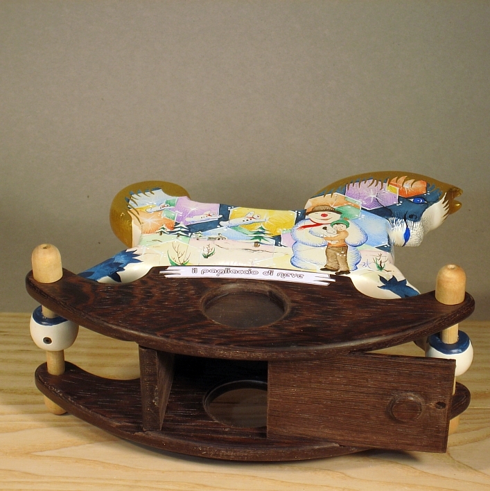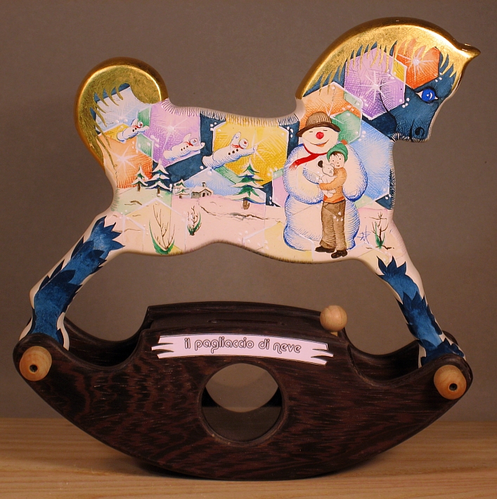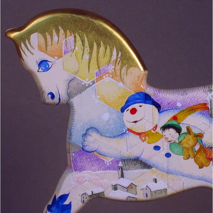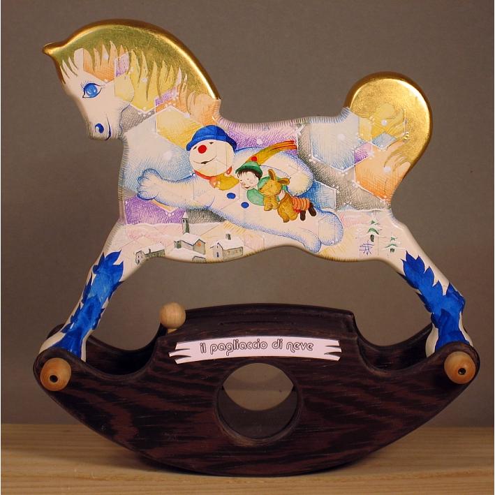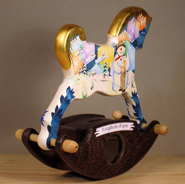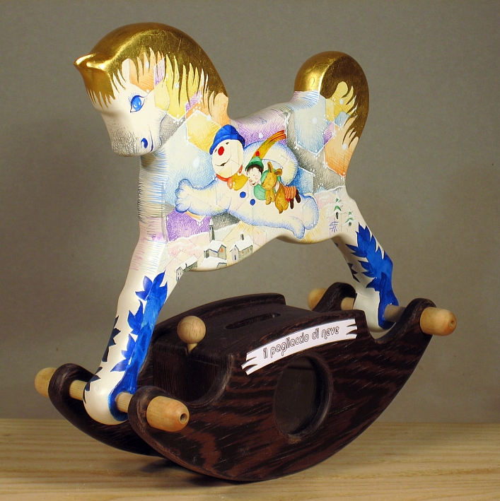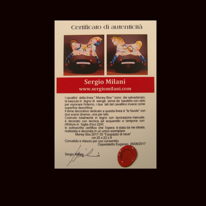 L'opera appartiene alla linea di cavallini Money Box, la bascula in legno di wengè serve da bauletto contenitore con oblò per visionare l'interno. E' costruito completamente in legno con lavorazione manuale e dpinto con tecnica ad acquerello e tampone confiniture in foglia d'oro 22Kt. Il tema decorativo è "le fvole" con due scene diverse una per lato del cavallino.