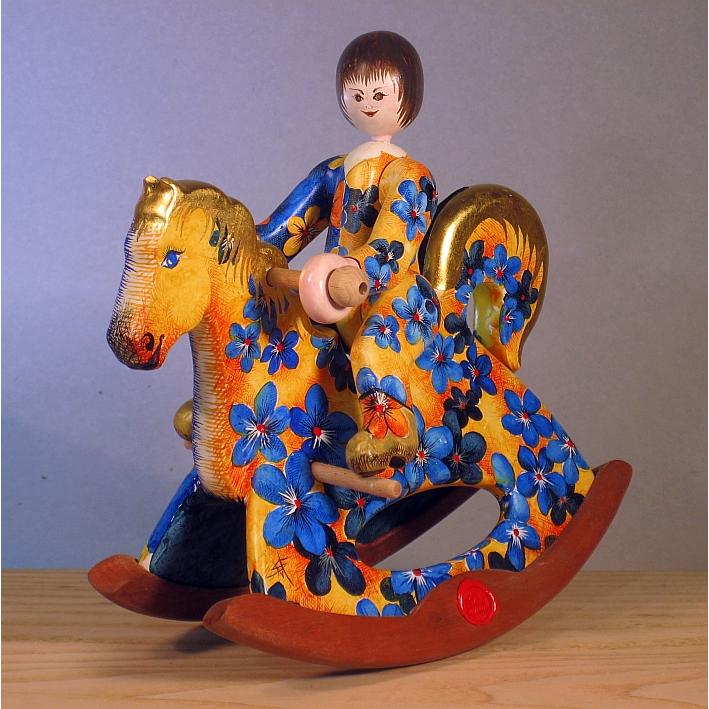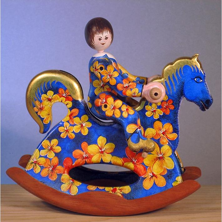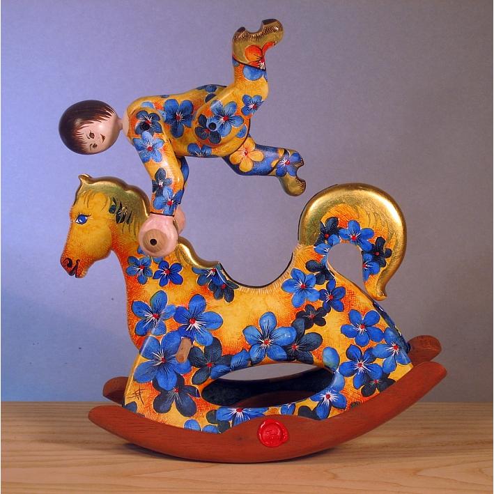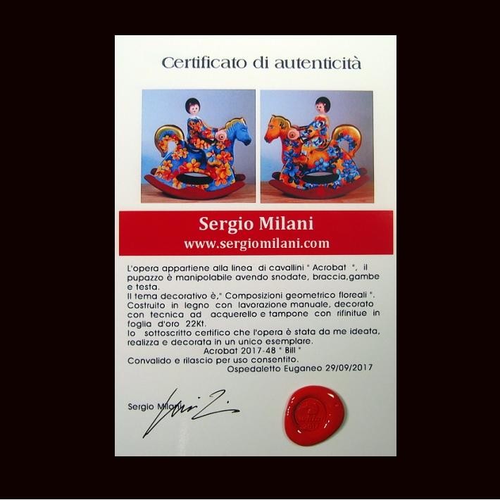 "whim" collezione di giocattoli d'arte del Maestro Sergio Milani. I cavallini della linea "ACROBAT"sono l'interpretazione del bambino sul suo giocattolo; il pupazzo è snodato, gambe braccia e testa si possono ruotare per fargli assumere varie posizioni di equilibrio nel dondolare. L'opera è realizzata in legno preparato per la pittura con fondo bianco specifico. Le bascule dondolo sono in legno pregiato. Il tema decorativo dedicato a questa linea è, "COMPOSIZIONE GEOMETRICO FLOREALE", il motivo ornamentale integra tutta la composizione. La tecnica cromatica è eseguita con acquerelli e tampone variamente diluiti. Come da tradizione criniera e coda sono rifinite con foglia d'oro 22Kt. Il nome della bambolina "Bill"rimane legato al numero di catalogo e non sarà mai ripetuto. L'opera, numerata e catalogata è accompagnata da un certificato di autenticità con foto e firma autografa dell'artista.