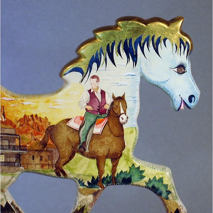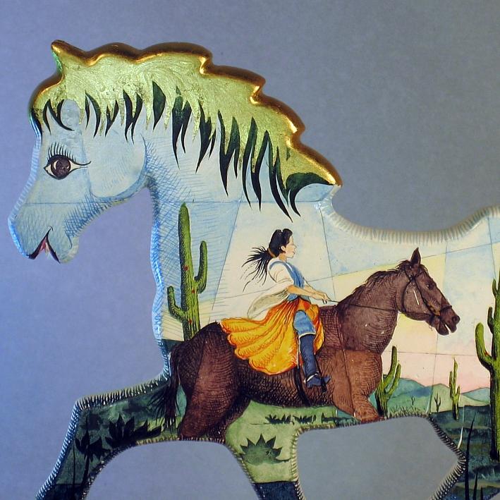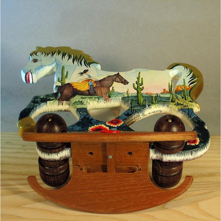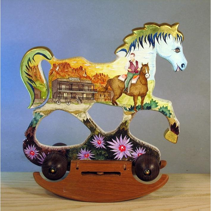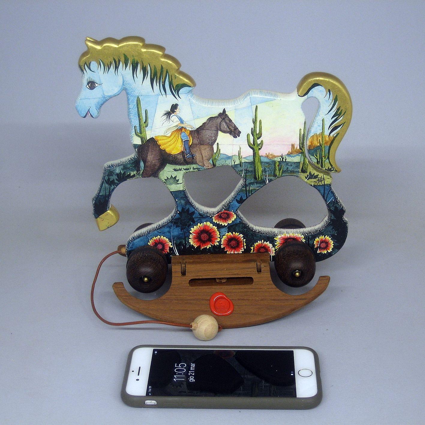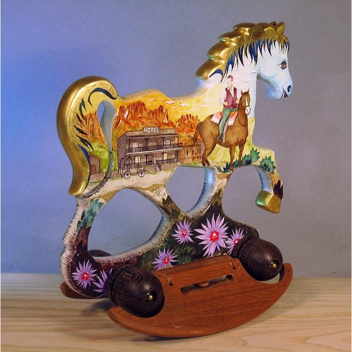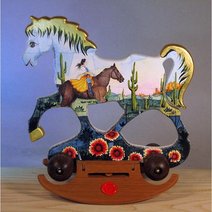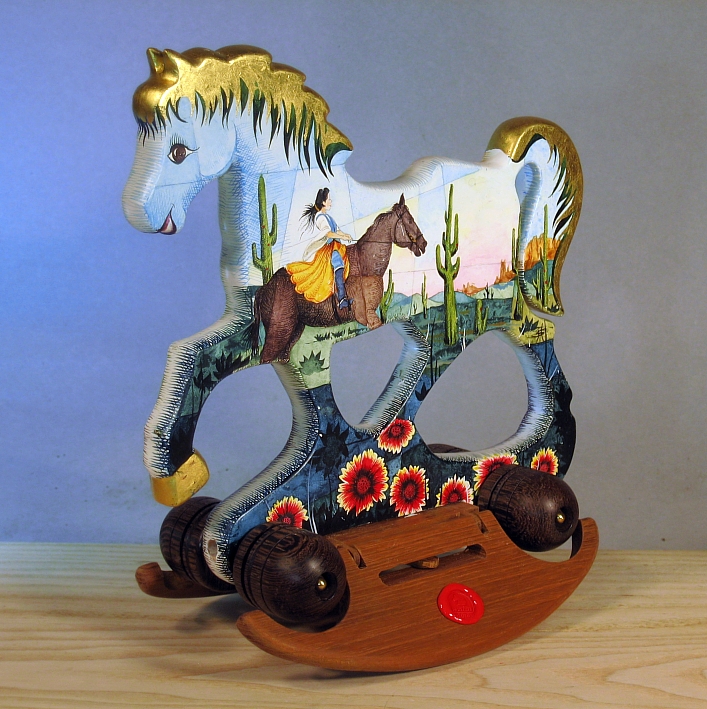 Il cavallo della linea Dream è un dondolo che si può trasformare in trainabile. E' realizzato manualmente in legno, con ruote e base a dondolo in legno pregiato a vista, il tema decorativo è, " la natura, il paesaggio e il cavallo ", l'interpretazione è sviluppata con due scene diverse una per lato. La decorazione è realizzata con tecnica ad acquerello e tampone, la criniera e la coda come da tradizione sono in foglia d'oro 22 Kt. L'opera è corredata da un certificato di autenticazione con foto, numero di catalogo, dichiarazione di opera unica e firma dell'artista.