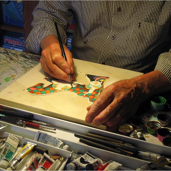 Giocattoli d'arte da collezione, realizzati con legni pregiati, dipinti ad acquerello variamente diluito e tampone con finiture in foglia d'oro 22Kt. Sono tutti pezzi unici, numerati e catalogati, forniti di certificato di produzione firmato dall'artista e sigillati con logo in cera lacca. Ideali per il collezionista, per un regalo di prestigio, per l'arredamento, opere rivolte a bambini e ragazzi come forma educativa per avvicinarli all'arte. Collectible art toys made of precious wood, painted with watercolor and swab with 22Kt gold leaf finishes. They are all unique pieces, numbered and cataloged, provided with a production certificate signed by the artist and sealed with lacquer wax logo. Ideal for the collector, for a prestigious gift, for furnishings, works directed at children and teens as an educational form to bring them closer to art.