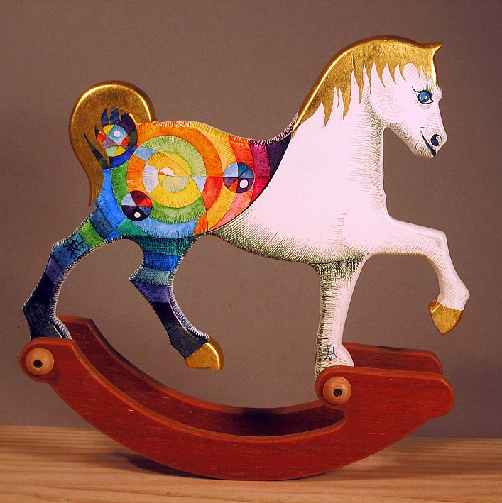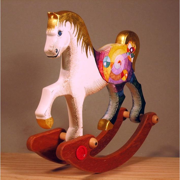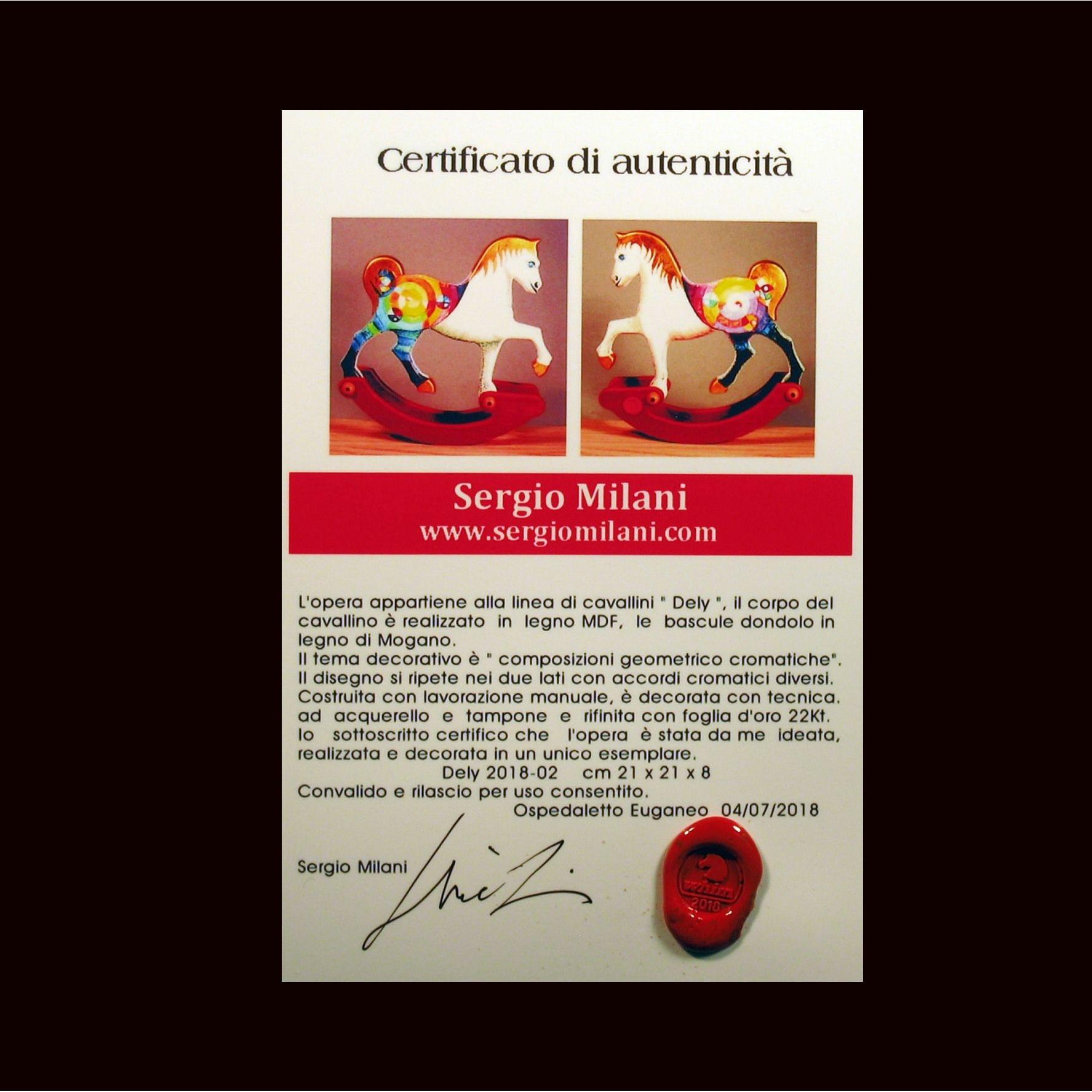 Artista Sergio Milani, ideato, costruito e dipinto in Italy, dimensioni..cm 21x21x7,5 peso Kg 0,300 La galleria DELY presenta cavallini con dondolo, sono realizzati completamente in legno con lavorazione manuale, le bascule dondolo sono in legno pregiato a vista, il cavallino è realzzato in legno mdf e preparato alla pittura con un fondo bianco specifico. Il tema decorativo è " Geometrie cromatiche " esso viene presentato con due immagini diverse una per lato, realizzate con tecnica decorativa ad acquerello e tampone e finitue in foglia d'oro 22Kt. Ogni opera è accompagnata da un certificato di autenticità con firma autografa dell'artista. A richiesta viene fornito con una dedica su adesiva posta sulla bascula dondolo.