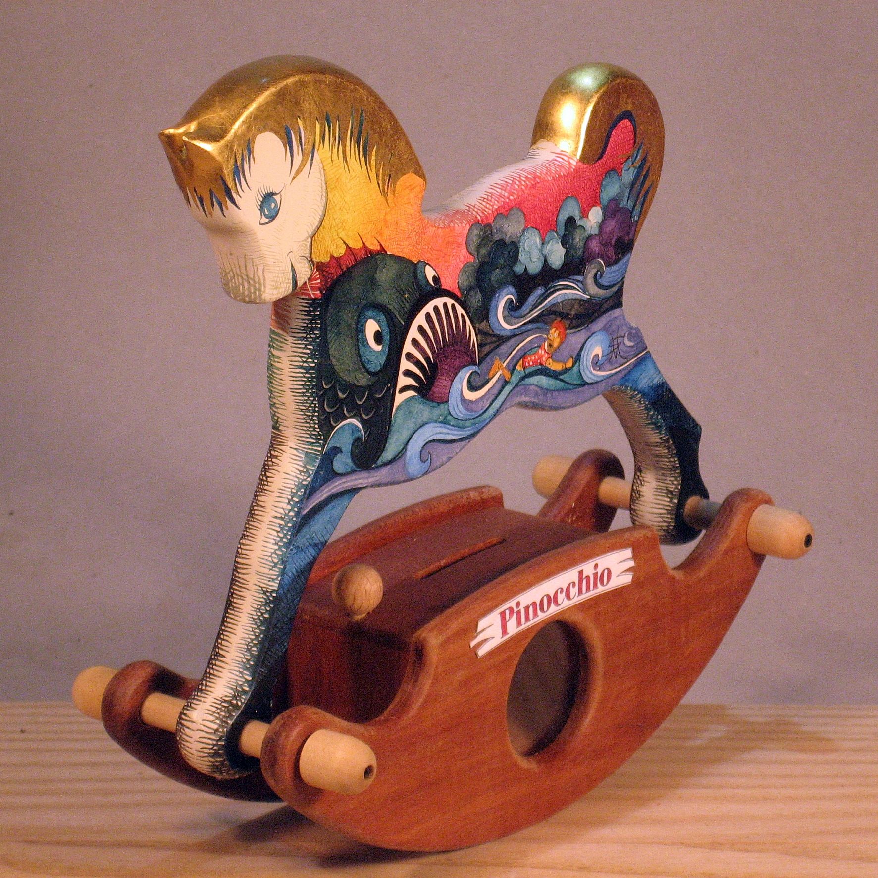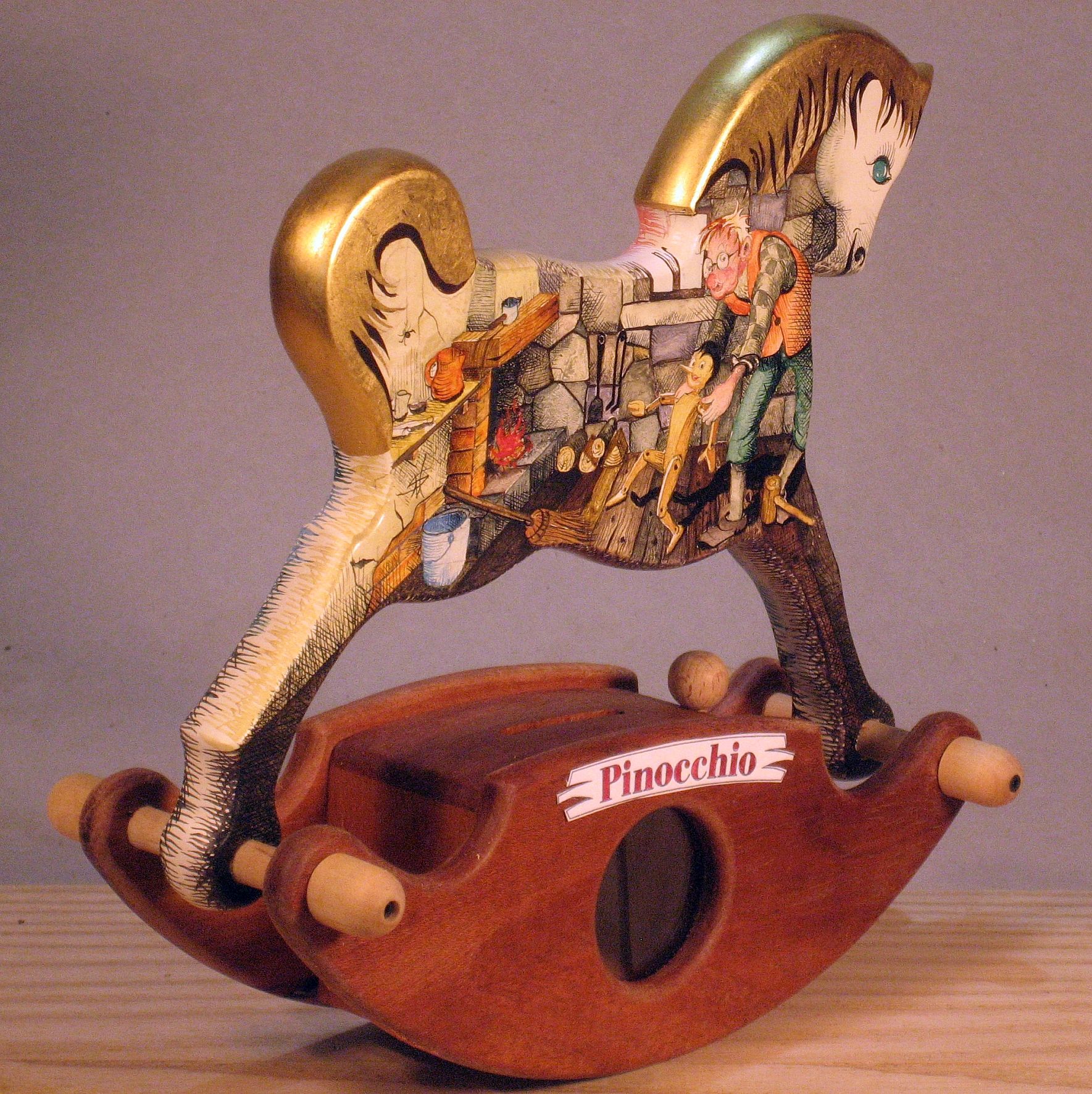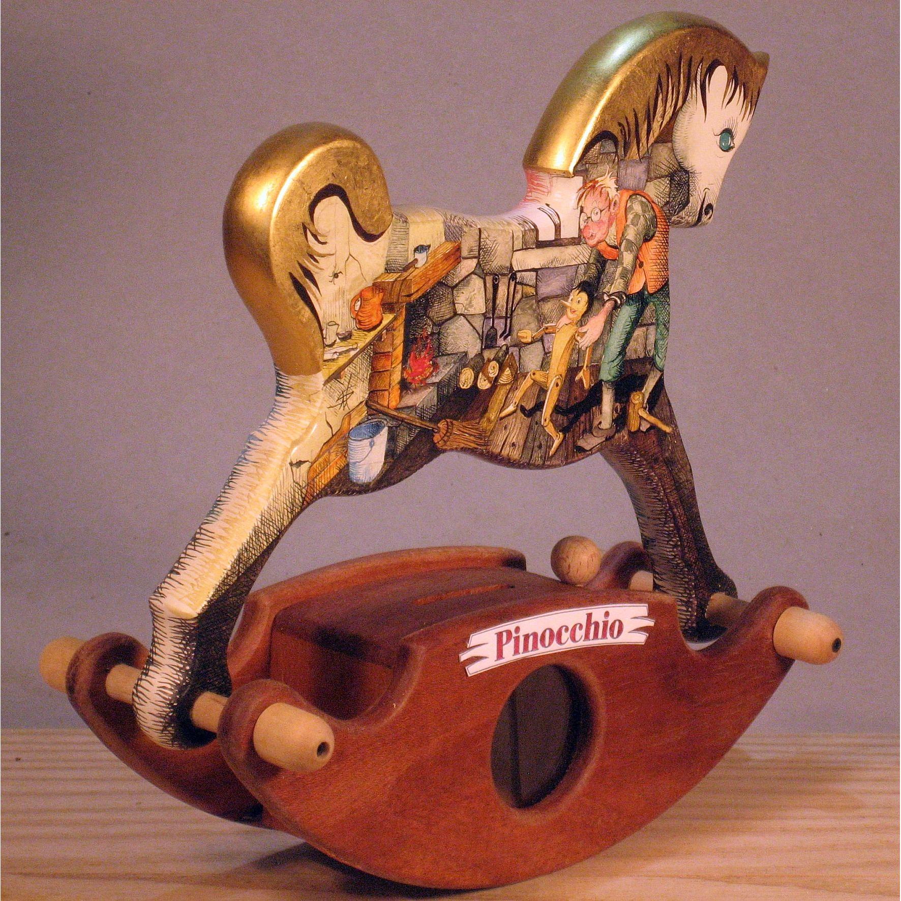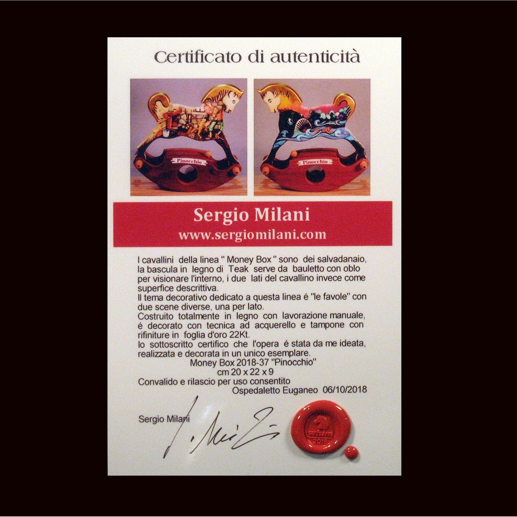 Artista Sergio Milani , Money Box 2018-37 "Pinocchio", ideato, costruito e dipinto in Italy - dimensioni cm 21 x 20 x 9 peso Kg 0,300 I cavalli della linea Money Box sono realizzati interamente in legno, la base a dondolo è in legno pregiato e serve da contenitore con un oblò per ispezionare l'interno, uno spinotto apre una porticina scorrevole nella parte inferiore del contenitore; Il cavallo è preparato alla decorazione con un fondo bianco per legno. Il tema decorativo dedicato a questa linea è, " Le favole ", con due scene differenti, una per lato. La decorazione è realizzata con la tecnica ad acquerello variamente diluito e tampone, criniera e coda sono rifinite con foglia d'oro 22kt. L'opera è corredata da un certificato di autenticazione con foto, numero di catalogo, dichiarazione di opera unica e firma dell'artista.