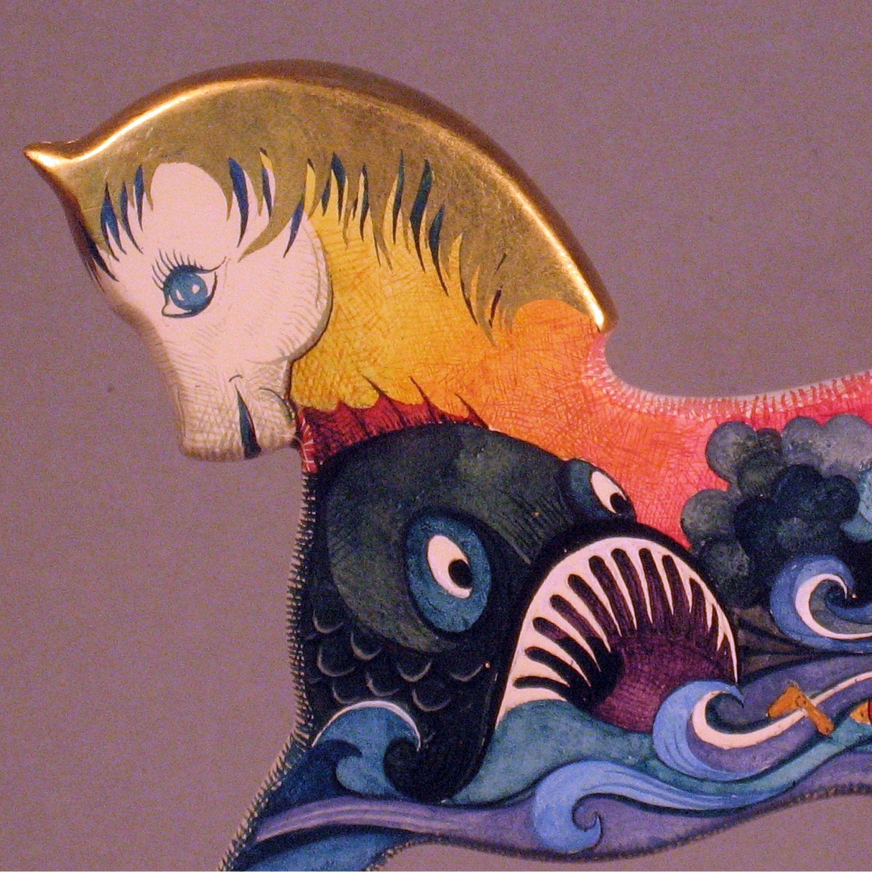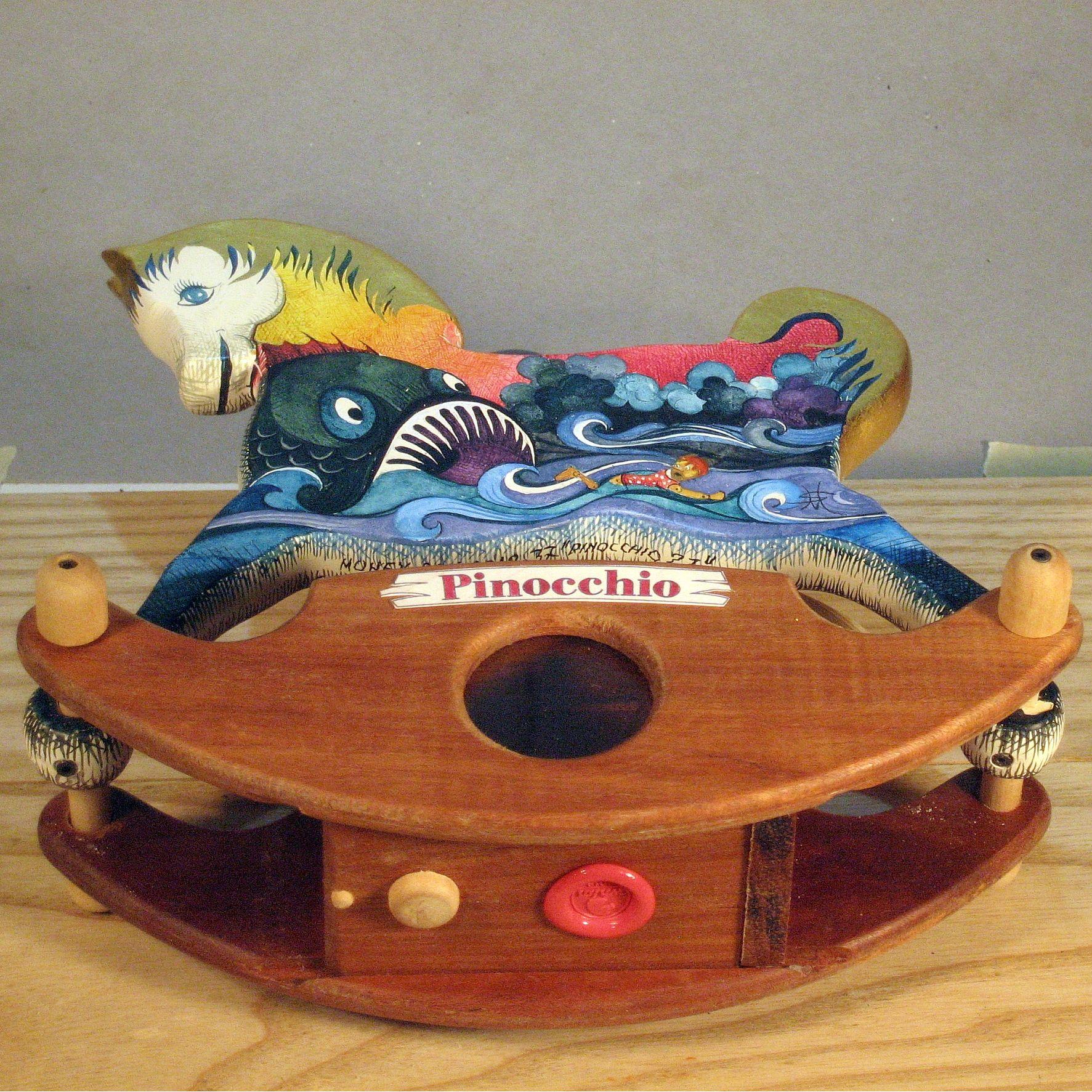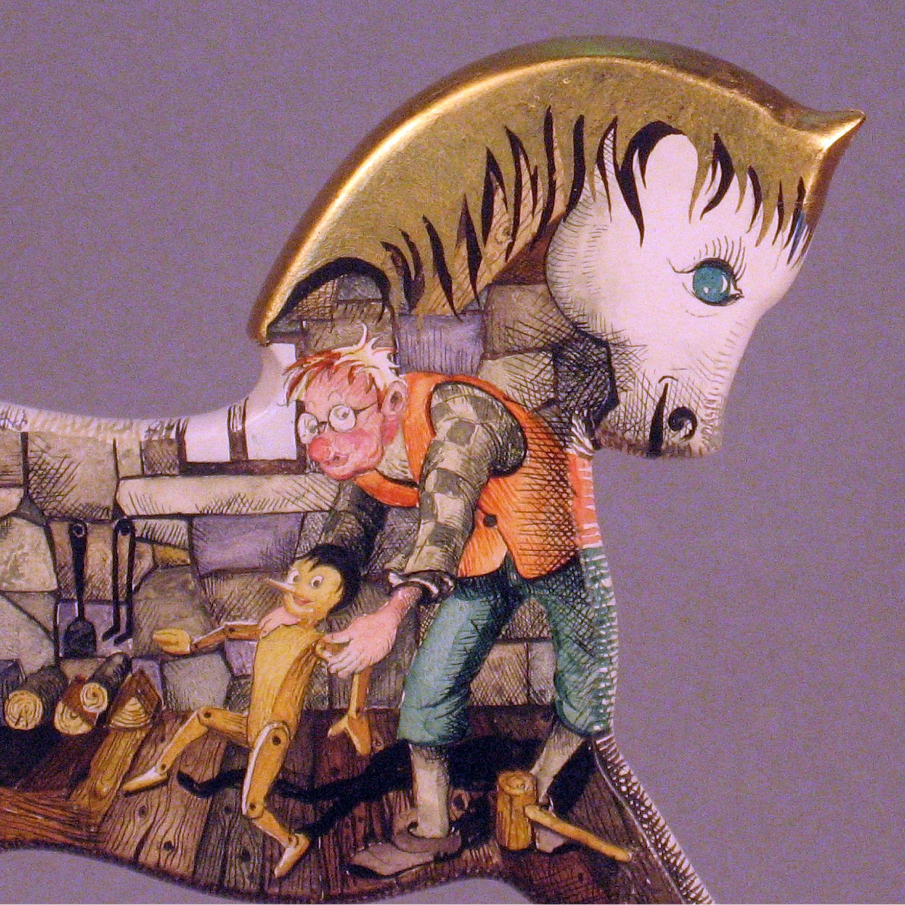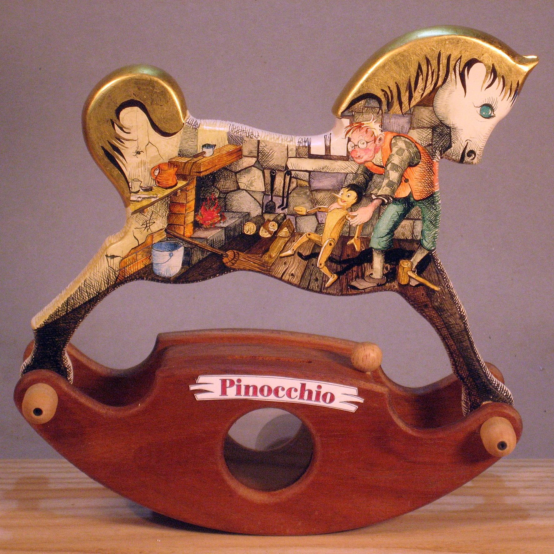 Artista Sergio Milani , Money Box 2018-37 "Pinocchio", ideato, costruito e dipinto in Italy - dimensioni cm 21 x 20 x 9 peso Kg 0,300 I cavalli della linea Money Box sono realizzati interamente in legno, la base a dondolo è in legno pregiato e serve da contenitore con un oblò per ispezionare l'interno, uno spinotto apre una porticina scorrevole nella parte inferiore del contenitore; Il cavallo è preparato alla decorazione con un fondo bianco per legno. Il tema decorativo dedicato a questa linea è, " Le favole ", con due scene differenti, una per lato. La decorazione è realizzata con la tecnica ad acquerello variamente diluito e tampone, criniera e coda sono rifinite con foglia d'oro 22kt. L'opera è corredata da un certificato di autenticazione con foto, numero di catalogo, dichiarazione di opera unica e firma dell'artista.