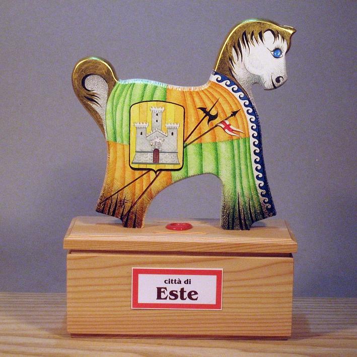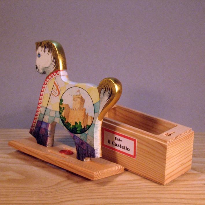 Artista Sergio Milani: opera ideata , costruita e dipinta in Italy - Polis 2019-02 Este. La linea Polis presenta dei slvadanaio, essi si ispirano al monumento equestre, Il basamento serve da contenitore , mentre la superfice del cavallino viene usata per illustrare il tema "monuenti e simboli delle città", la decorazione è sviluppata da un lato con la miniatura di un monumento, dall'altro lato con stemmi, vessilli e alabarde che completano un'opera dal sapore araldico medioevale. come da tradizione la criniera e la coda del cavallino sono rifinite con foglia d'oro 22Kt. Per rendere l'opera unica, lo stesso monumennto e lo stemma non sarà mai ripetuto nella stessa forma compositivo-cromatica. Completa l'opera un certificato di autenticità con numero di catalogo, foto, dichiarazione di opera unica e firmadel'artista. Può essere richiesta un'opera personalizzata inviando le foto di un monumento della città preferita.