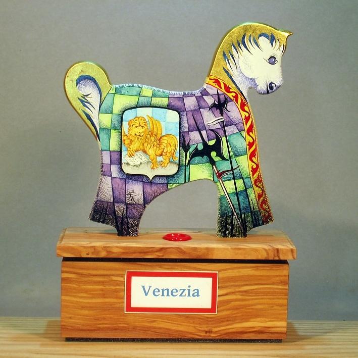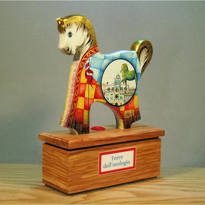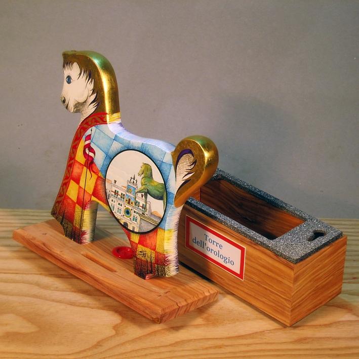 Artista Sergio Milani: opera ideata , costruita e dipinta in Italy - Polis 2019-03 Venezia. La linea Polis presenta dei slvadanaio, essi si ispirano al monumento equestre, Il basamento serve da contenitore , mentre la superfice del cavallino viene usata per illustrare il tema "monuenti e simboli delle città", la decorazione è sviluppata da un lato con la miniatura di un monumento, dall'altro lato con stemmi, vessilli e alabarde che completano un'opera dal sapore araldico medioevale. come da tradizione la criniera e la coda del cavallino sono rifinite con foglia d'oro 22Kt. Per rendere l'opera unica, lo stesso monumennto e lo stemma non sarà mai ripetuto nella stessa forma compositivo-cromatica. Completa l'opera un certificato di autenticità con numero di catalogo, foto, dichiarazione di opera unica e firmadel'artista. Può essere richiesta un'opera personalizzata inviando le foto di un monumento della città preferita.