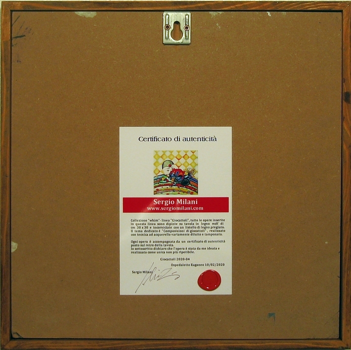 Giocattoli d'arte del maestro Sergio Milani - collezione "whim" , linea "Toys", Toys 2020-04 - opera ideata, realizzata, dipinta in Italy - dimensioni cm 30 x30 - peso Kg 1,0 Toys è una linea di piccoli quadri realizzati su legno e incorniciati con un semplice listello di protezione. Il tema decorativo è "Composizioni di giocattoli", realizzato con colori ad acquerello variamente diluiti e tamponati. L'opera è accompagnata da un certificato di autenticità, con dichiarazione di opera unica, foto, numero di catalogo e firma dell'artista. Per questa linea è prevista la tiratura di n° 50 copie numerate, non ripetibili, con dimensioni cm 23 x 23, compresa la cornice, la decorazione è riprodotta fedelmente con vera foto, ogni copia sarà munita di relativo certificato di autenticità. Art toys by the master Sergio Milani - "whim" collection, "Toys" line, Toys 2020-04 - work conceived, created, painted in Italy - dimensions 30 x30 cm - weight 1.0 kg Toys is a line of small paintings made on wood and framed with a simple protection strip. The decorative theme is "Toy compositions", made with variously diluted and buffered watercolor colors. The work is accompanied by a certificate of authenticity, with a unique work declaration, photo, catalog number and artist signature. For this line, there will be a print run of 50 numbered, non-repeatable copies, with dimensions 23 x 23 cm, including the frame, the decoration is faithfully reproduced with a real photo, each copy will be provided with a relative certificate of authenticity.