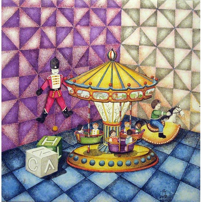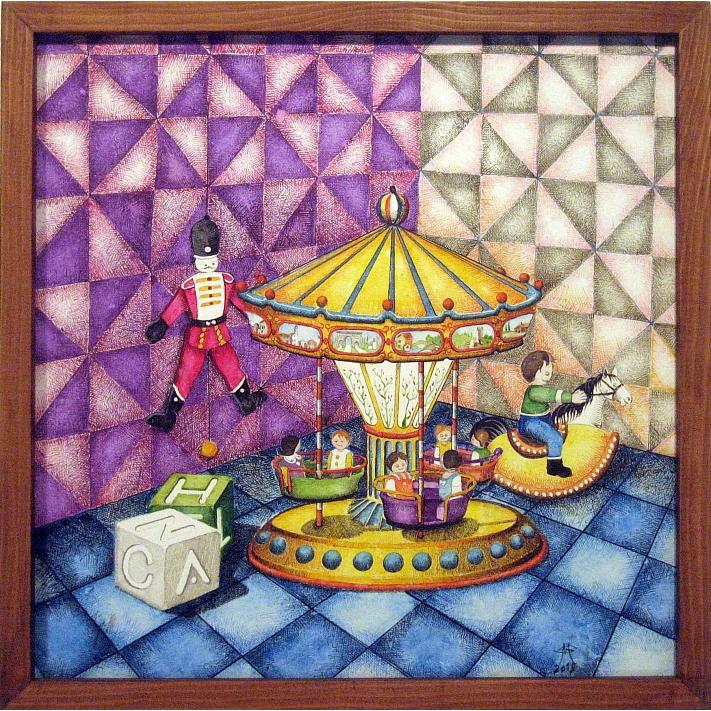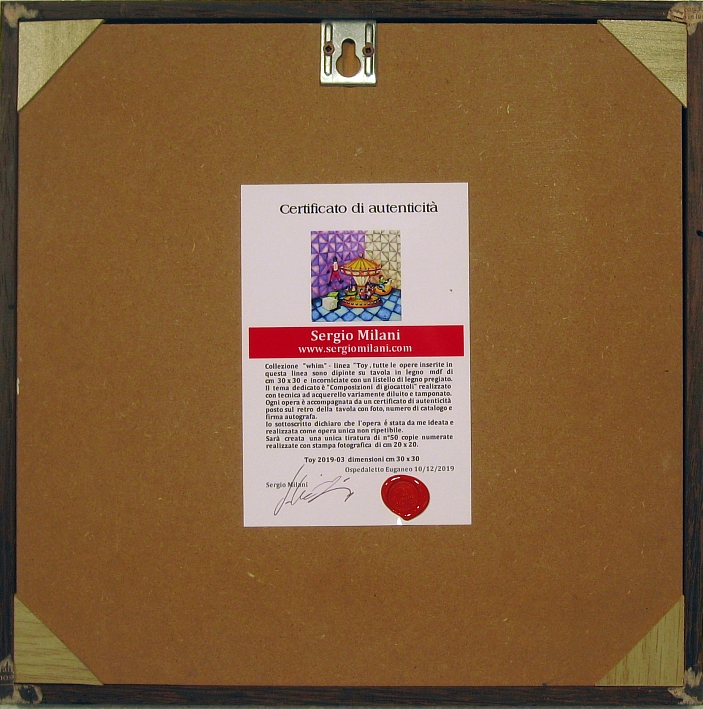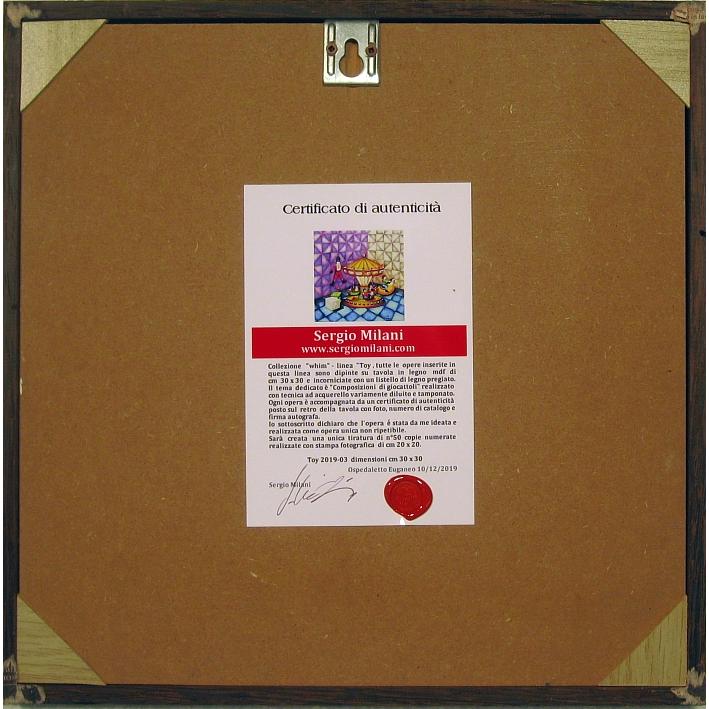 Giocattoli d'arte del maestro Sergio Milani - collezione "whim" , linea "Toys", Toys 2020-03 - opera ideata, realizzata, dipinta in Italy - dimensioni cm 30 x30 - peso Kg 1,0 Toys è una linea di piccoli quadri realizzati su legno e incorniciati con un semplice listello di protezione. Il tema decorativo è "Composizioni di giocattoli", realizzato con colori ad acquerello variamente diluiti e tamponati. L'opera è accompagnata da un certificato di autenticità, con dichiarazione di opera unica, foto, numero di catalogo e firma dell'artista. Per questa linea è prevista la tiratura di n° 50 copie numerate, non ripetibili, con dimensioni cm 23 x 23, compresa la cornice, la decorazione verrà riprodotta fedelmente con vera foto, ogni copia sarà munita di relativo certificato di autenticità.