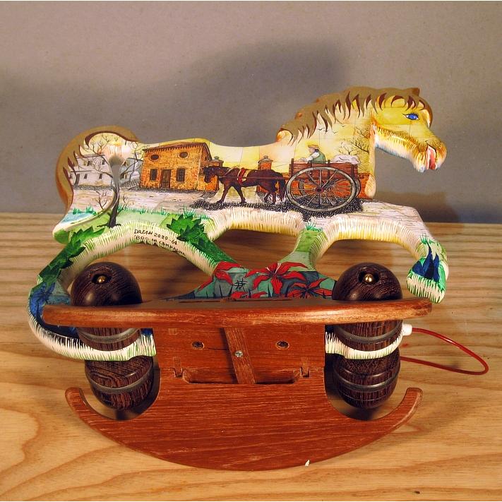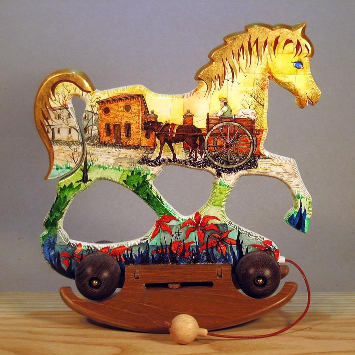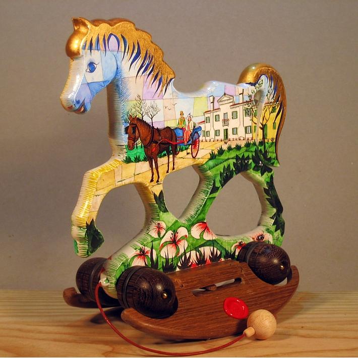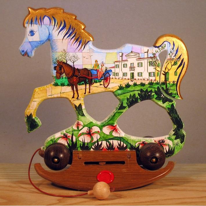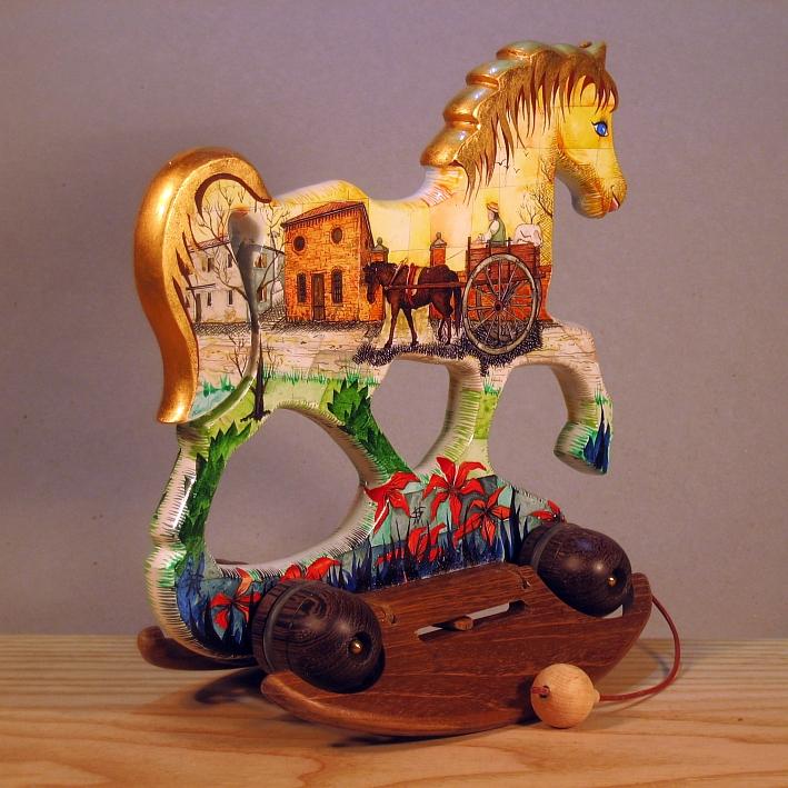 Giocattoli d'arte del maestro Sergio Milani, collezione "whim" linea "Dream" Dream 2020-64 " '800 in campagna", Ideato, costruito e dipinto in Italy - dimensioni cm 22x23x12 - peso Kg 0,300 Il cavallo della linea Dream è un dondolo che si può trasformare in trainabile. E' realizzato manualmente in legno, con ruote e base a dondolo in legno pregiato, il tema decorativo è, " la natura, il paesaggio e il cavallo ", la pittura è applicata su fondo bianco specifico per legno. La decorazione che si sviluppa con due scene, una per lato del cavallino, è realizzata con tecnica ad acquerello variamente diluito e tamponato, con finiture in foglia d'oro 23 kt. L'opera è corredata da un certificato di autenticazione con foto, numero di catalogo, dichiarazione di opera unica e firma dell'artista.