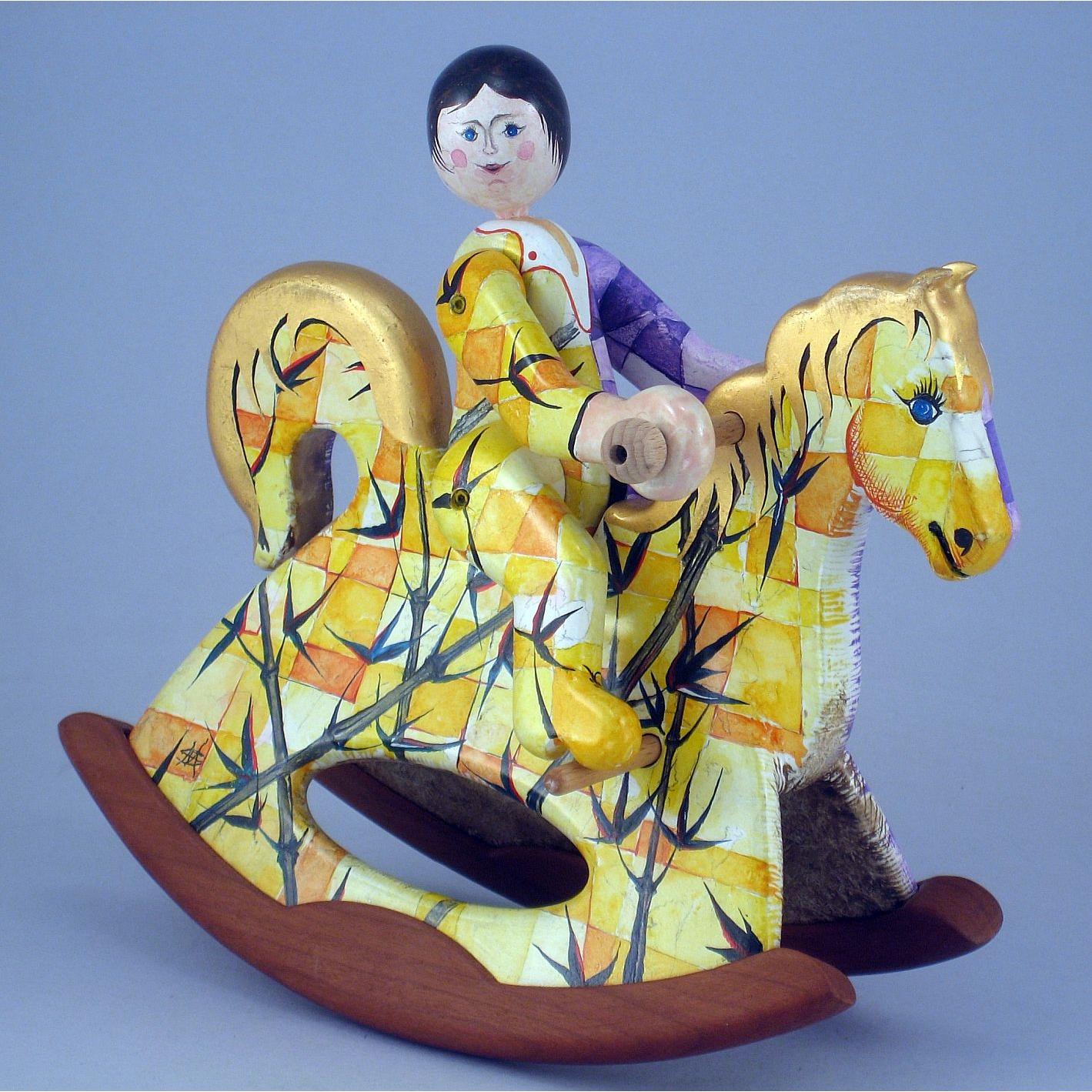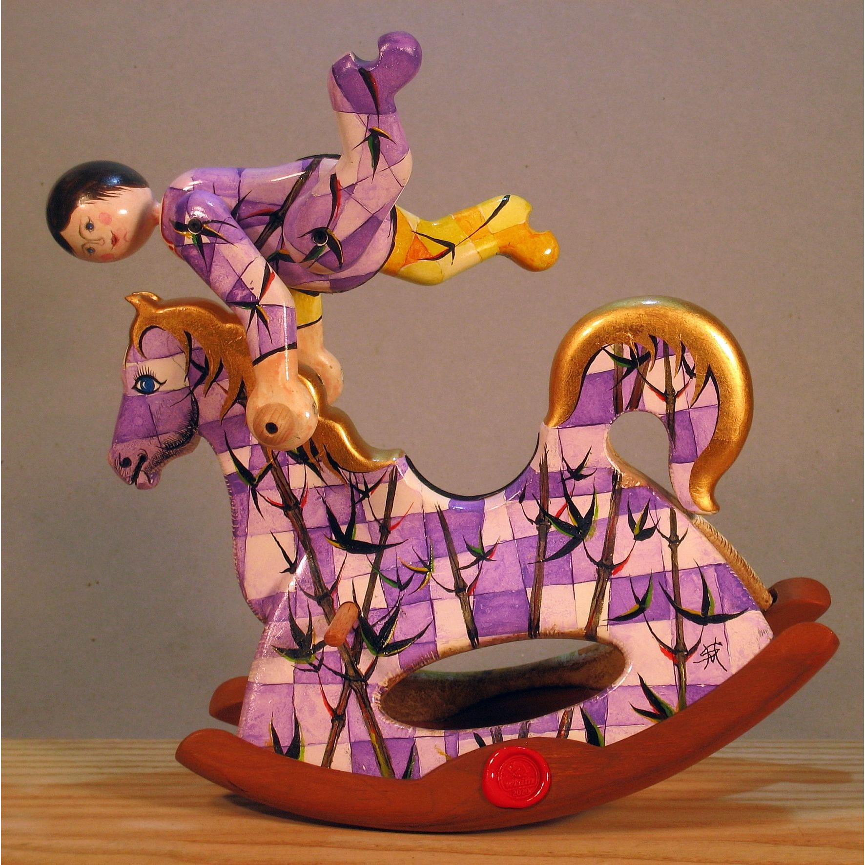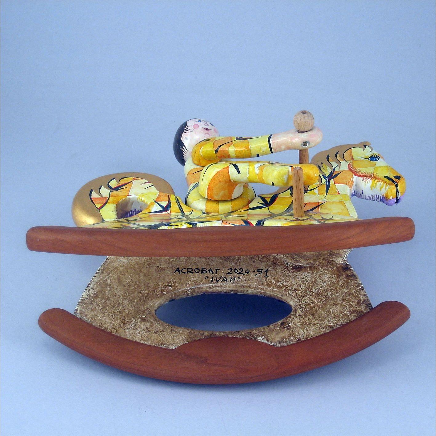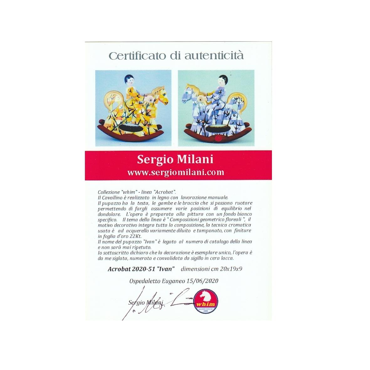 Giocattoli d'arte del maestro Sergio Milani, collezione "whim" linea "Acrobat" "Acrobat 2020-51 Ivan" -ideato, costruito e dipinto in Italy -dimensioni cm 21 x 20 x 9 - peso Kg 0,300 I cavallini della linea Acrobat sono l'interpretazione del bambino sul suo giocattolo; il pupazzo è snodato, gambe braccia e testa si possono ruotare per fargli assumere varie posizioni di equilibrio nel dondolare. L'opera è realizzata in legno con lavorazione manuale, i pattini di supporto al dondolo sono in legno pregiato a vista, l'opera viene preparata alla pittura con un fondo bianco specifico. Il tema decorativo dedicato a questa linea è, "COMPOSIZIONI GEOMETRICO FLOREALI", il motivo ornamentale integra tutta la composizione. La tecnica cromatica è eseguita con acquerelli variamente diluiti e tamponati con finiture in foglia d'oro 23Kt. Il nome della bambolina "Ivan" rimane legato al numero di catalogo e non sarà mai ripetuto. L'opera, numerata e catalogata è accompagnata da un certificato di autenticità con foto e firma autografa dell'artista.
