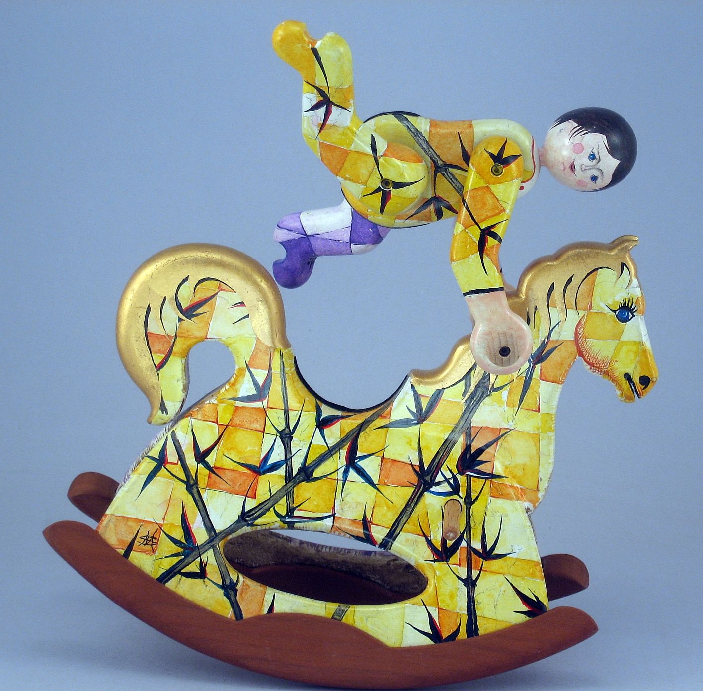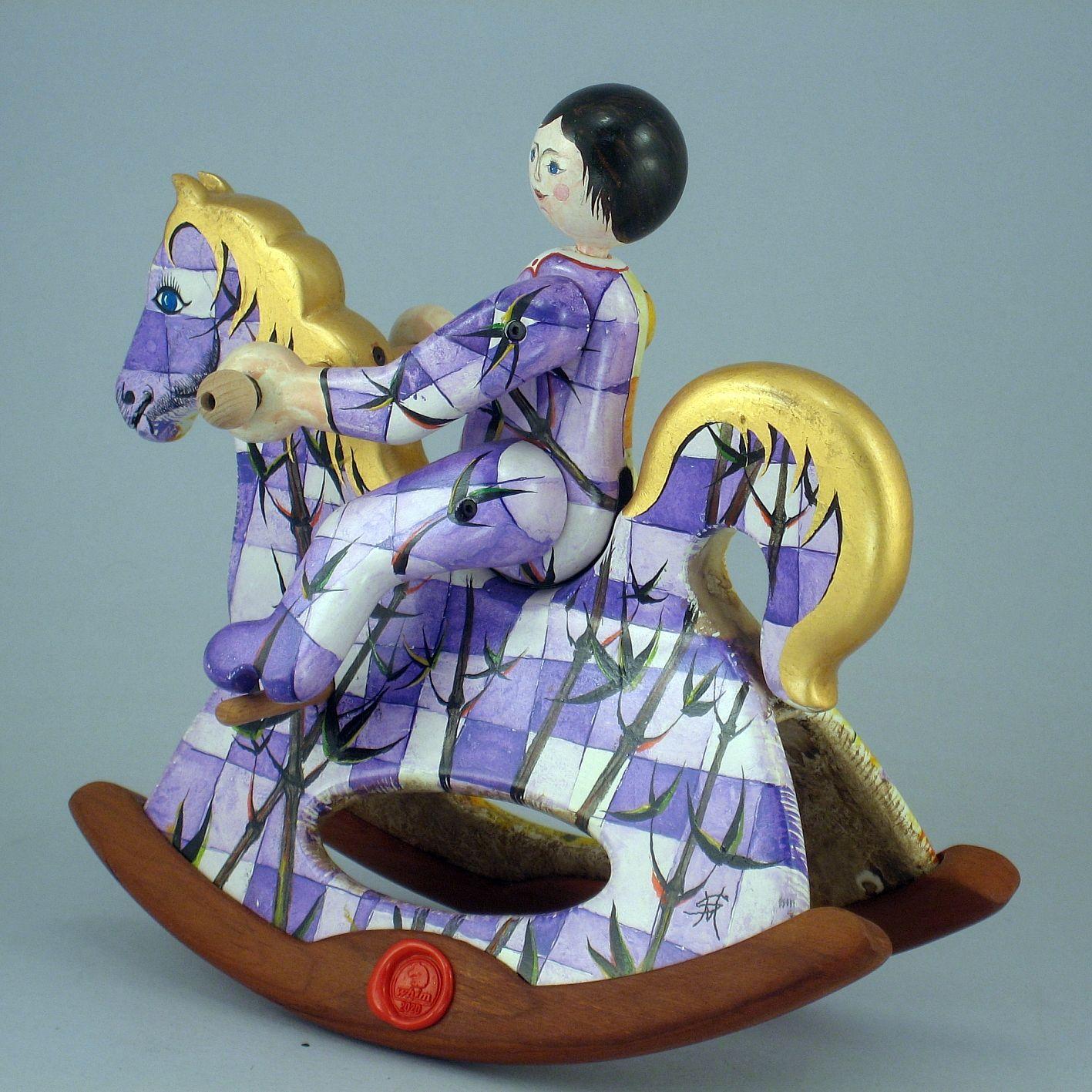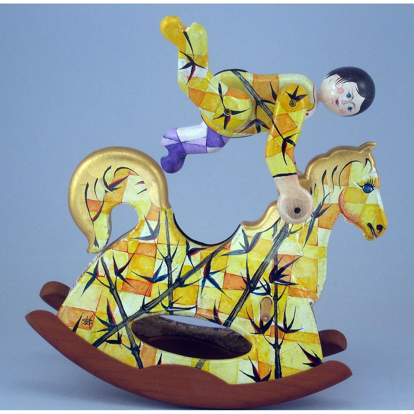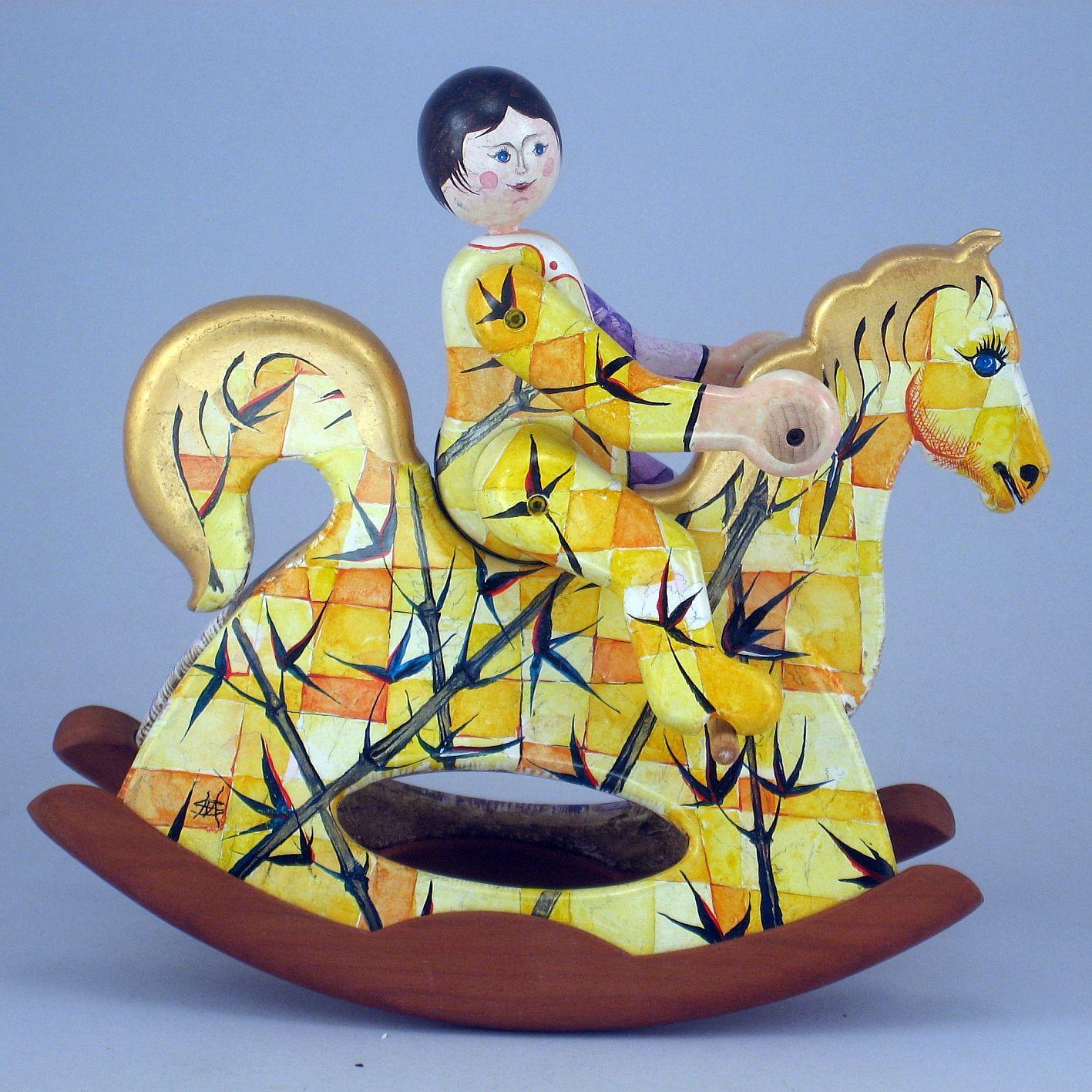 Giocattoli d'arte del maestro Sergio Milani, collezione "whim" linea "Acrobat" "Acrobat 2020-51 Ivan" -ideato, costruito e dipinto in Italy -dimensioni cm 21 x 20 x 9 - peso Kg 0,300 I cavallini della linea Acrobat sono l'interpretazione del bambino sul suo giocattolo; il pupazzo è snodato, gambe braccia e testa si possono ruotare per fargli assumere varie posizioni di equilibrio nel dondolare. L'opera è realizzata in legno con lavorazione manuale, i pattini di supporto al dondolo sono in legno pregiato a vista, l'opera viene preparata alla pittura con un fondo bianco specifico. Il tema decorativo dedicato a questa linea è, "COMPOSIZIONI GEOMETRICO FLOREALI", il motivo ornamentale integra tutta la composizione. La tecnica cromatica è eseguita con acquerelli variamente diluiti e tamponati con finiture in foglia d'oro 23Kt. Il nome della bambolina "Ivan" rimane legato al numero di catalogo e non sarà mai ripetuto. L'opera, numerata e catalogata è accompagnata da un certificato di autenticità con foto e firma autografa dell'artista.