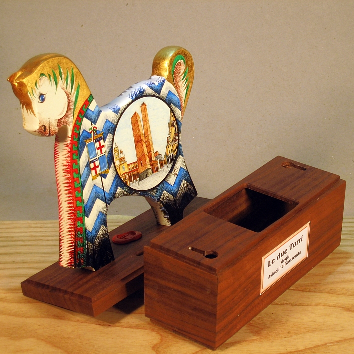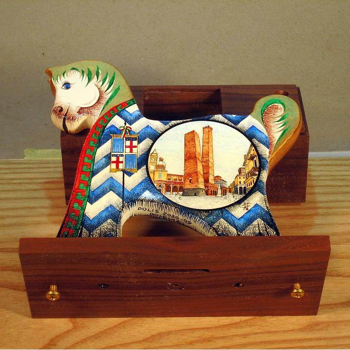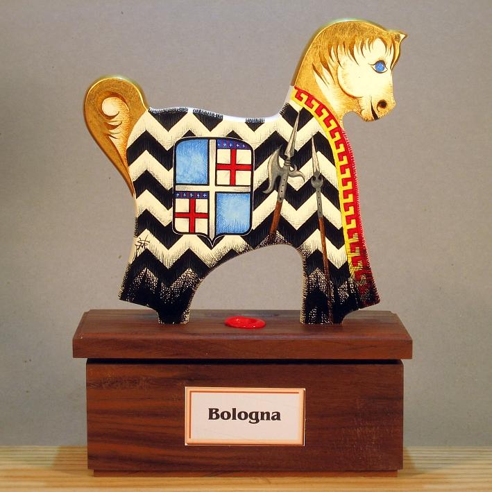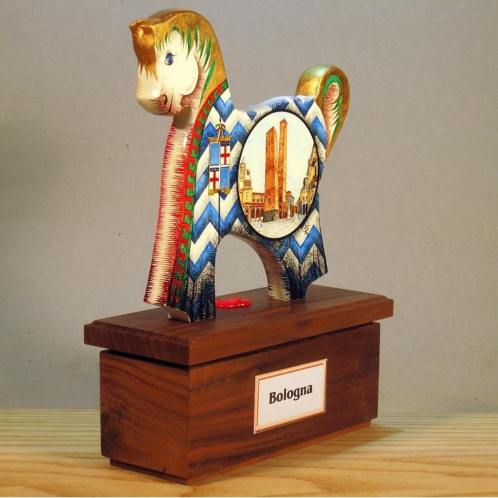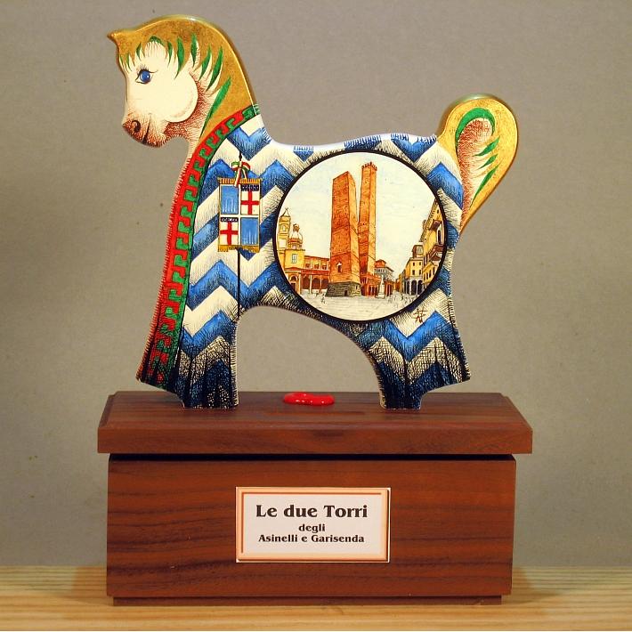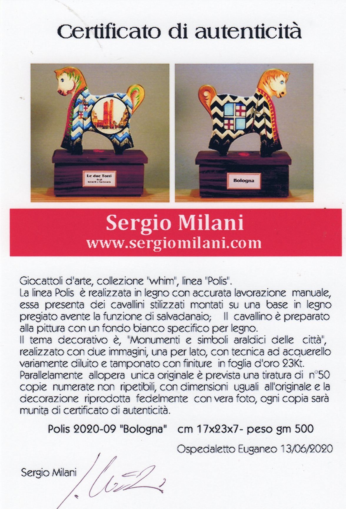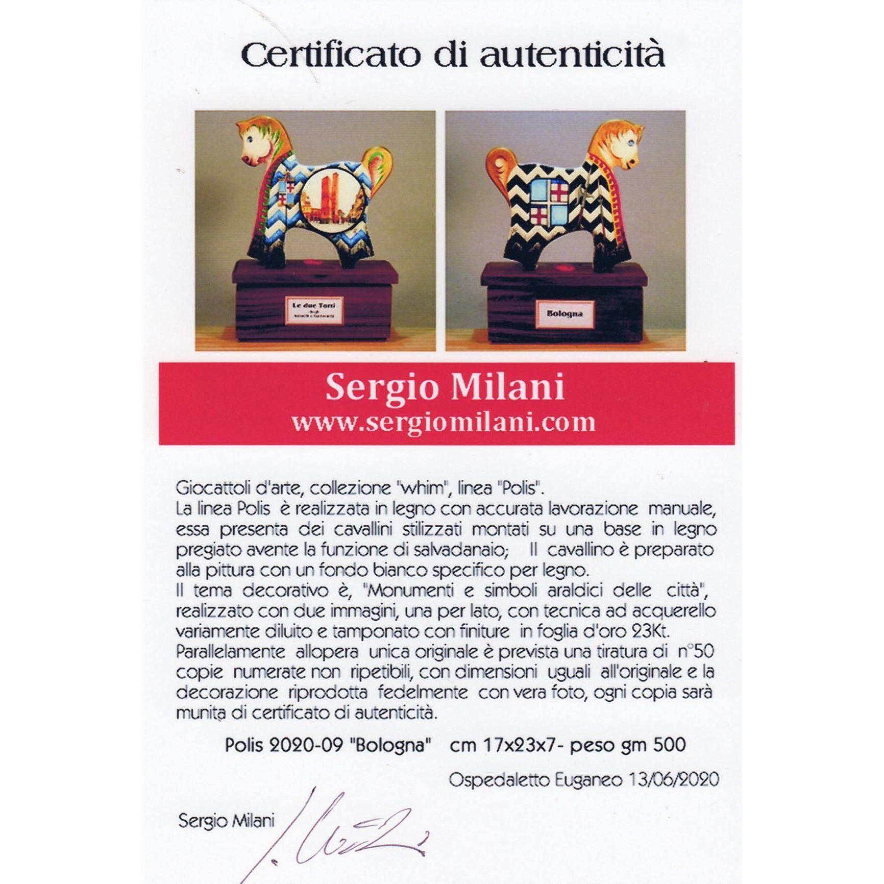 Giocattoli d'arte del maestro Sergio Milani - collezione "whim" , linea "Polis". Polis 2020-09 Bologna", ideata, costruita e dipinta in Italy - dimensioni cm x 17 x 23 x 7 - peso Kg 0,500. La linea "Polis" presenta dei cavallini realizzati in legno con scrupolosa lavorazione manuale, la base di supporto è in legno pregiato ed ha la funzione di salvadanaio. La superfice del cavallino è preparata alla pittura con un fondo bianco specifico per legno, Il tema decorativo dedicato alla linea è " Monumenti e simboli araldici delle città", con due vedute una per lato, la tecnica usata è con colori ad acquerello variamente diluiti e tamponati con finiture in foglia d'oro 23 Kt. L'opera è accompagnata da un certificato di autenticità, con dichiarazione di opera unica, foto, numero di catalogo e firma dell'artista. Per questa linea è prevista una tiratura di n° 50 copie numerate, non ripetibili, con profilo e dimensioni uguali all'originale e la decorazione riprodotta fedelmente con vera foto, ogni copia sarà munita di relativo certificato di autenticità.