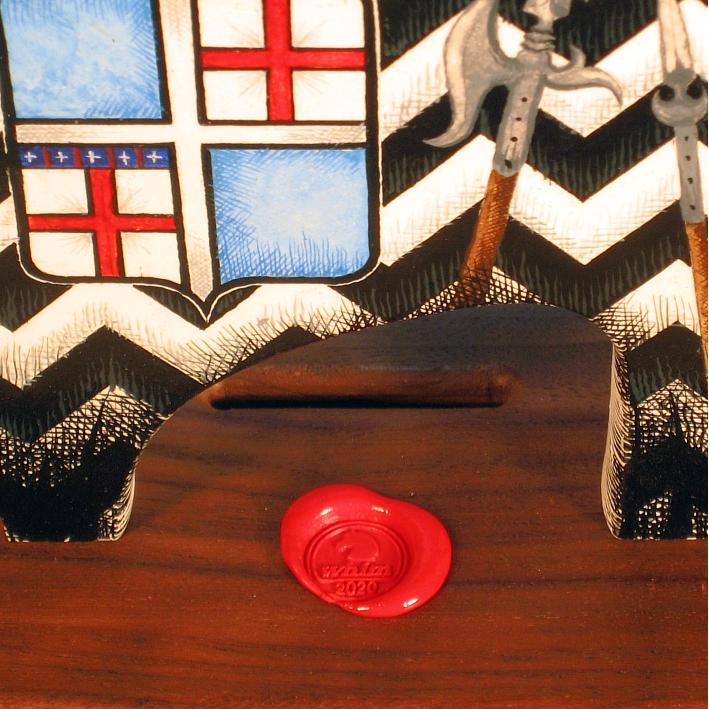 Giocattoli d'arte da collezione, realizzati con legni pregiati, dipinti ad acquerello variamente diluito e tampone con finiture in foglia d'oro 22Kt. Sono tutti pezzi unici, numerati e catalogati, forniti di certificato di produzione firmato dall'artista e sigillati con logo in cera lacca. Ideali per il collezionista, per un regalo di prestigio, per l'arredamento, opere rivolte a bambini e ragazzi come forma educativa per avvicinarli all'arte. Collectible art toys made of precious wood, painted with watercolor and swab with 22Kt gold leaf finishes. They are all unique pieces, numbered and cataloged, provided with a production certificate signed by the artist and sealed with lacquer wax logo. Ideal for the collector, for a prestigious gift, for furnishings, works directed at children and teens as an educational form to bring them closer to art.