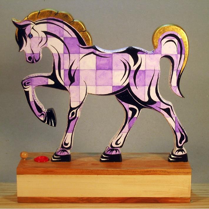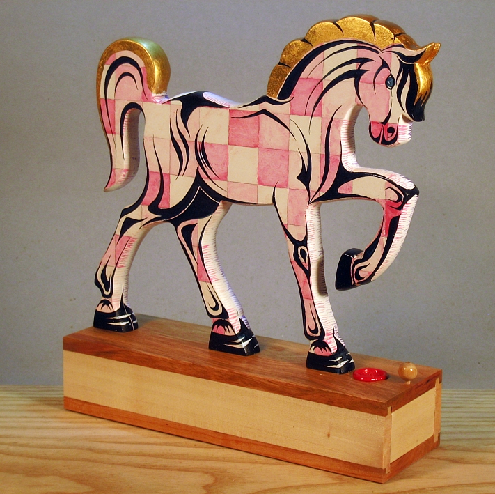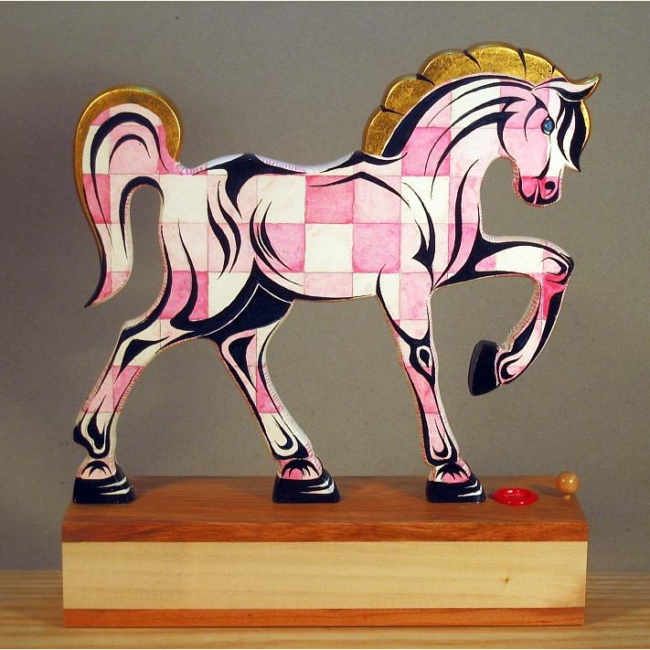 Giocattoli d'arte del maestro Sergio Milani - collezione "whim" , line"Profile 2". "Profile 2020.2-03" opera unica, ideata, costruita e dipinta in Italy, dimensioni cm 22 x 24 x 7 - peso Kg 0,650 - Opera realizzata completamente in legno con lavorazione manuale, il cavallino è posto su una base realizzata con legni pregiati avente la funzione di scatola porta gioie. Il tema decorativo, è realizzato con quadrettatura policroma diversa nei due lati e realizzato con tecnica ad acquerello tamponato, con sovrapposte pennellate monocromatiche a tempera eseguite a tratti, creando in sintesi le masse muscolari del cavallo, criniera e coda sono rifinite con foglia d'oro 23Kt. Tutte le opere sono accompagnate da un certificato di autenticità con foto, numero di catalogo e firma autografa dell'artista. Di questa opera originale verranno realizzate n°50 copie numerate ,non ripetibili, di eguali dimensioni ma con la parte decorata riprodotta fotograficamente.