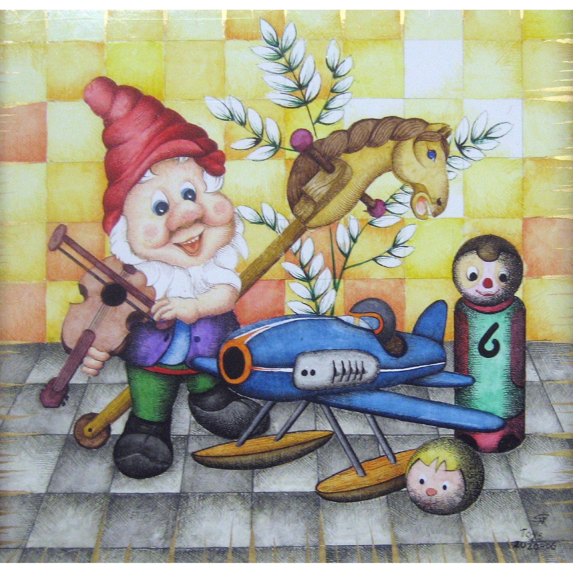 Giocattoli d'arte del maestro Sergio Milani - collezione "whim" , linea "Toys", Toys 2020-06- opera ideata, realizzata, dipinta in Italy - dimensioni cm 30 x30x2,5 - peso Kg 1,0 Toys è una linea di piccoli quadri realizzati su legno e incorniciati con un semplice listello di protezione. Il tema decorativo è "Composizioni di giocattoli", realizzato con colori ad acquerello variamente diluiti e tamponati con finiture in foglia d'oro 23kt L'opera è accompagnata da un certificato di autenticità, con dichiarazione di opera unica, foto, numero di catalogo e firma dell'artista. Per questa linea è prevista la tiratura di n° 50 copie numerate, non ripetibili, con dimensioni cm 23 x 23, compresa la cornice, la decorazione è riprodotta fedelmente con procedimento fotografico, ogni copia sarà munita di relativo certificato di autenticità.