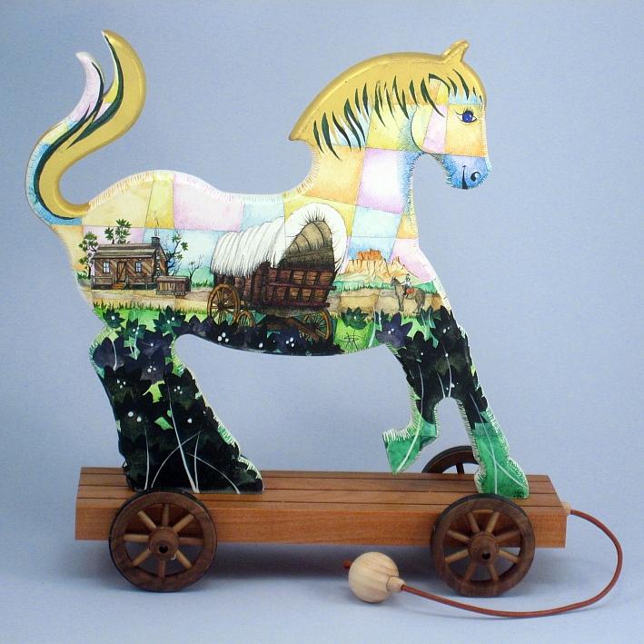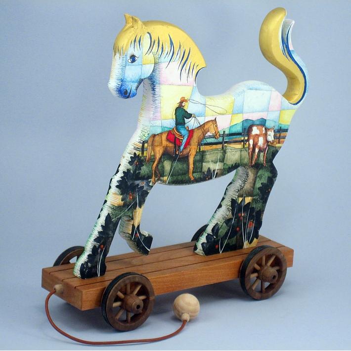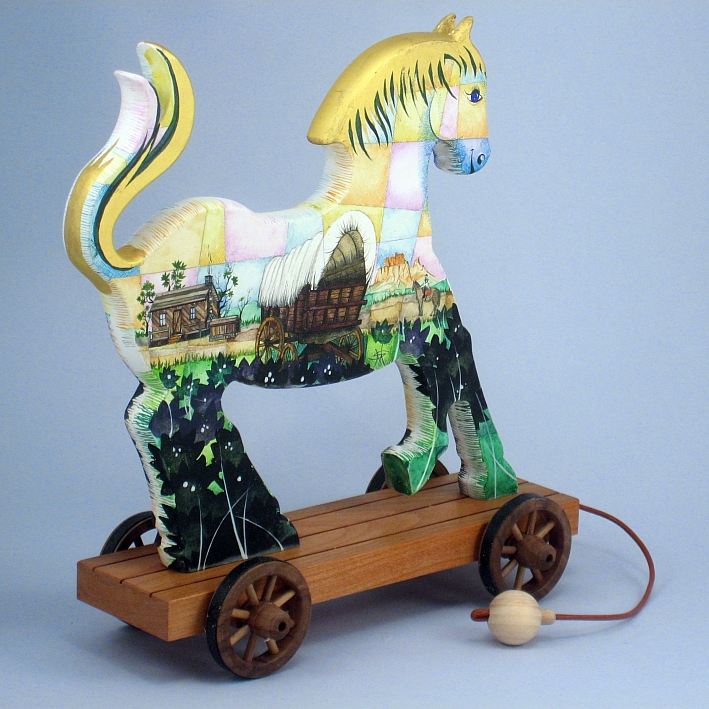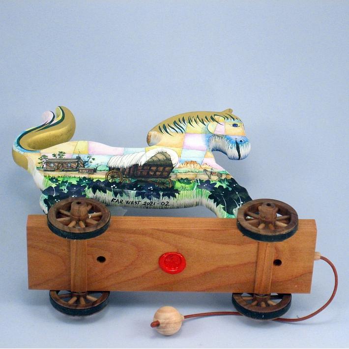 Giocattoli d'arte del maestro Sergio Milani - collezione "whim" , linea "Far West". Far West 2021-02, ideato, costruito e dipinto in Italy - dimensioni cm 22x22x8.5 peso Kg 0300. Il cavallino è realizzato in legno con lavorazione artigianale molto accurata, come supporto ha un carrello con ruote a raggi in legno pregiato. E' decorato con due scene, una per lato sul tema "ambiente paesaggistico del mitico e storico Far West", la tecnica usata è il tradizionale acquerello tamponato con finiture in foglia d'oro 22Kt. Opera unica siglata a mano e accompagnata da un certificato di autentica con foto, numero di catalogo e firma autografa dell'artista.