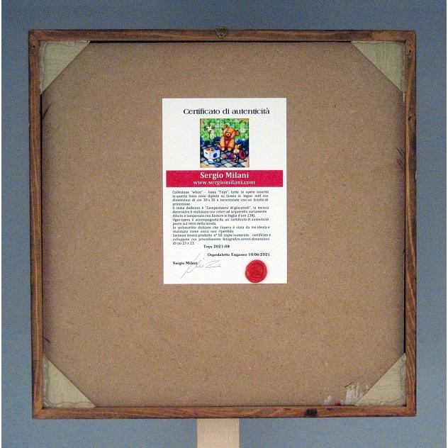 L'opera è accompagnata da un certificato di autenticità, con dichiarazione di opera unica, foto, numero di catalogo e firma dell'artista.