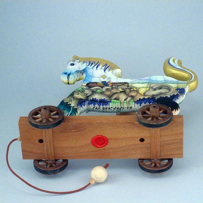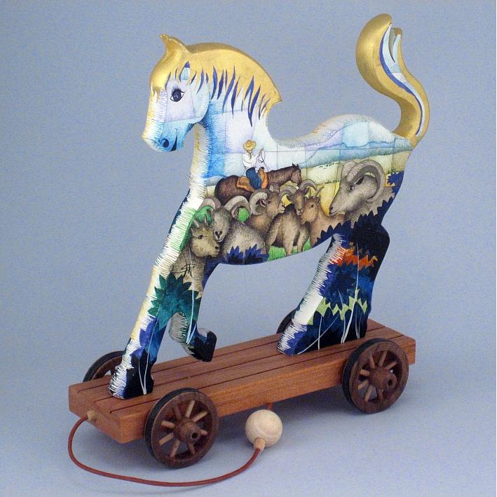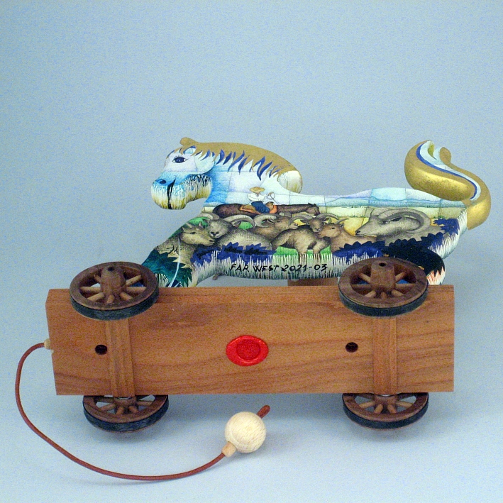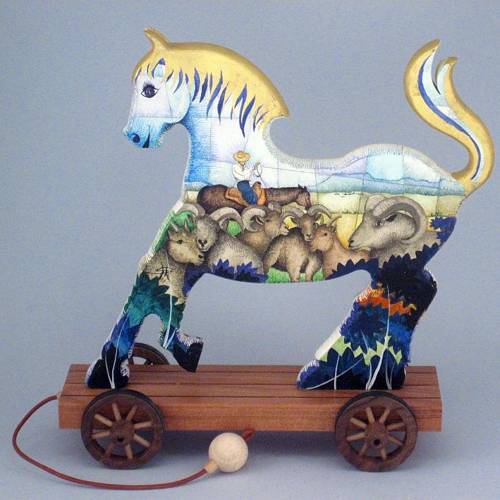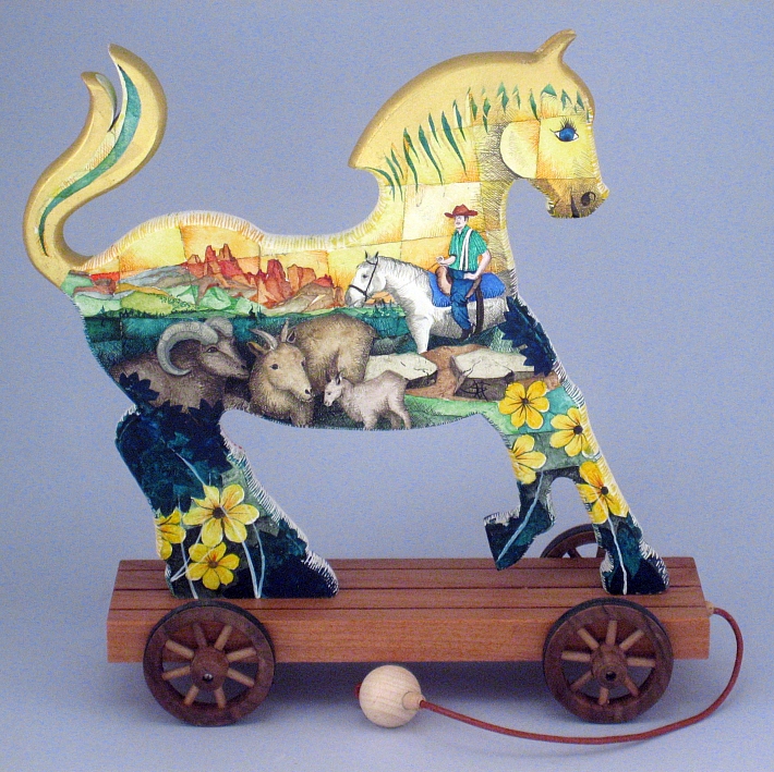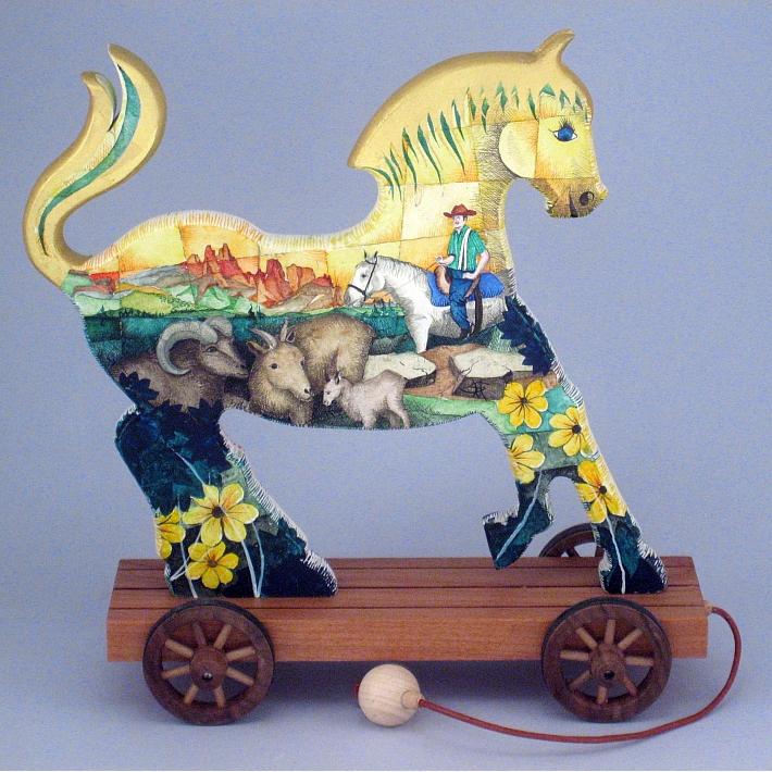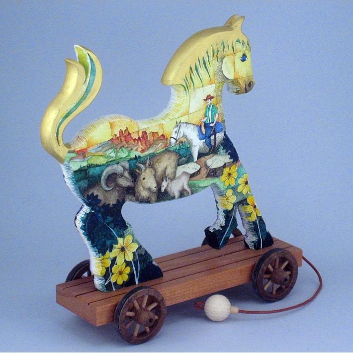 Giocattoli d'arte del maestro Sergio Milani - collezione "whim" , linea "Far West". Far West 2021-03, ideato, costruito e dipinto in Italy - dimensioni cm 22x22x8.5 peso Kg 0300. Il cavallino è realizzato in legno con lavorazione artigianale molto accurata, come supporto ha un carrello con ruote a raggi in legno pregiato. E' decorato con due scene, una per lato sul tema "ambiente paesaggistico del mitico e storico Far West", la tecnica usata è il tradizionale acquerello tamponato con finiture in foglia d'oro 22Kt. Opera unica siglata a mano e accompagnata da un certificato