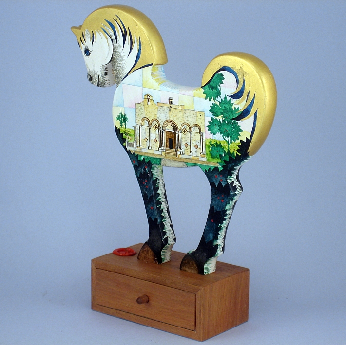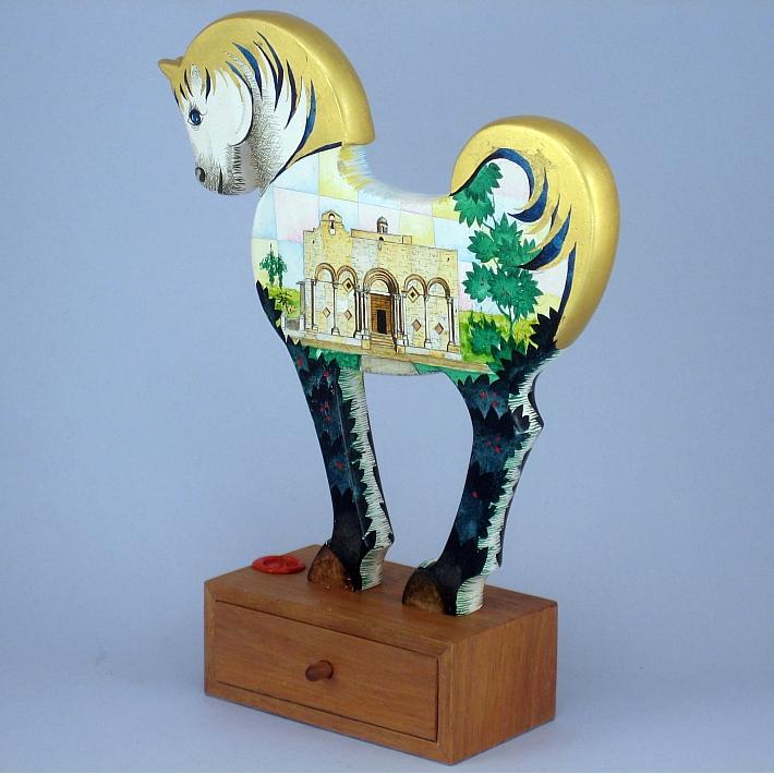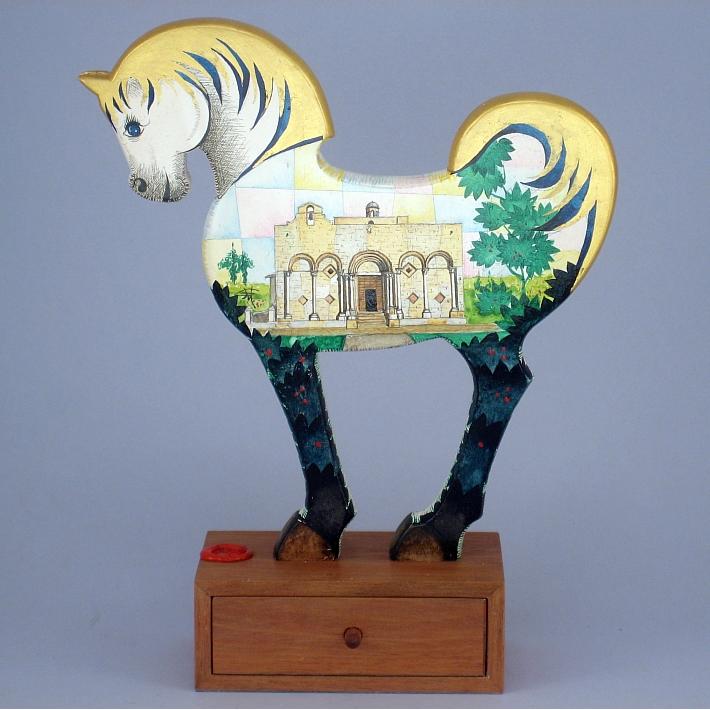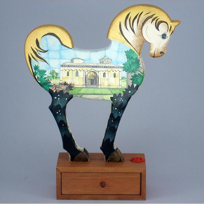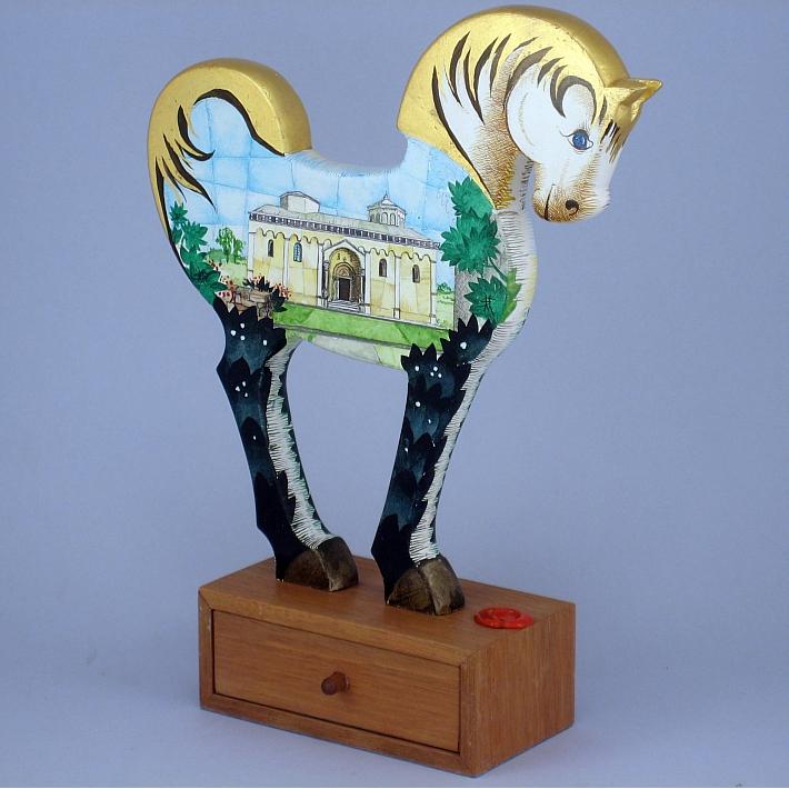 Giocattoli d'arte del maestro Sergio Milani - collezione "whim" , linea "Souvenir". Opere dedicatea ricordo di luoghi e monumenti storicamente interessanti. "Souvenir 2021-01 Manfredonia" dimensioni cm 18,5 x 24 x 6, peso kg 0,300. Il cavallino è realizzato in legno mdf, la base realizzata in legno pregiato ha la funzione di bauletto con un piccolo cassettino. E' costruito con lavorazione manuale e decorato con tecnica ad acquerello variamente diluito e tamponato con finiture in foglia d'oro 22Kt. Il tema decorativo riservato alla linea è "Monumenti e paesaggi caratteristici". La presente opera interpreta da un lato la basilica di S. Maria Maggiore dall'altro il convento di S. Leonardo. Opera unica, certificata con foto, numero di catalogo e firma dell'artista.