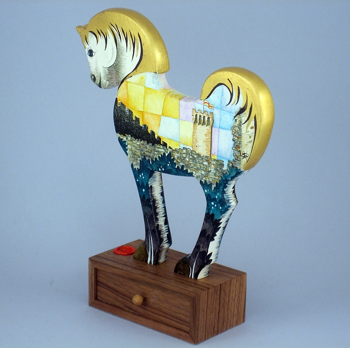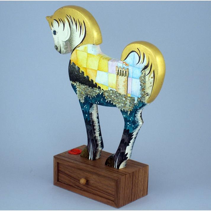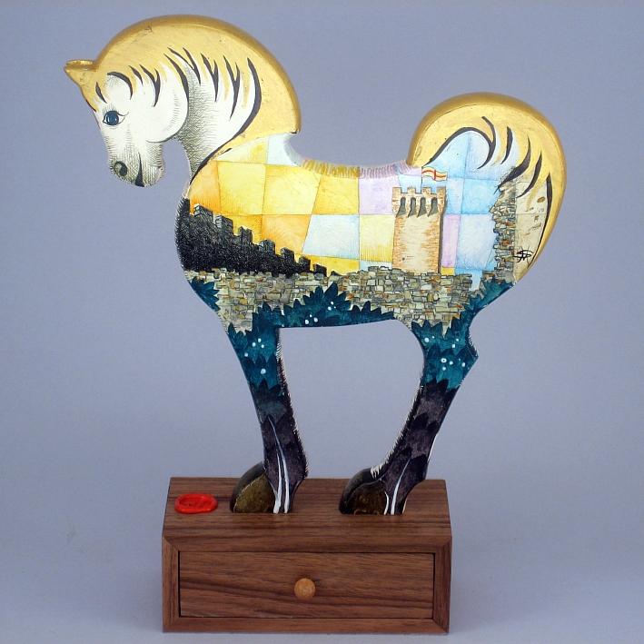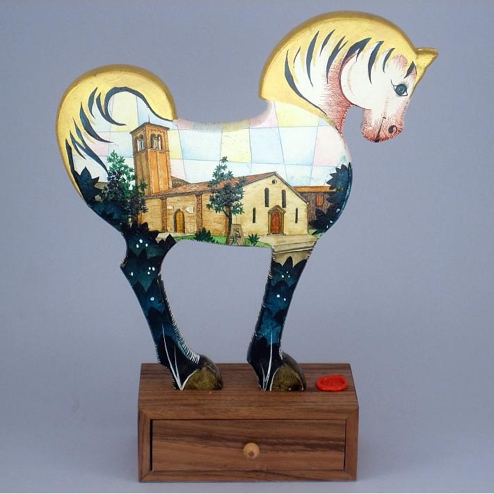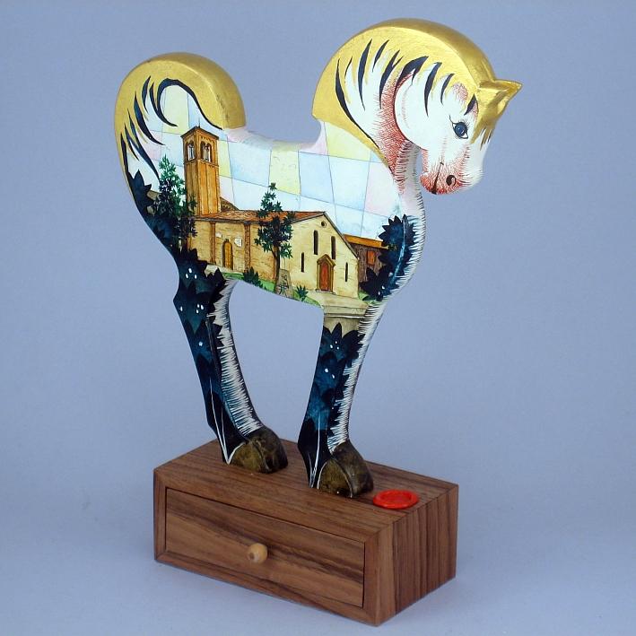 Giocattoli d'arte del maestro Sergio Milani - collezione "whim" , linea "Souvenir". Opere dedicatea ricordo di luoghi e monumenti storicamente interessanti. "Souvenir 2021-02 Este" dimensioni cm 18,5 x 24 x 6, peso kg 0,300. Il cavallino è realizzato in legno mdf, la base realizzata in legno pregiato ha la funzione di bauletto con un piccolo cassettino. E' costruito con lavorazione manuale e decorato con tecnica ad acquerello variamente diluito e tamponato con finiture in foglia d'oro 22Kt. Il tema decorativo riservato alla linea è "Monumenti e paesaggi caratteristici". La presente opera interpreta da un lato la torre del castello, dall'altro la chiesa di S. Martino. Opera unica, certificata con foto, numero di catalogo e firma dell'artista.