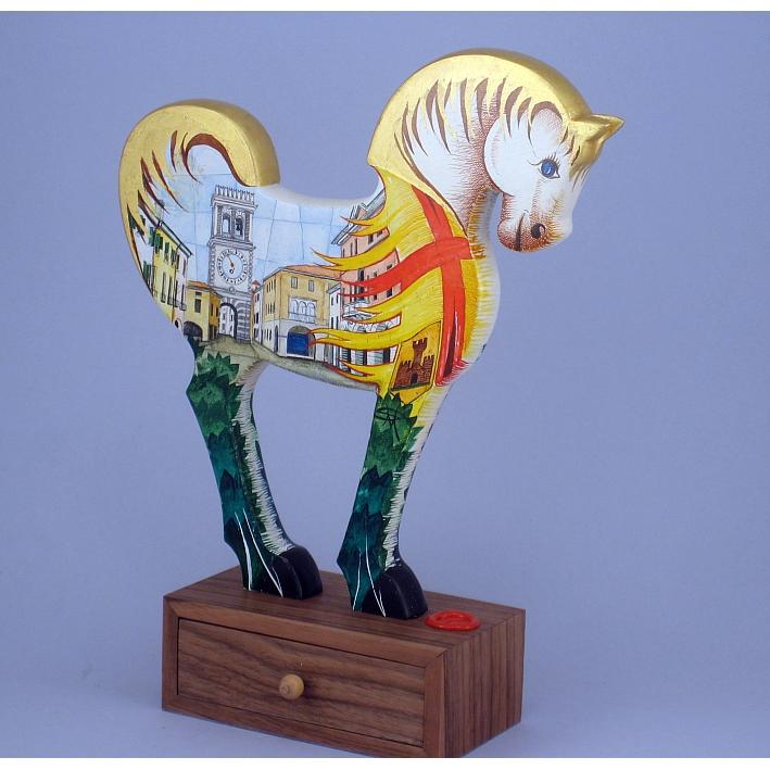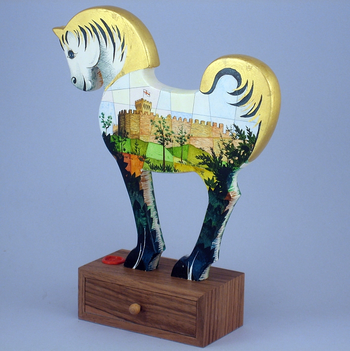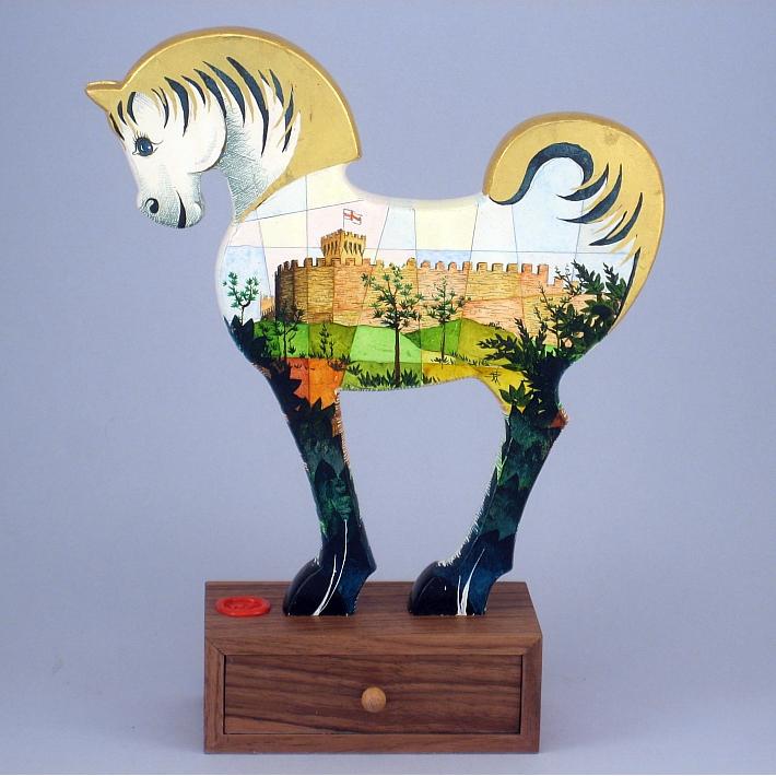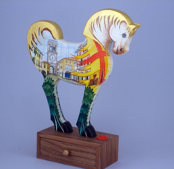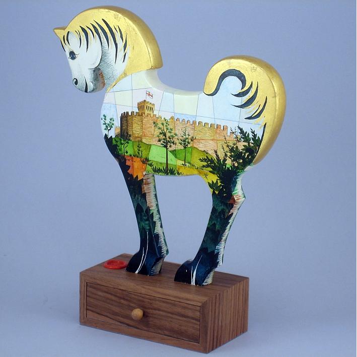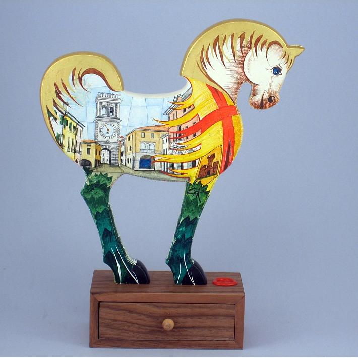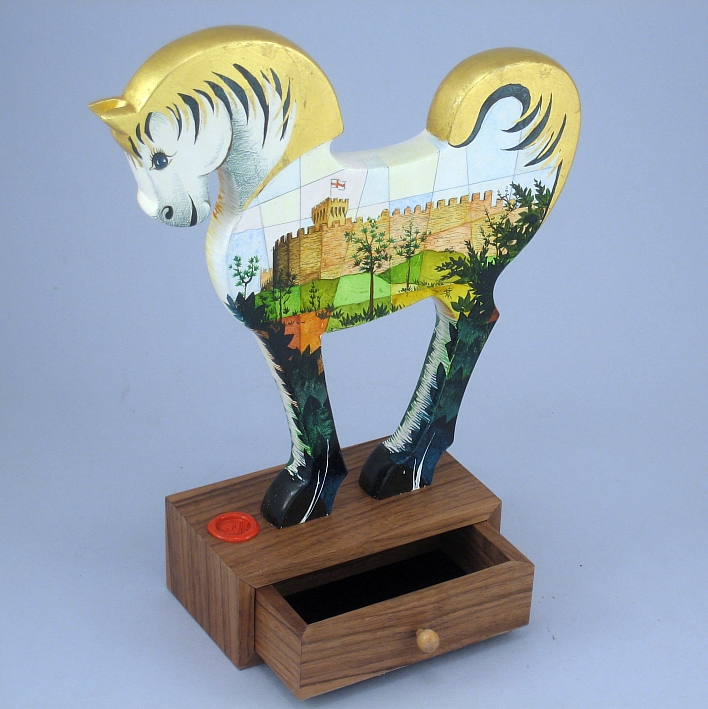 Giocattoli d'arte del maestro Sergio Milani - collezione "whim" , linea "Souvenir". Opere dedicatea ricordo di luoghi e monumenti storicamente interessanti. "Souvenir 2021-03 Este2" dimensioni cm 18,5 x 24 x 6, peso kg 0,300. Il cavallino è realizzato in legno mdf, la base realizzata in legno pregiato ha la funzione di bauletto con un piccolo cassettino. E' costruito con lavorazione manuale e decorato con tecnica ad acquerello variamente diluito e tamponato con finiture in foglia d'oro 22Kt. Il tema decorativo riservato alla linea è "Monumenti e paesaggi caratteristici". La presente opera interpreta da un lato il castello visto da nord, dall'altro la Torre civica. Opera unica, certificata con foto, numero di catalogo e firma dell'artista.